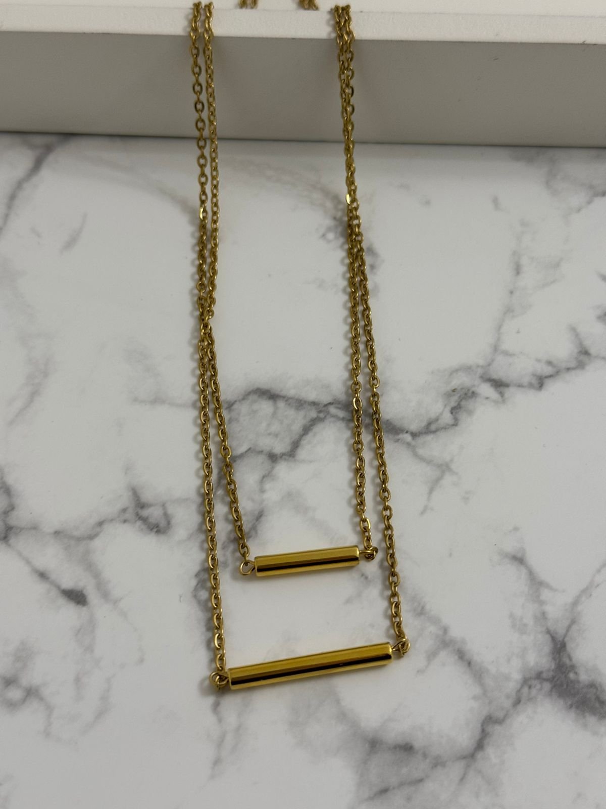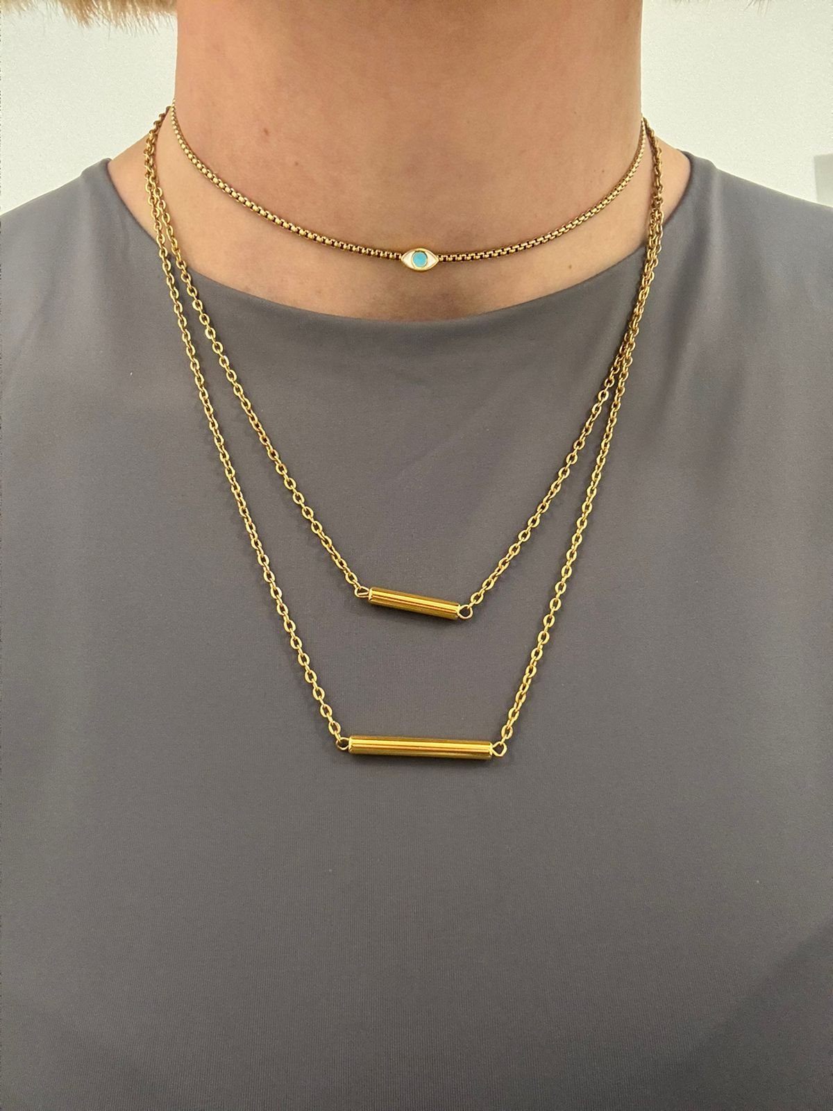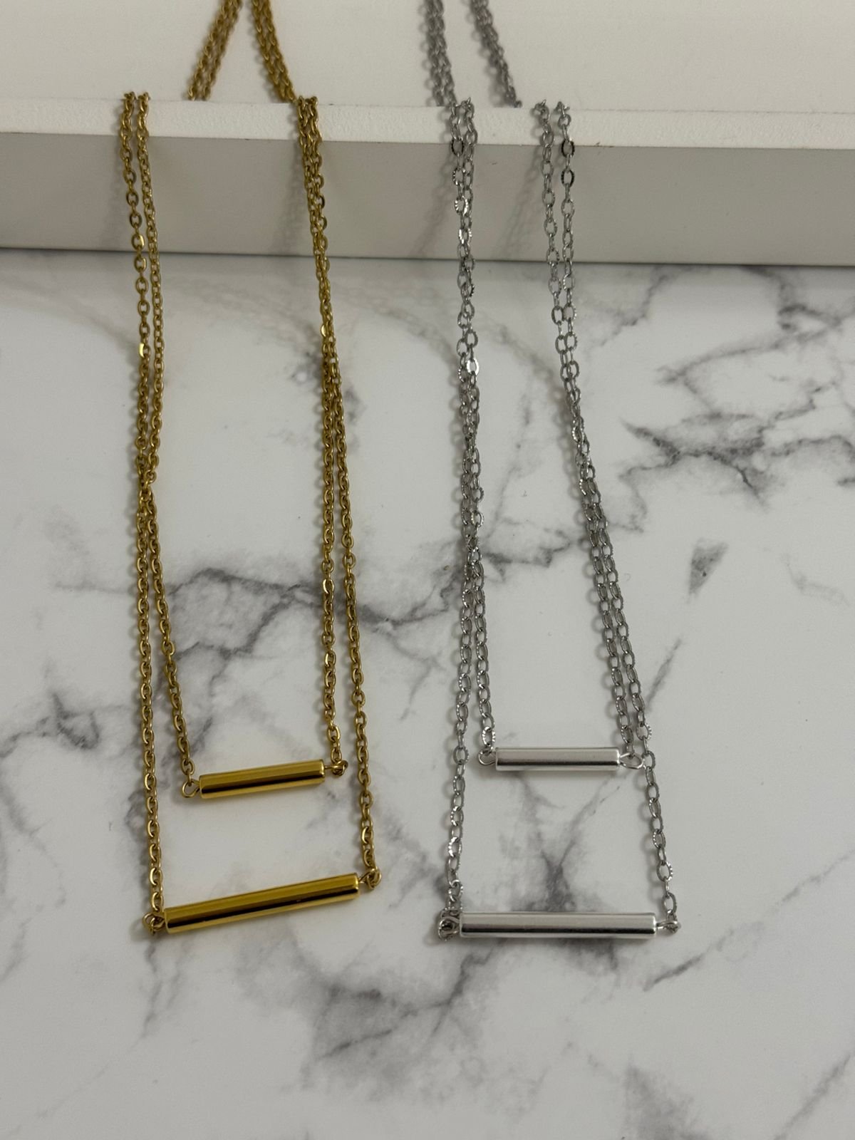 Διπλό κολιέ σε χρυσό και ασημί, σχεδιασμένο για να συνδυάζει τη διαχρονική κομψότητα με τη σύγχρονη minimal αισθητική. Οι διακριτικές μπάρες αγκαλιάζουν τον λαιμό με καθαρές γραμμές, δημιουργώντας ένα ισορροπημένο layering effect που τραβά τα βλέμματα χωρίς υπερβολές.