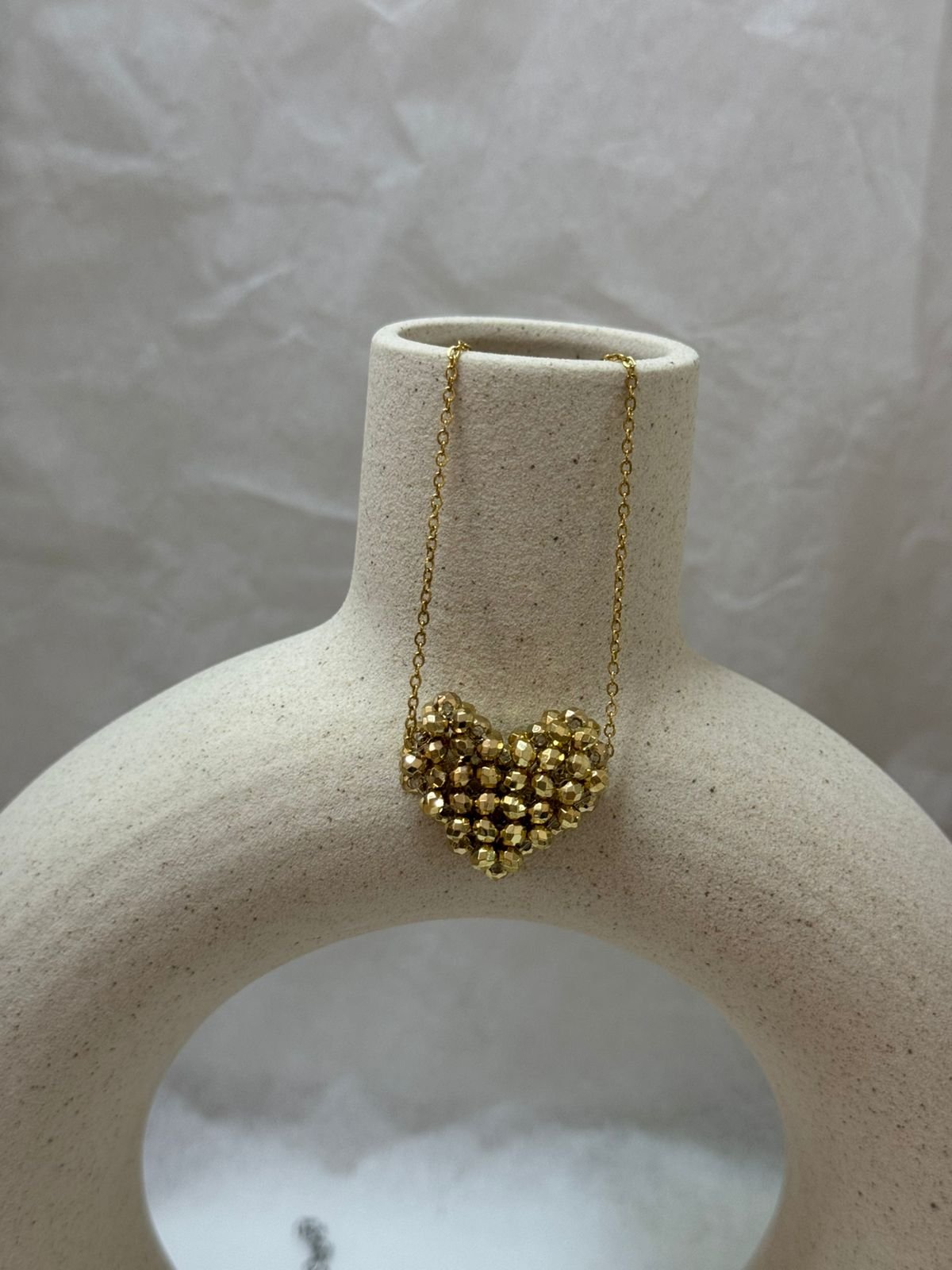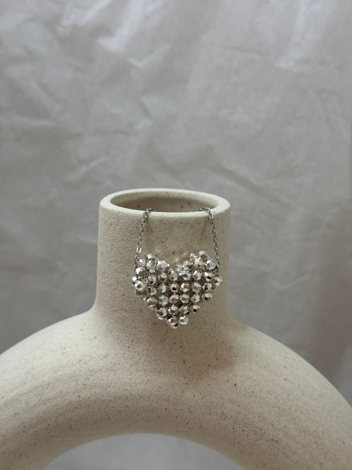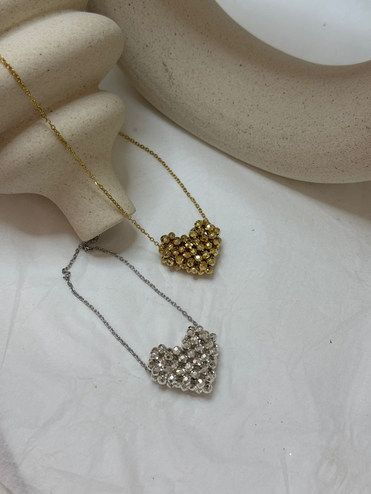 Ένα ρομαντικό κολιέ που ξεχωρίζει για την ανάλαφρη λάμψη του. Η καρδιά, φτιαγμένη εξ ολοκλήρου από γυάλινες χάντρες, αντανακλά το φως με διακριτική κομψότητα και δίνει μια χειροποίητη, αυθεντική αίσθηση. Ιδανικό για να φορεθεί μόνο του ή σε layering, προσθέτει μια γλυκιά πινελιά σε κάθε εμφάνιση — από το πρωί έως το βράδυ.