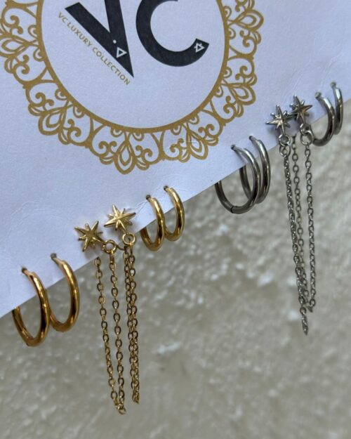 Η διαχρονική βάση του κρικιού συναντά τις κυματιστές βέργες που χαρίζουν ανάλαφρη ροή, ενώ η λεπτή αλυσίδα με το στρογγυλό μοτίβο προσθέτει παιχνιδιάρικη λάμψη σε κάθε σου βήμα. Το αποτέλεσμα είναι δυναμικό αλλά κομψό, ιδανικό για γυναίκες που αγαπούν τις ιδιαίτερες λεπτομέρειες.