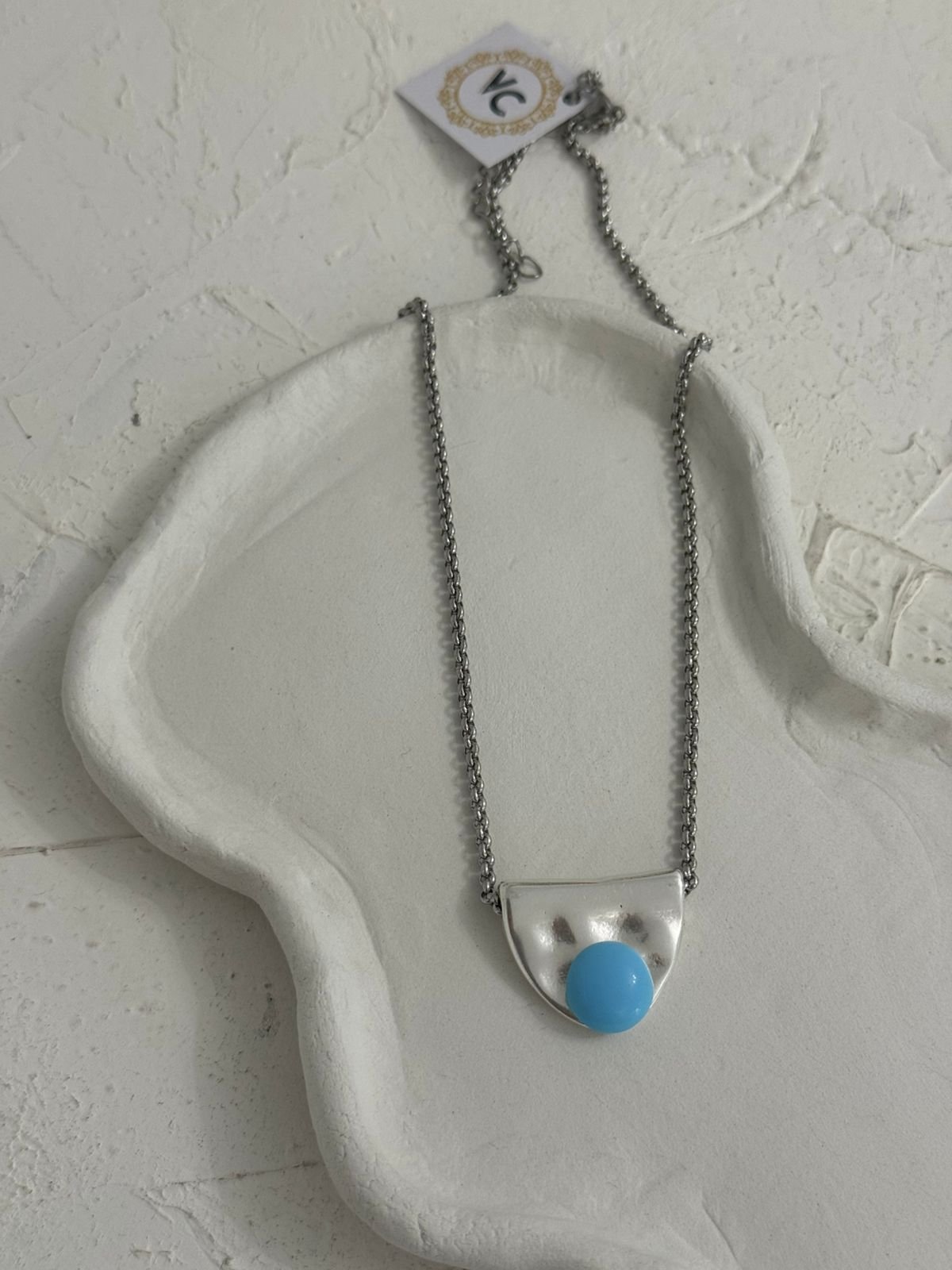 Ασημένιο minimal κολιέ με μοντέρνα γεωμετρική αισθητική, ιδανικό για κομψές καθημερινές αλλά και πιο ιδιαίτερες εμφανίσεις. Η διακριτική, γυαλιστερή μεταλλική βάση αγκαλιάζει μια εντυπωσιακή γαλάζια πέτρα, χαρίζοντας φρεσκάδα και καλοκαιρινή αύρα σε κάθε look.