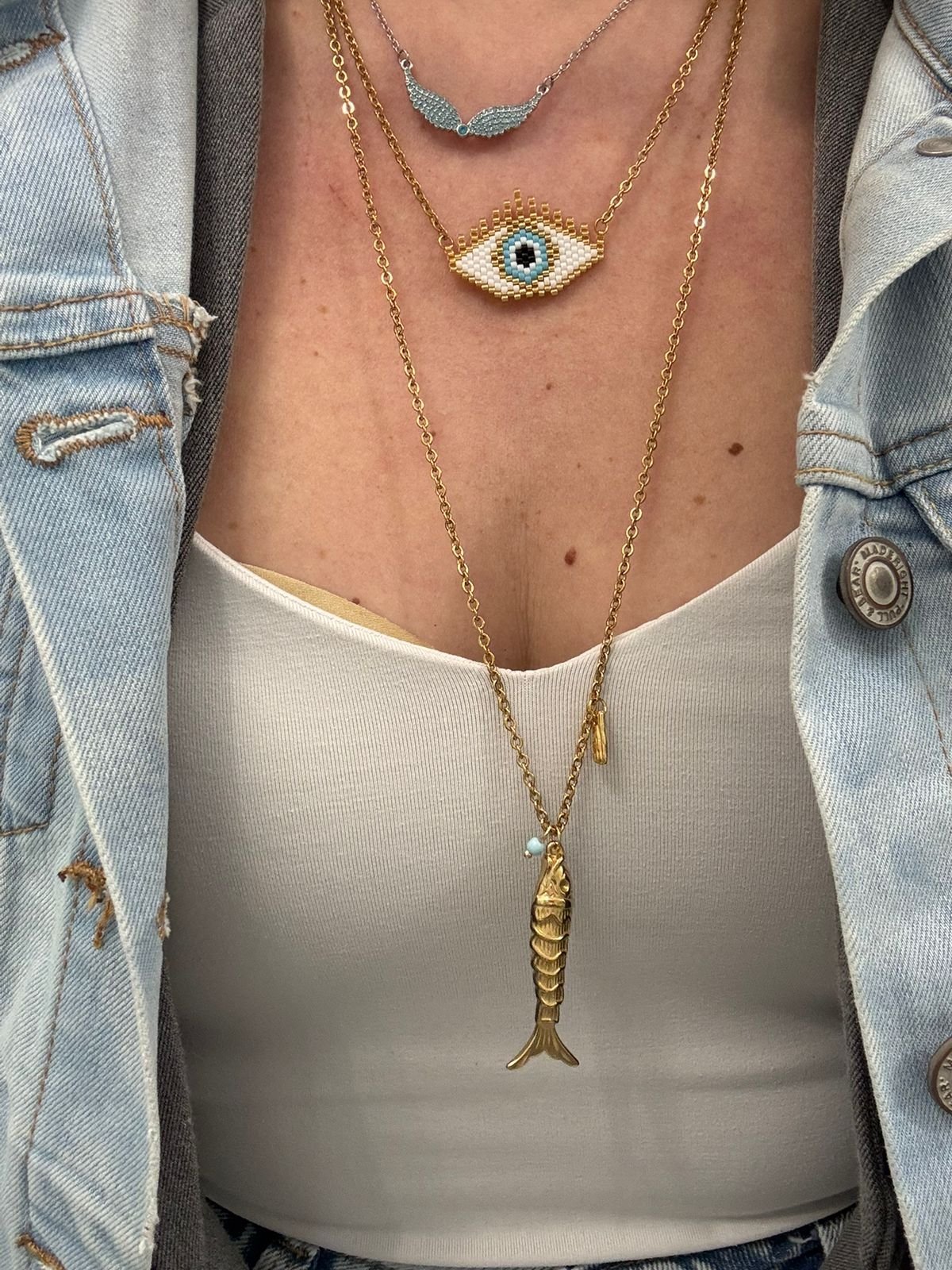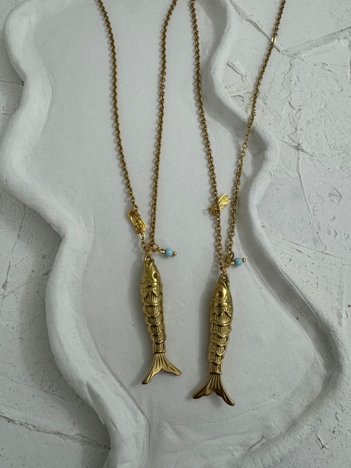 Ένα κομψό και ιδιαίτερο κόσμημα που αποπνέει καλοκαιρινή αύρα και διακριτική πολυτέλεια. Το χρυσό κολιέ με το διακοσμητικό ψάρι, εμπνευσμένο από τη θάλασσα, συνδυάζει λεπτομέρεια και συμβολισμό, ενώ η μικρή γαλάζια πέτρα προσθέτει μια ανάλαφρη πινελιά φρεσκάδας.