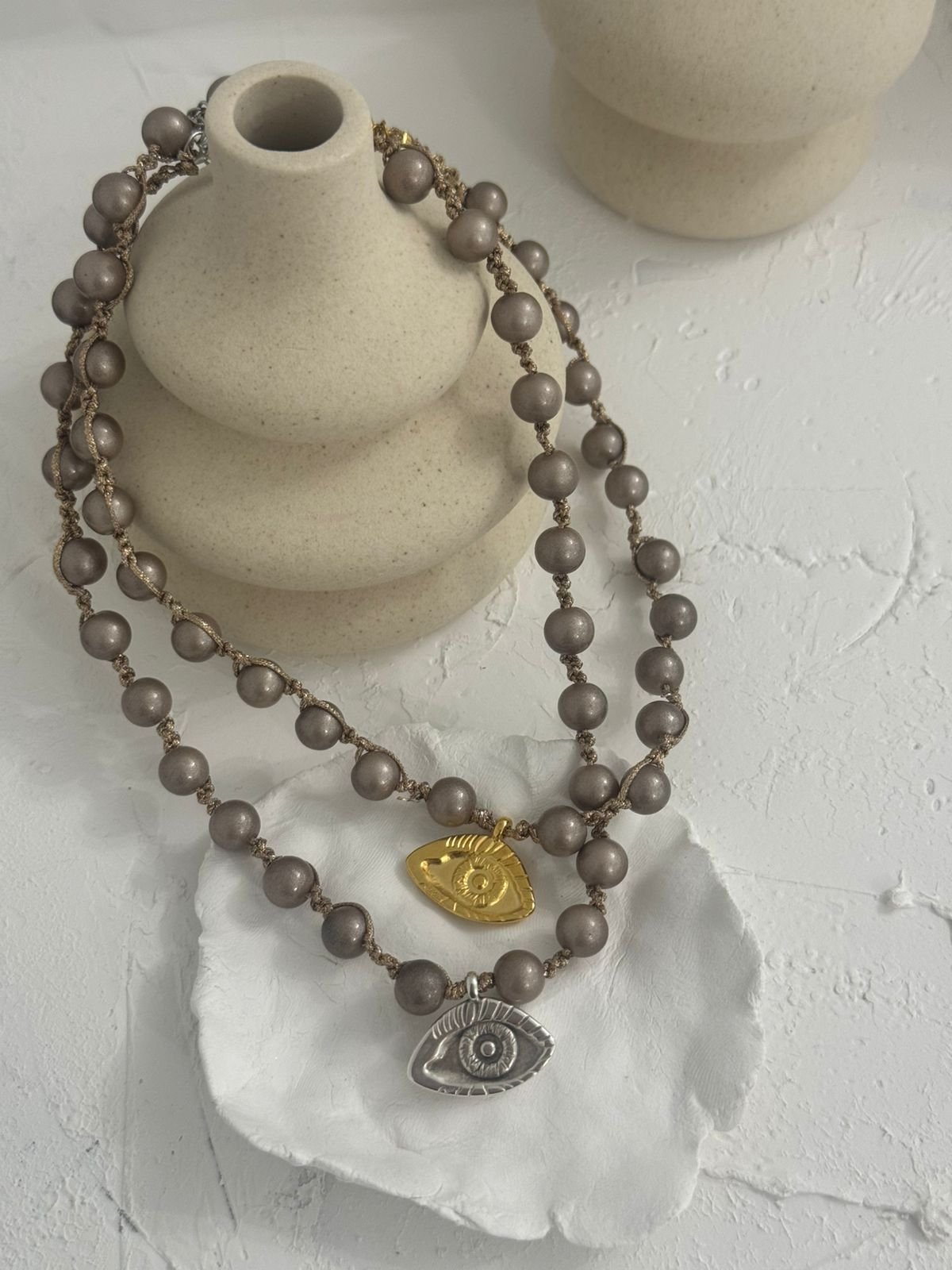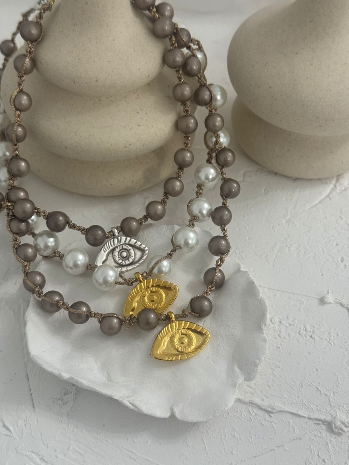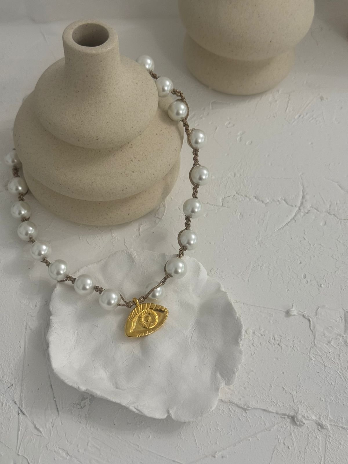 Κολιέ με πέρλες πλεχτο και ορειχαλκινα επιχρυσωμενα/ επαργυρωμένο στοιχεία.