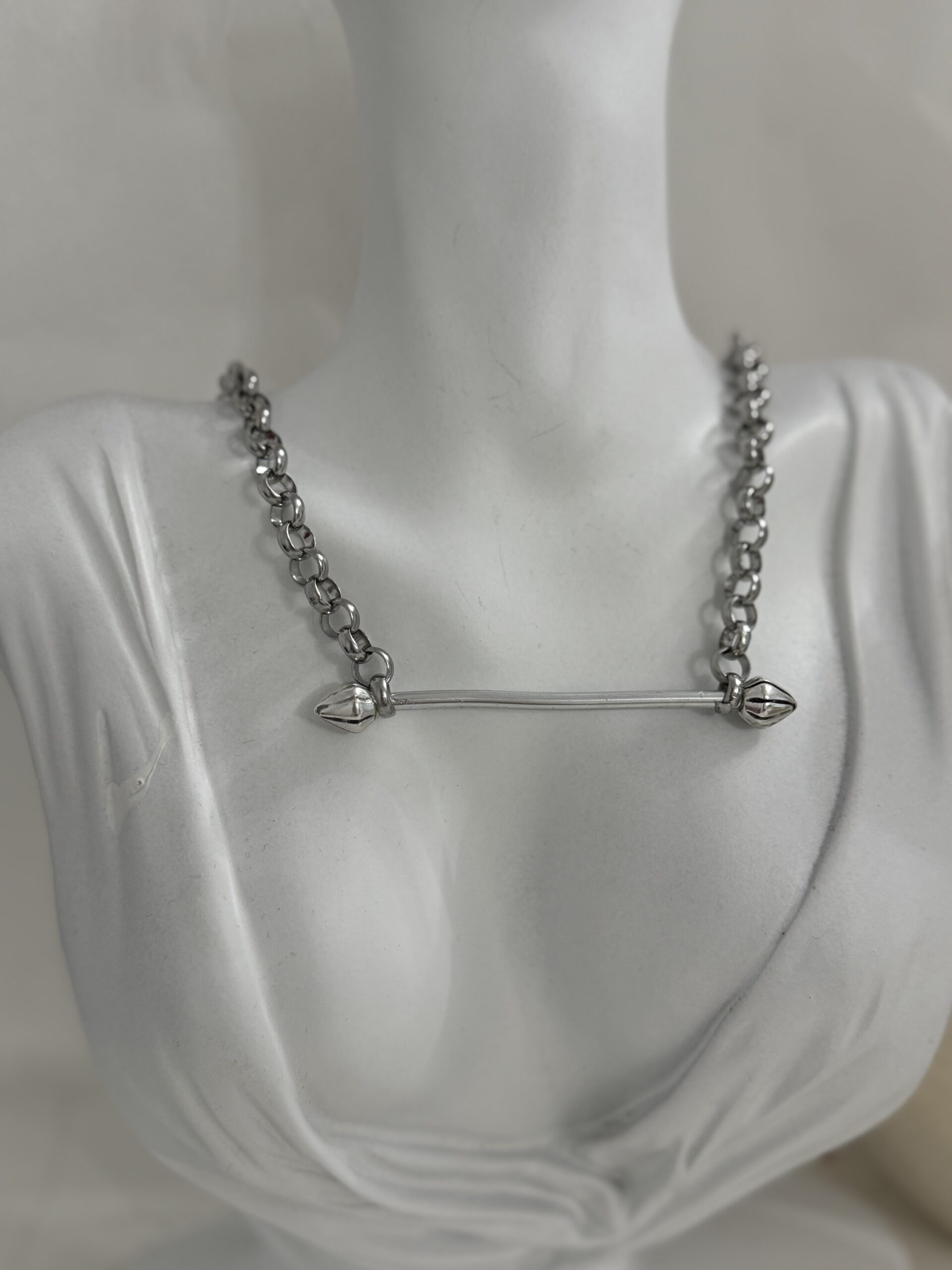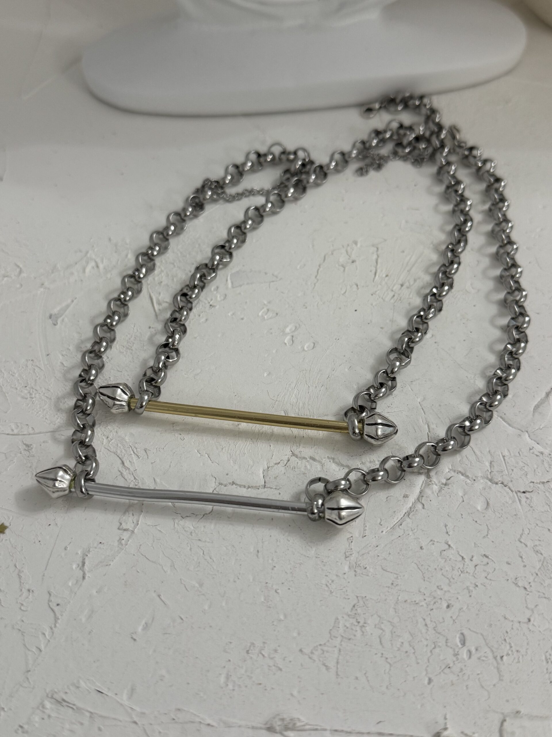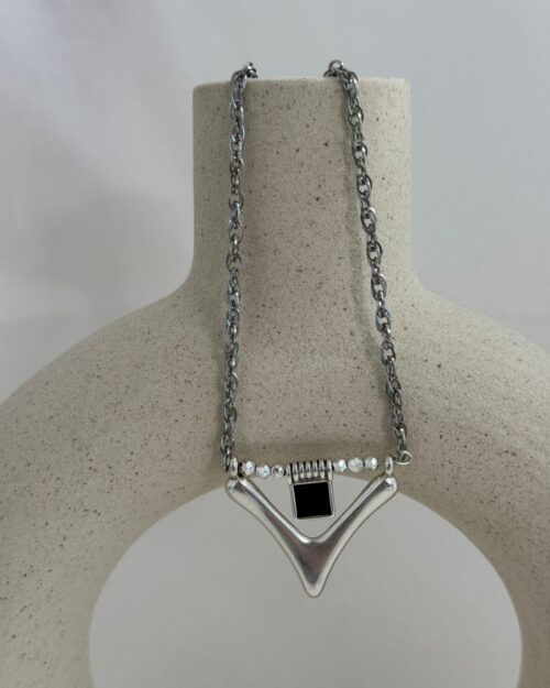 Κολιέ με ατσάλινη αλυσίδα και χειροποίητη μπάρα στο κέντρο, σύμβολο ισορροπίας και διακριτικής πολυτέλειας. Ένα διαχρονικό κόσμημα που φοριέται από το πρωί μέχρι το βράδυ.