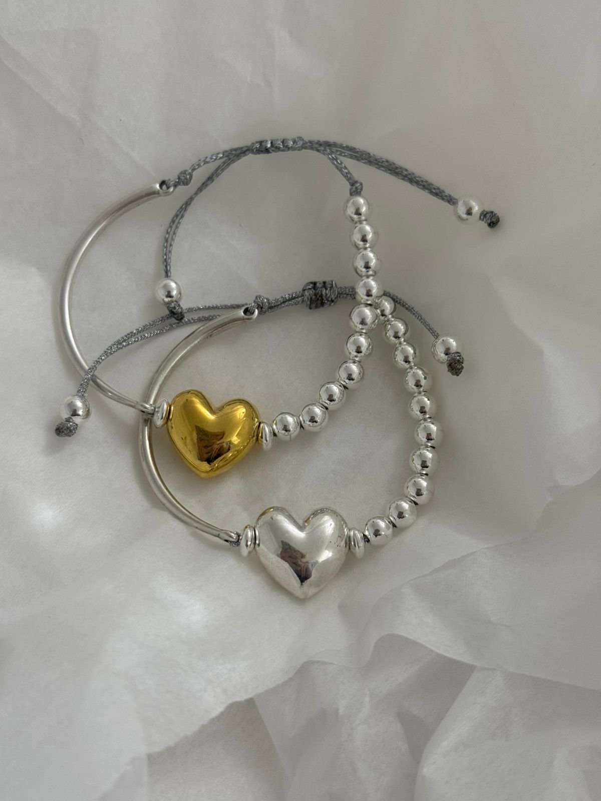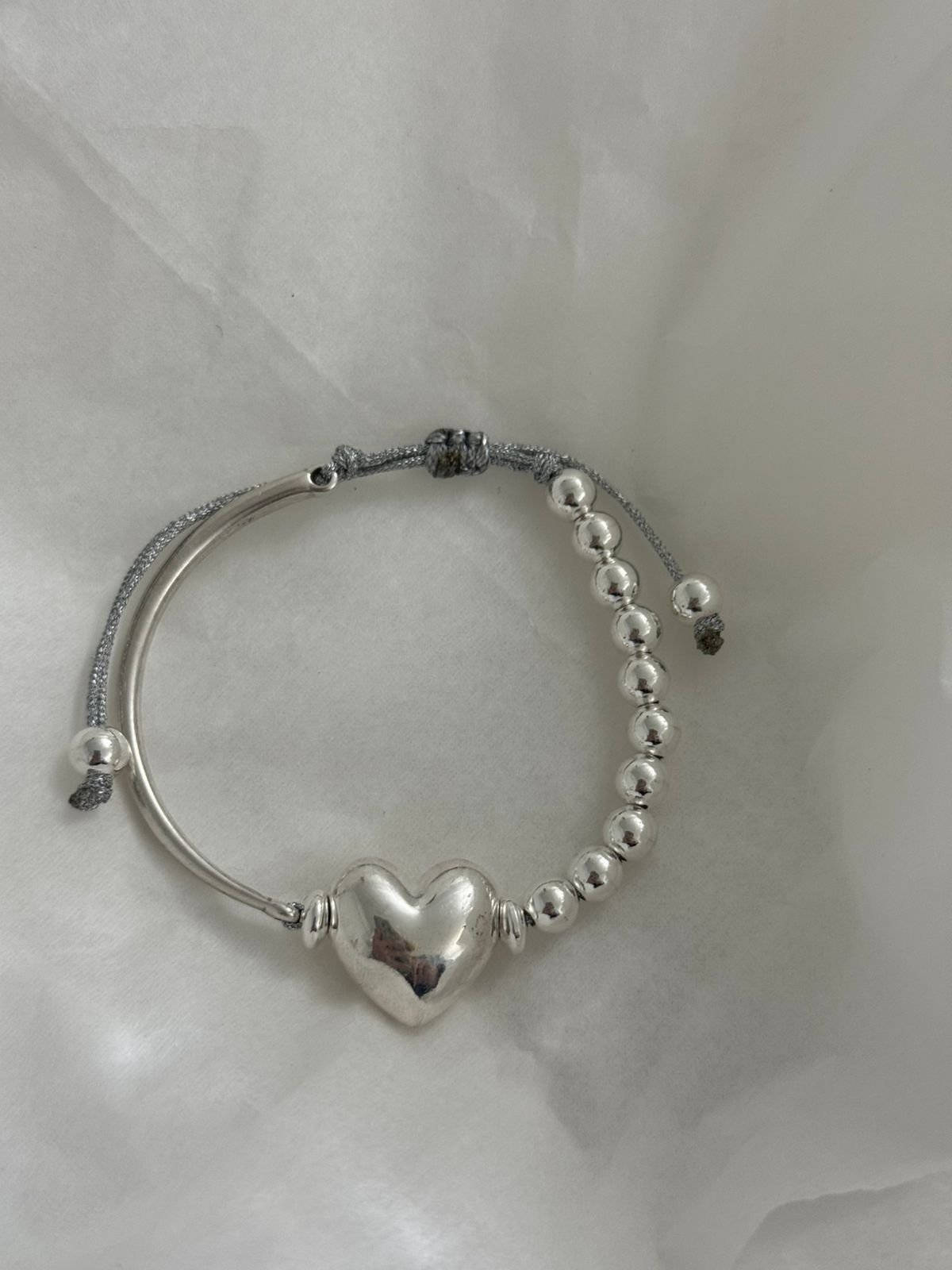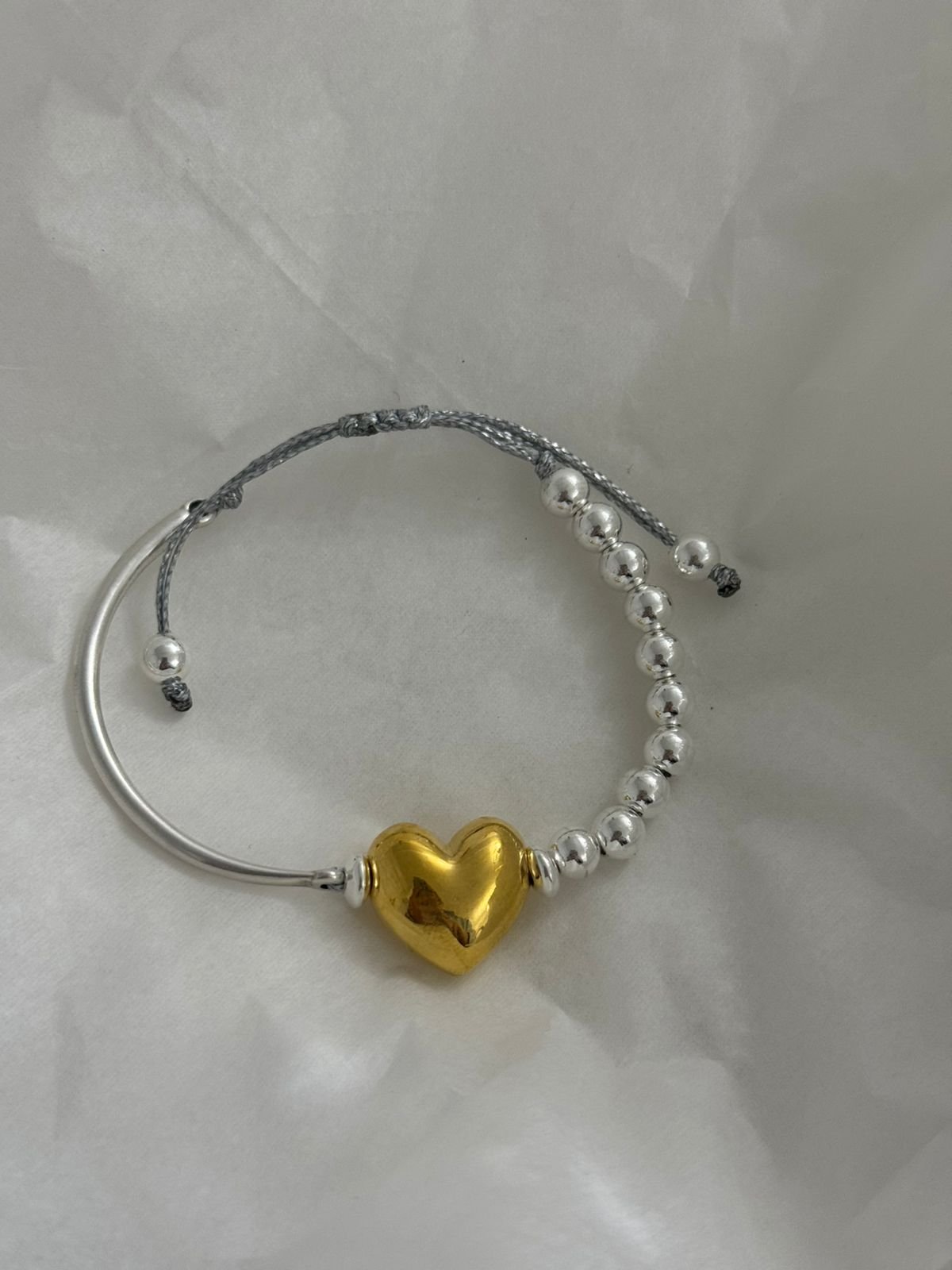 Ένα εκλεπτυσμένο σχέδιο που αποτυπώνει τη σύγχρονη πολυτέλεια. Η αντίθεση ανάμεσα στις φίνα χάντρες και τη μεταλλική βέργα κορυφώνεται με μια διακριτική καρδιά στο κέντρο — σύμβολο κομψότητας με χαρακτήρα.