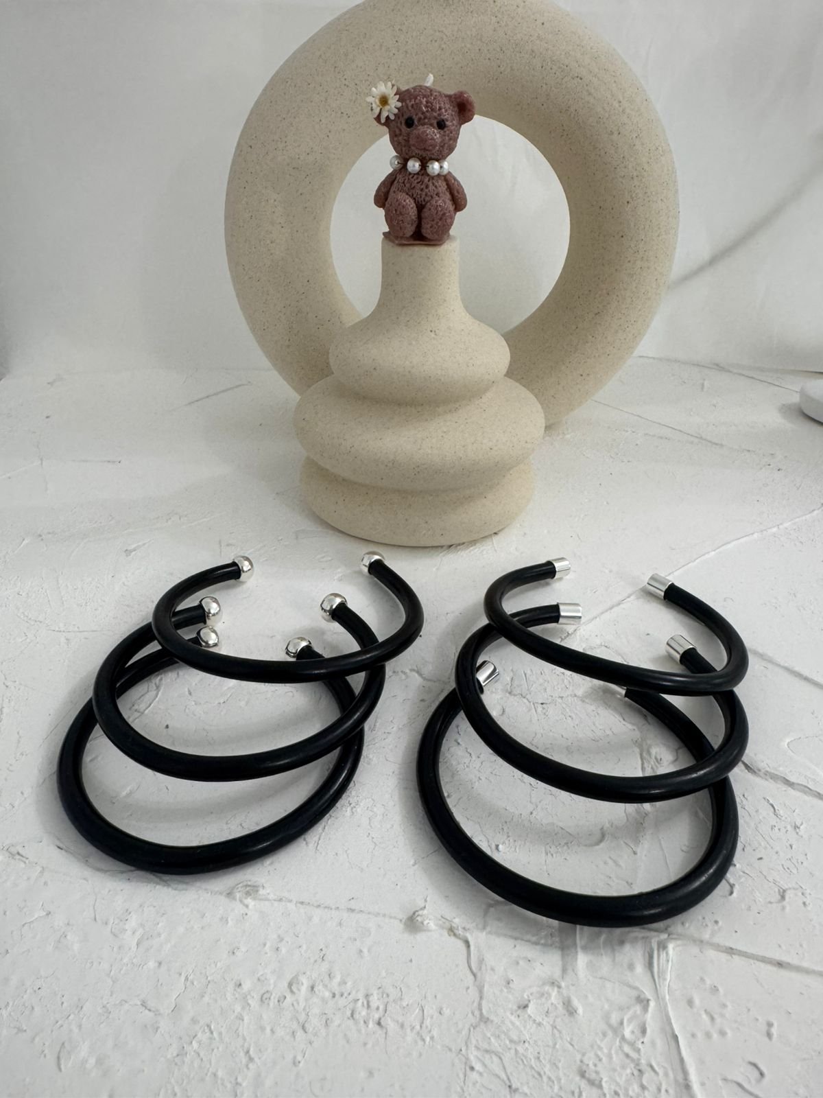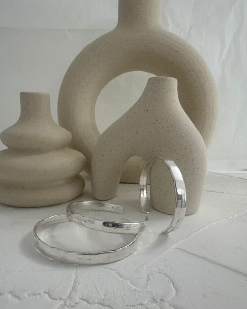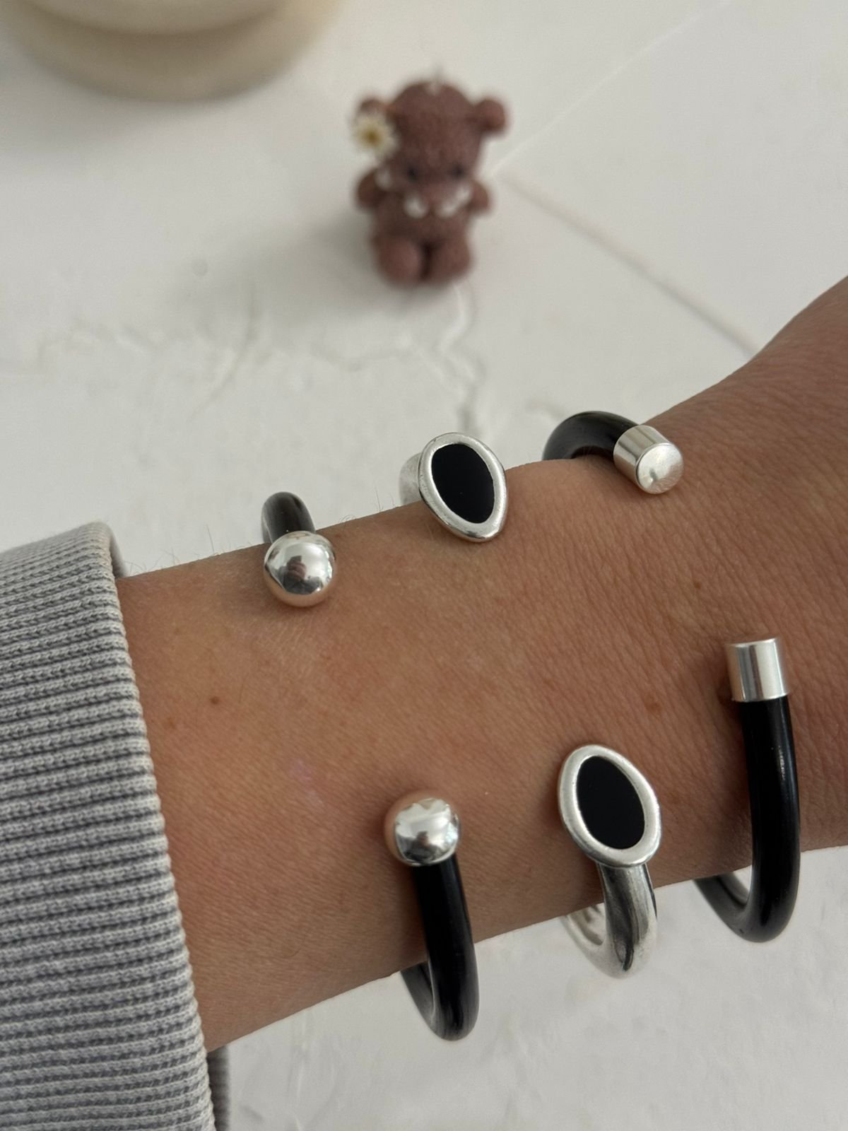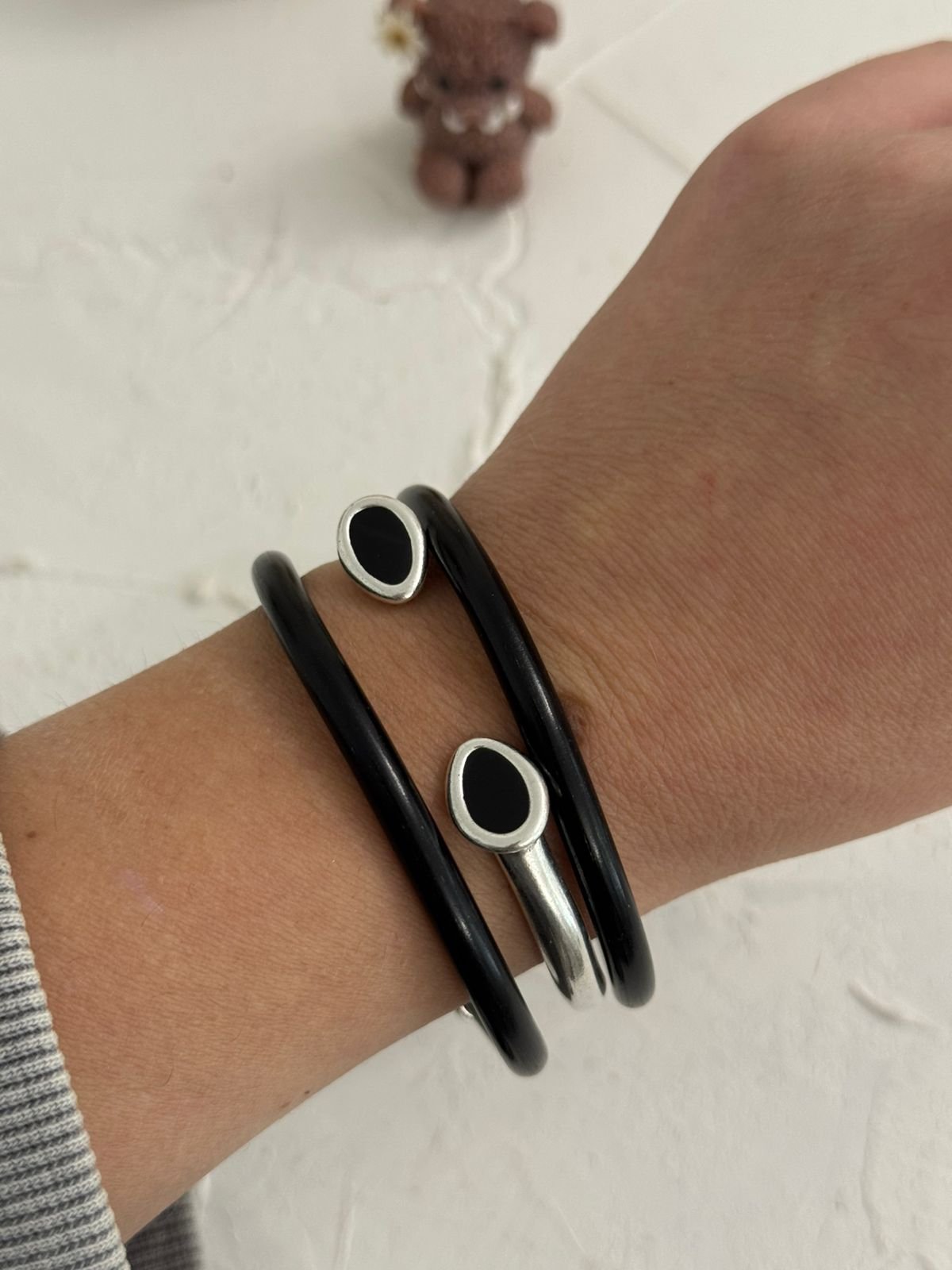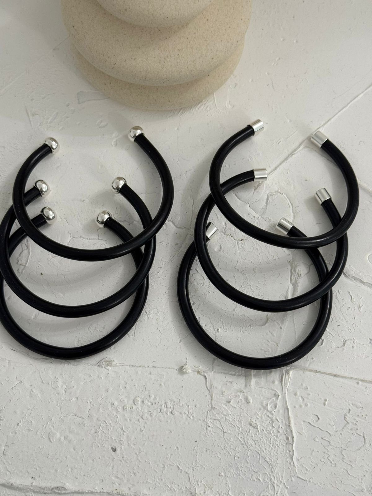 Βέργες χειροποίητες από αλουμίνιο, σε κομψό μαύρο ματ φινίρισμα, με ασημένιες τάπες που χαρίζουν διακριτική λάμψη και πολυτελή αντίθεση. Καθεμία δημιουργημένη με προσοχή στη λεπτομέρεια, συνδυάζει μίνιμαλ αισθητική με εκλεπτυσμένο χαρακτήρα — ένα statement κομμάτι που ξεχωρίζει για την απλότητα και τη δυναμική του παρουσία.