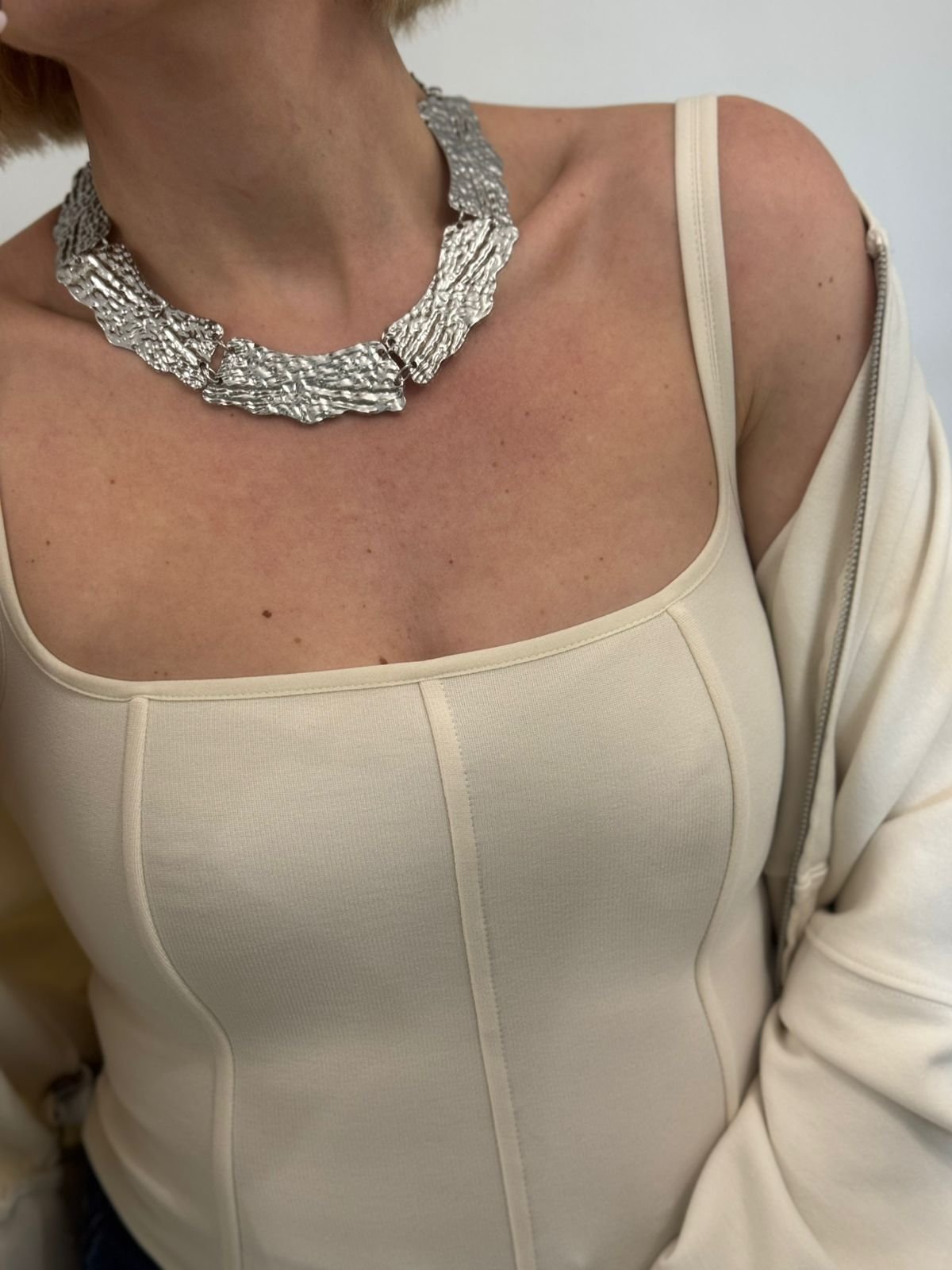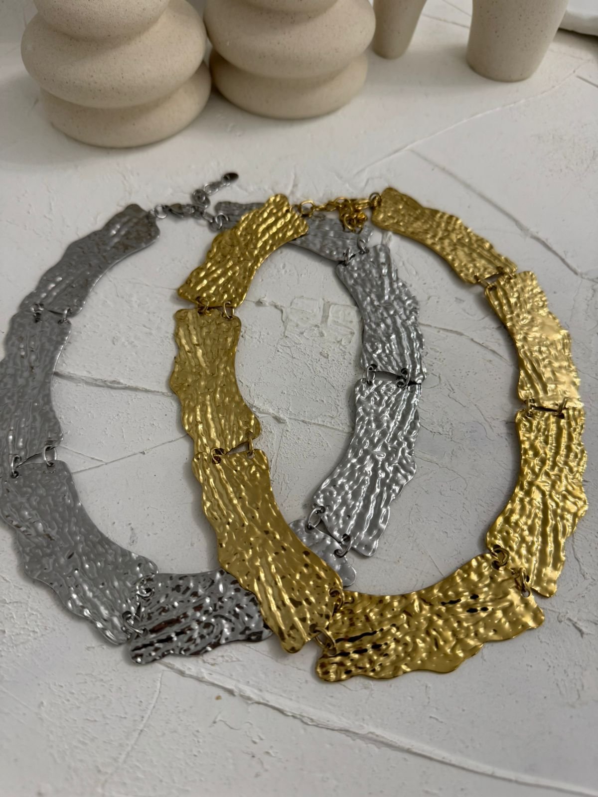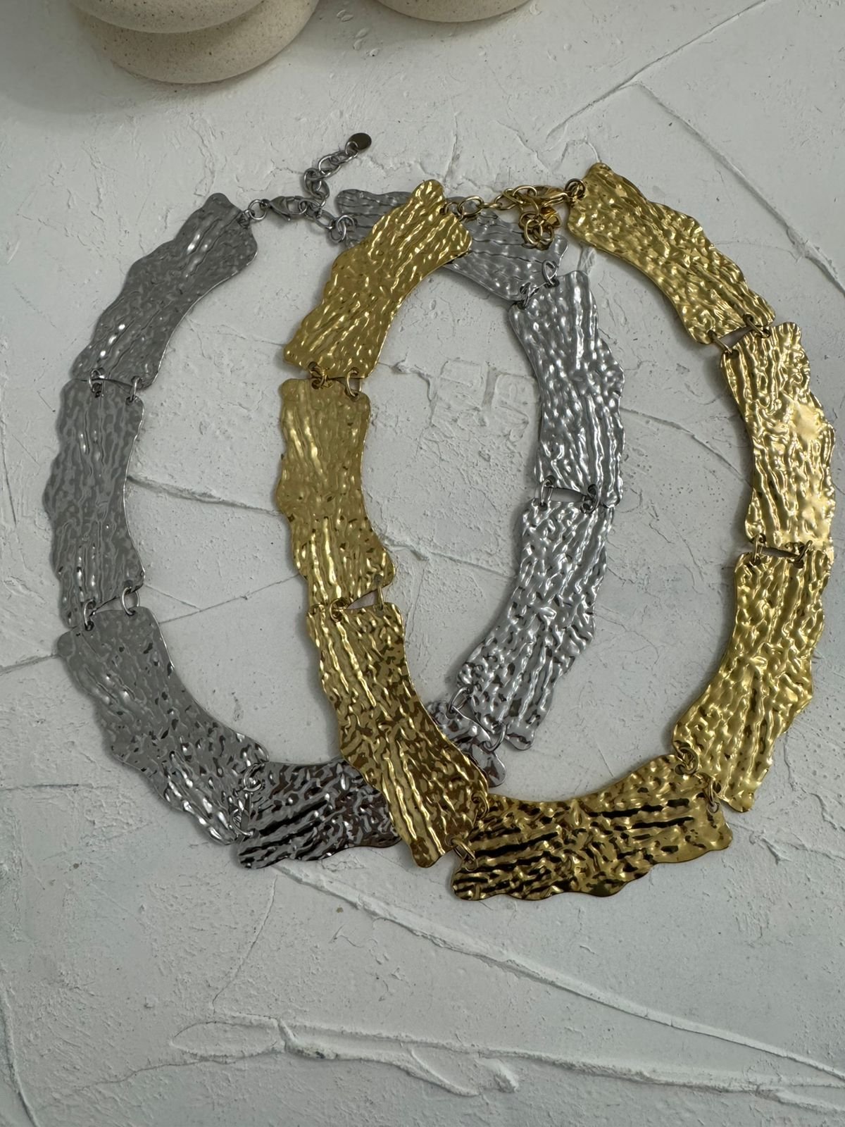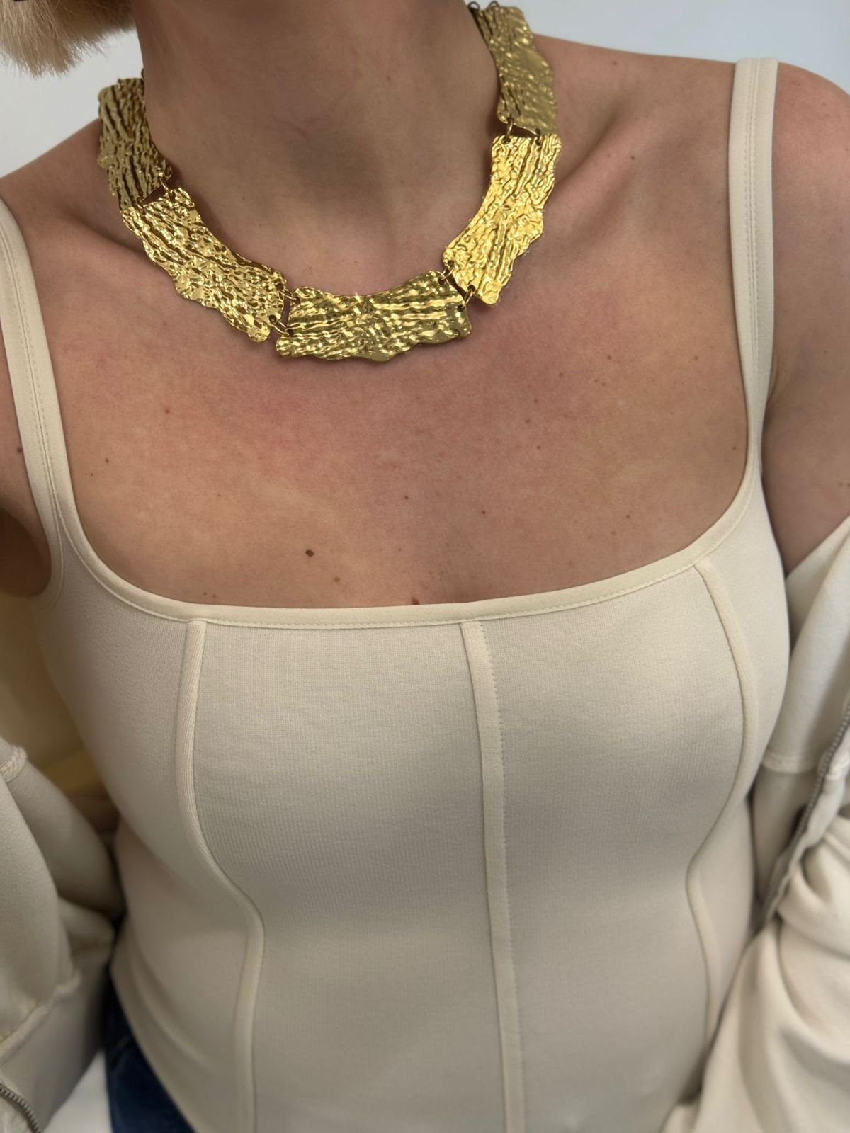 Αναδείξτε τη δυναμική σας κομψότητα με αυτό το εντυπωσιακό statement κολιέ σε χρυσό τόνο. Ο ιδιαίτερος, ανάγλυφος σχεδιασμός του με οργανικές, ασύμμετρες φόρμες δημιουργεί ένα μοναδικό παιχνίδι φωτός και υφής, χαρίζοντας πολυτέλεια και χαρακτήρα σε κάθε εμφάνιση.