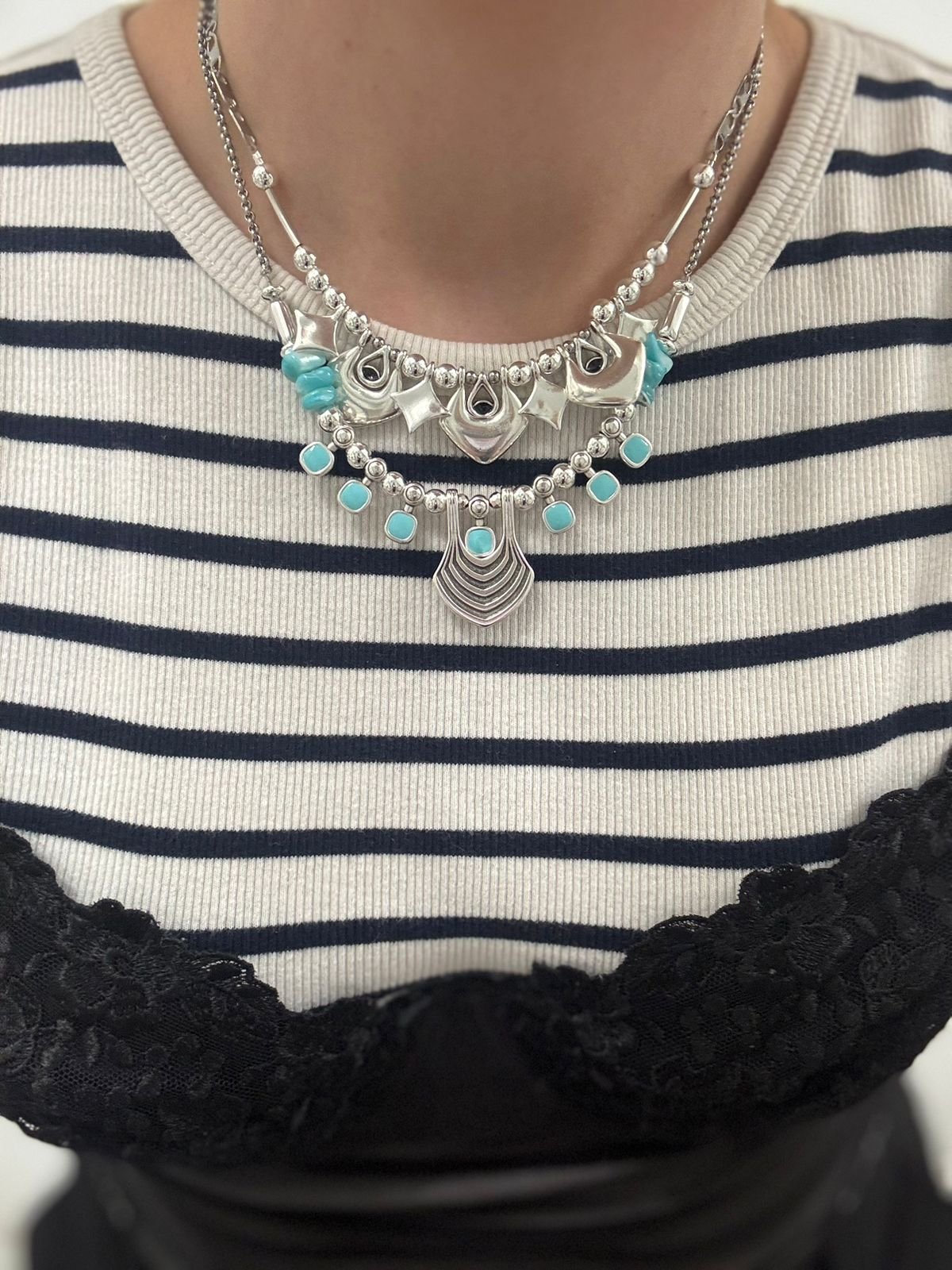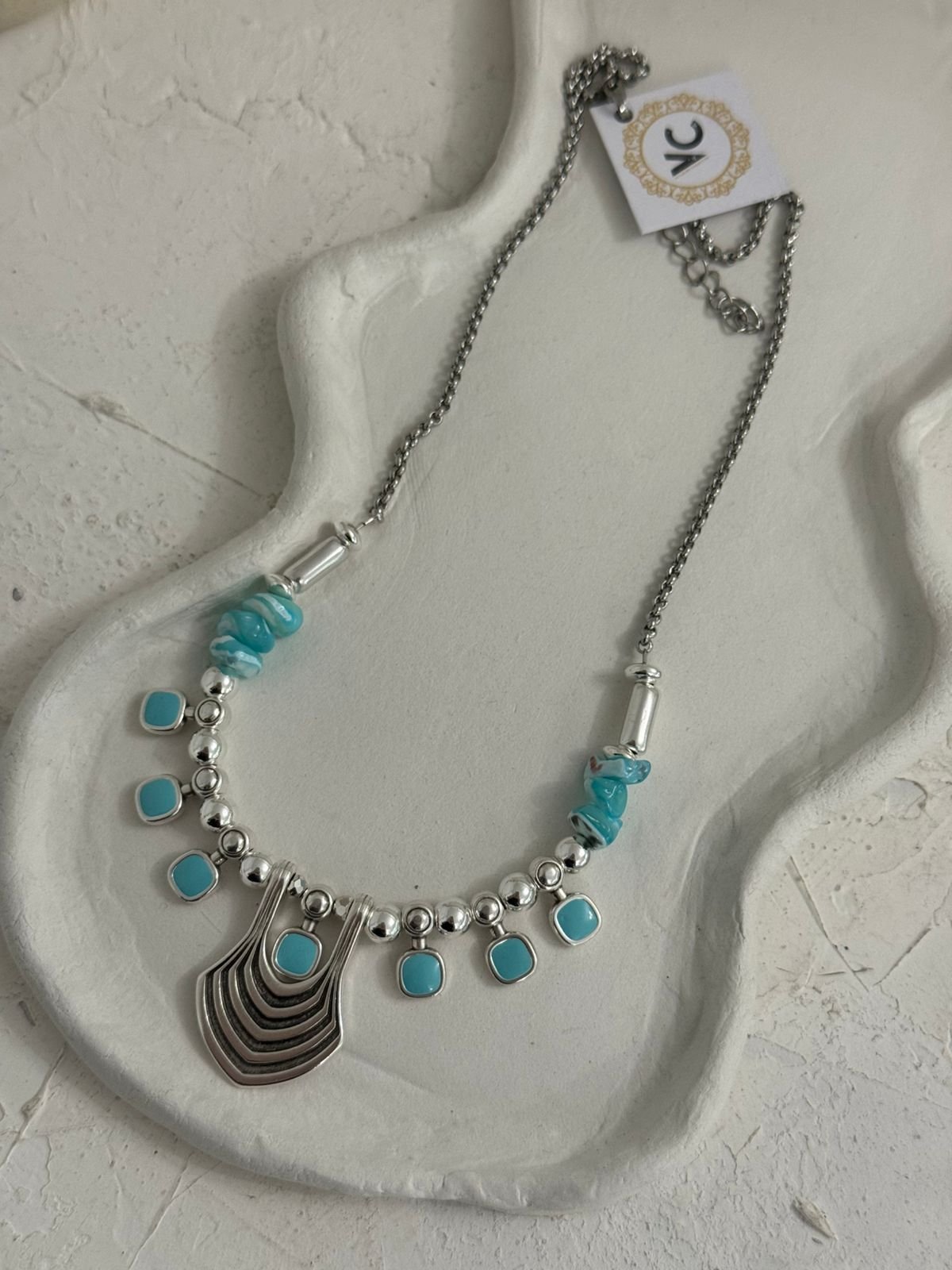Ένα κομψό κολιέ που αποπνέει αυθεντικότητα και ταξιδιάρικη αύρα, εμπνευσμένο από παραδοσιακά ethnic μοτίβα. Οι περίτεχνες λεπτομέρειες συνδυάζονται αρμονικά με τις ζωντανές τιρκουάζ πέτρες, που χαρίζουν φρεσκάδα και χρώμα, θυμίζοντας καλοκαιρινούς ουρανούς και εξωτικούς προορισμούς. Ιδανικό για να αναδείξει κάθε εμφάνιση, προσθέτοντας μια διακριτική πινελιά boho πολυτέλειας.