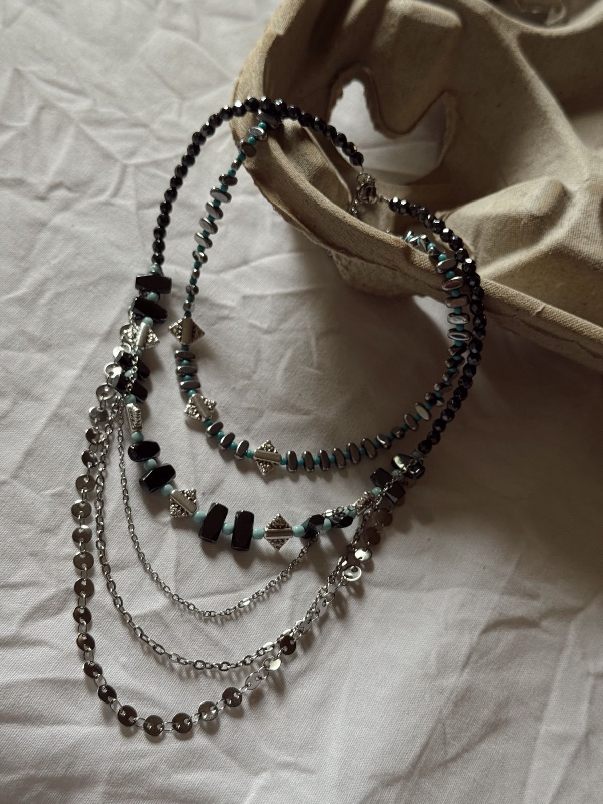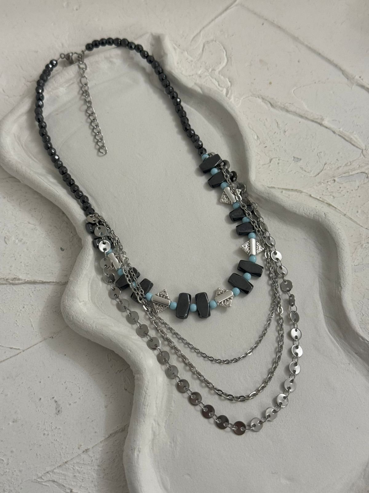 Κομψό και σύγχρονο statement κολιέ που συνδυάζει μοναδικά υλικά και υφές. Αποτελείται από γκρι-μαύρες πέτρες με γεωμετρικό σχήμα, διακριτικές γαλάζιες χάντρες και μεταλλικά στοιχεία σε ασημί απόχρωση, δημιουργώντας μια αρμονική αντίθεση. Οι πολλαπλές αλυσίδες προσθέτουν κίνηση και λάμψη, ενώ το ρυθμιζόμενο κούμπωμα εξασφαλίζει τέλεια εφαρμογή.