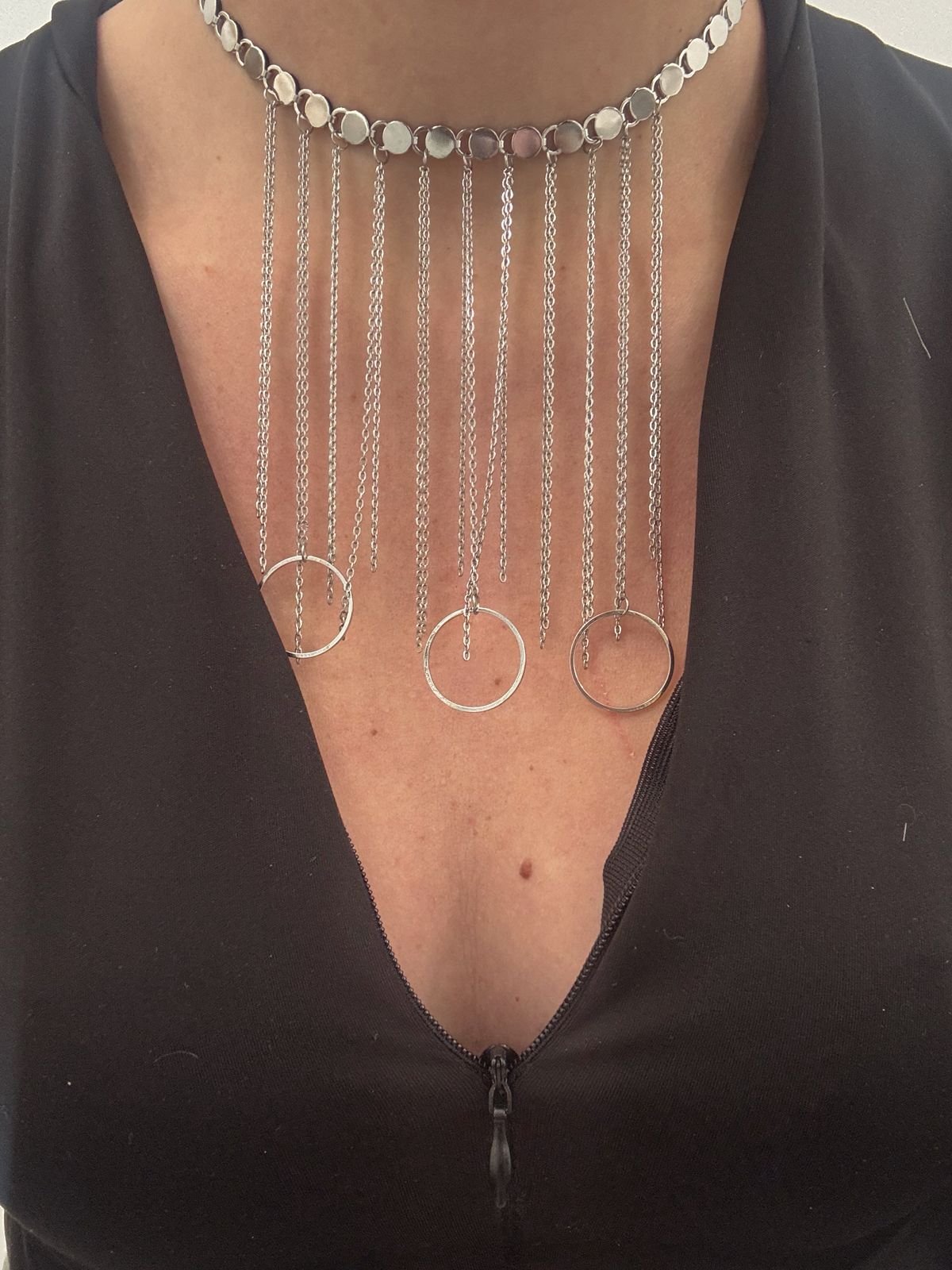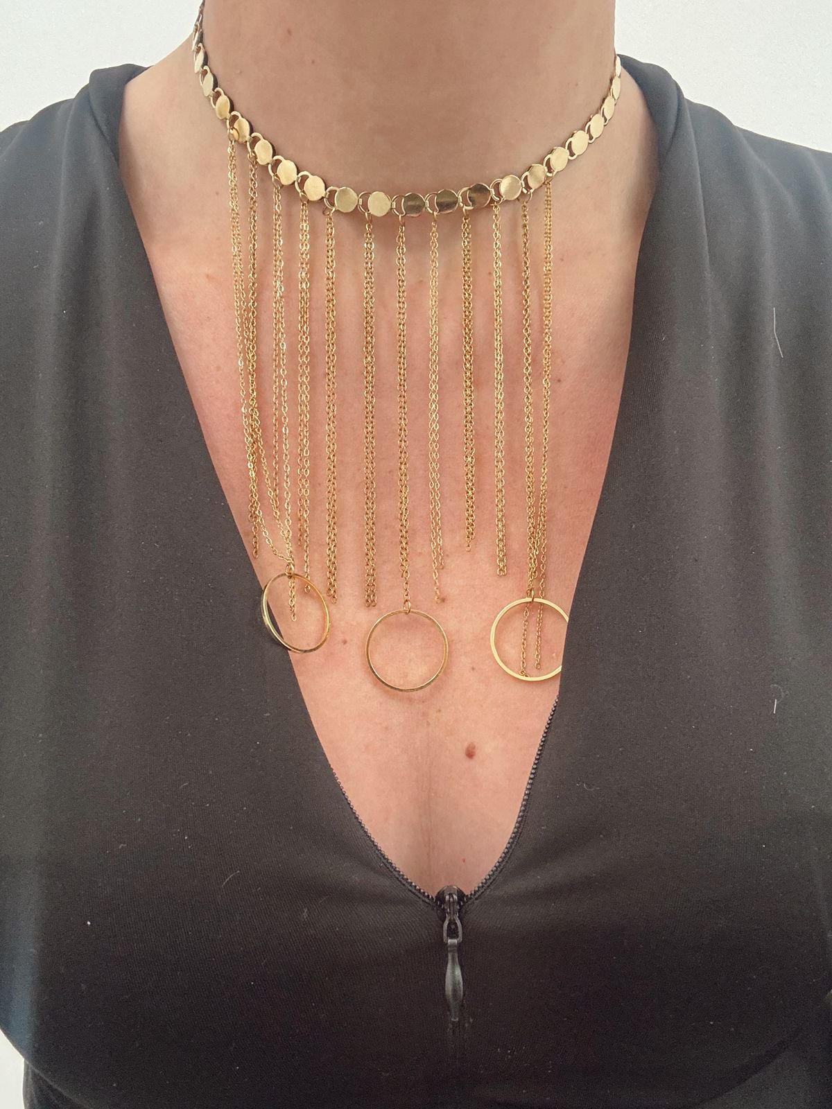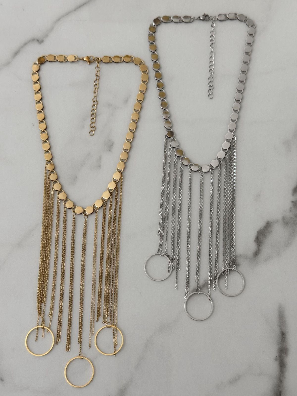 Choker με statement χαρακτήρα, φτιαγμένο από αλυσίδα που αγκαλιάζει τον λαιμό και καταλήγει σε λεπτές, κρεμαστές αλυσίδες που κινούνται διακριτικά με κάθε κίνηση. Ένα κόσμημα που συνδυάζει δυναμισμό και θηλυκότητα, ιδανικό για layering αλλά και για να φορεθεί μόνο του ως το απόλυτο highlight του look. Minimal αισθητική με μοντέρνα διάθεση, που δίνει ένταση και κομψότητα από το πρωί μέχρι το βράδυ.