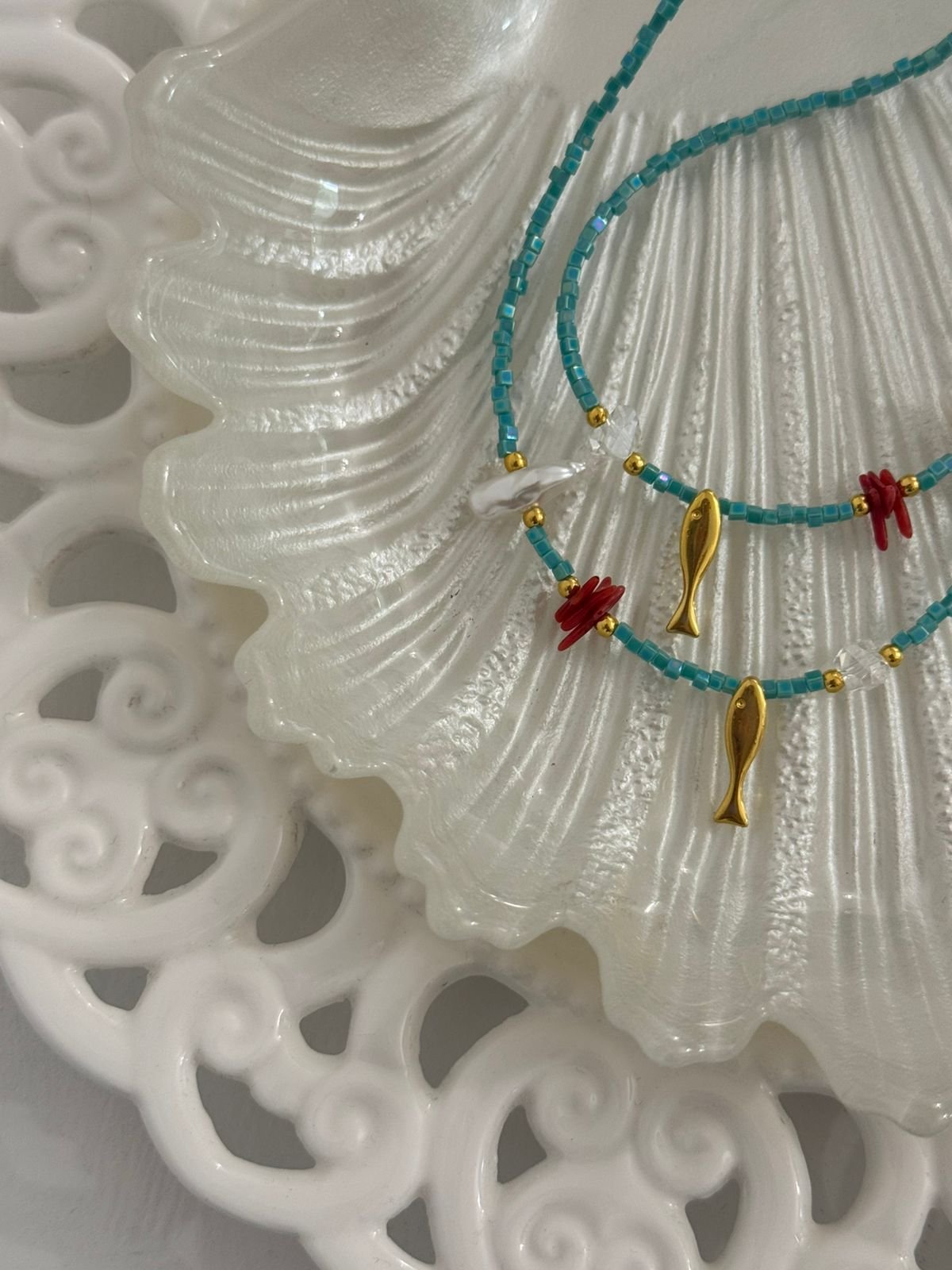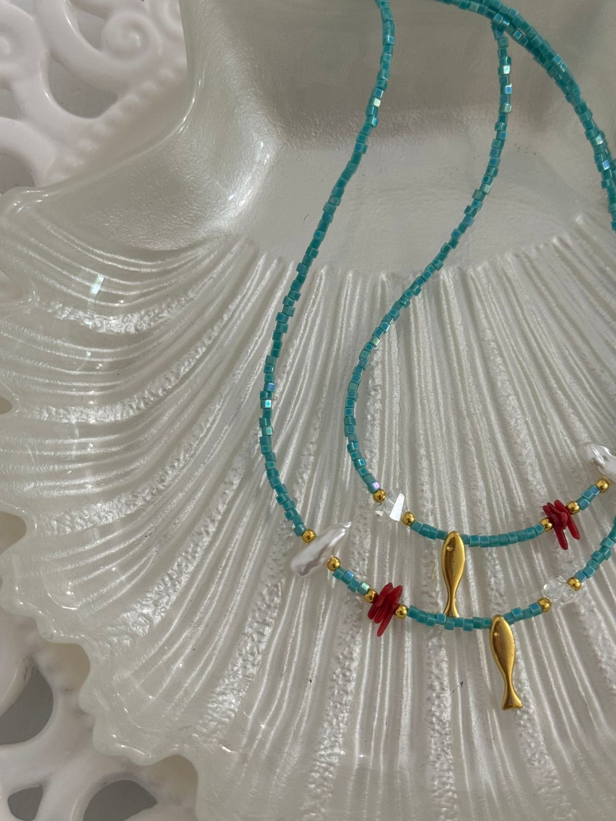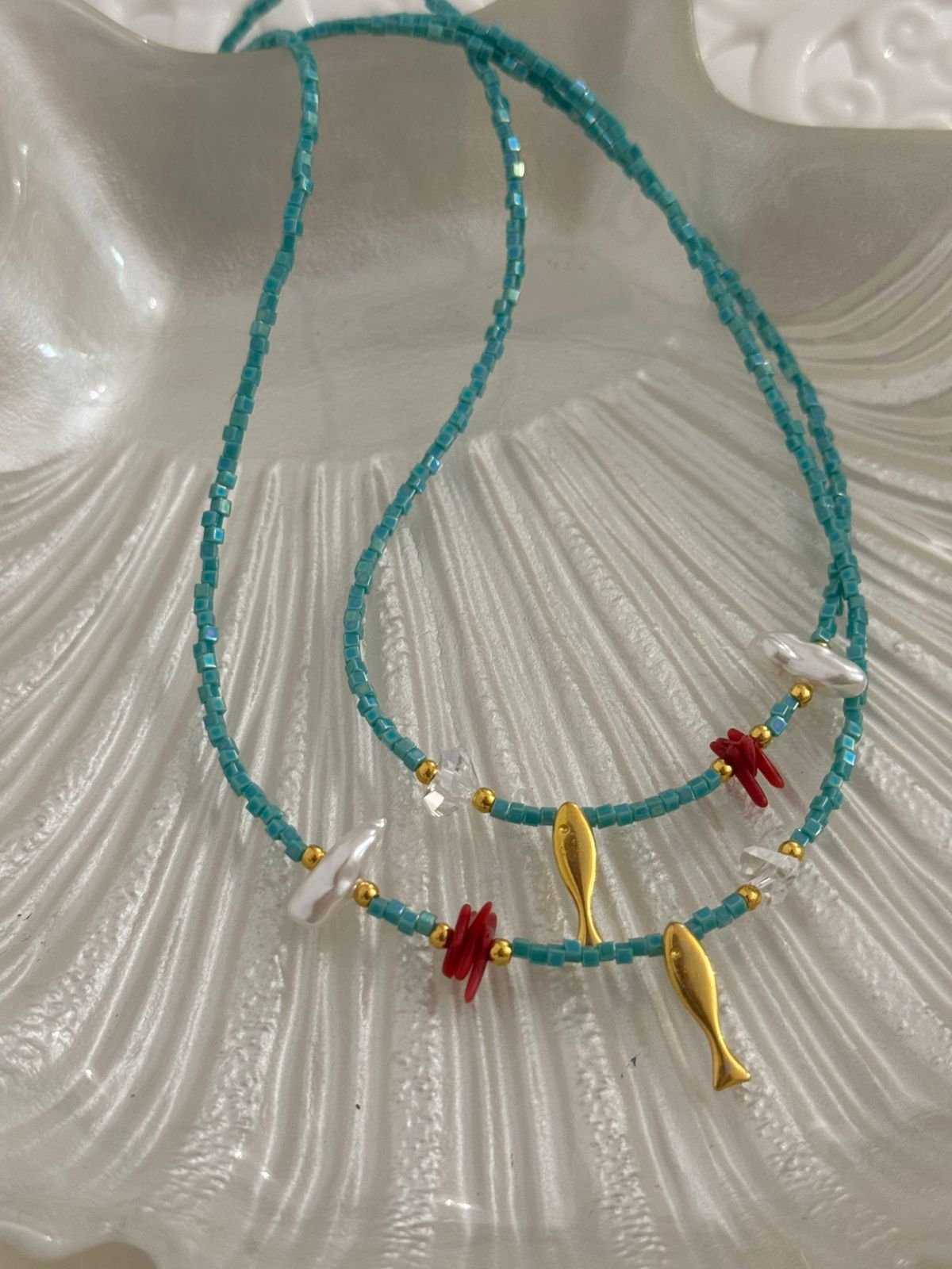 Κολιέ με χάντρες, πέρλα, κρύσταλλα, ημιπολύτιμες χάντρες τσιπς και ορείχαλκινο επιχρυσωμενο 24Κ στοιχείο.