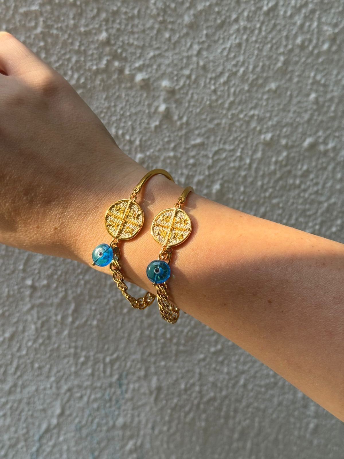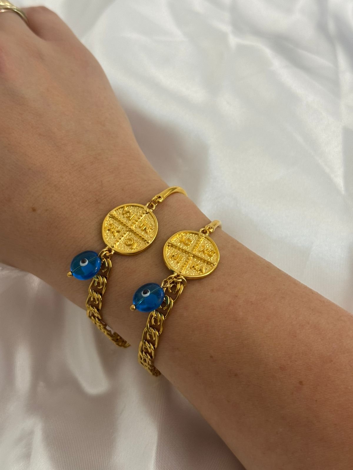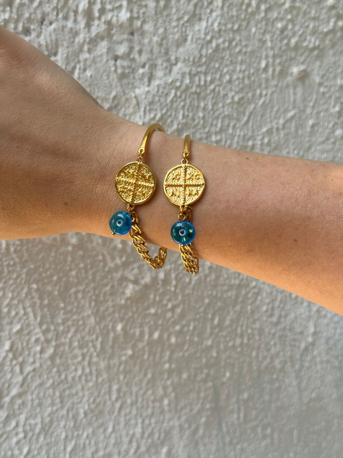 Ατσάλινη αλυσίδα με ορείχαλκινα επιχρυσωμενα 24Κ στοιχεία και γυάλινο μάτι.