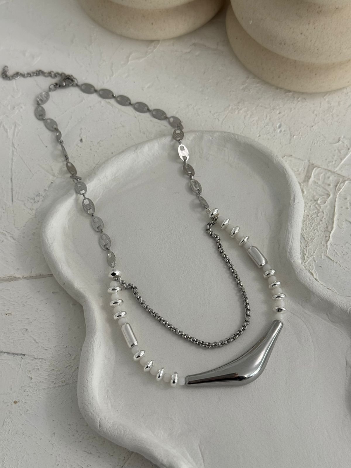 Ατσάλινη αλυσίδα με πέρλες και ορειχαλκινα επαργυρωμένα στοιχεία.