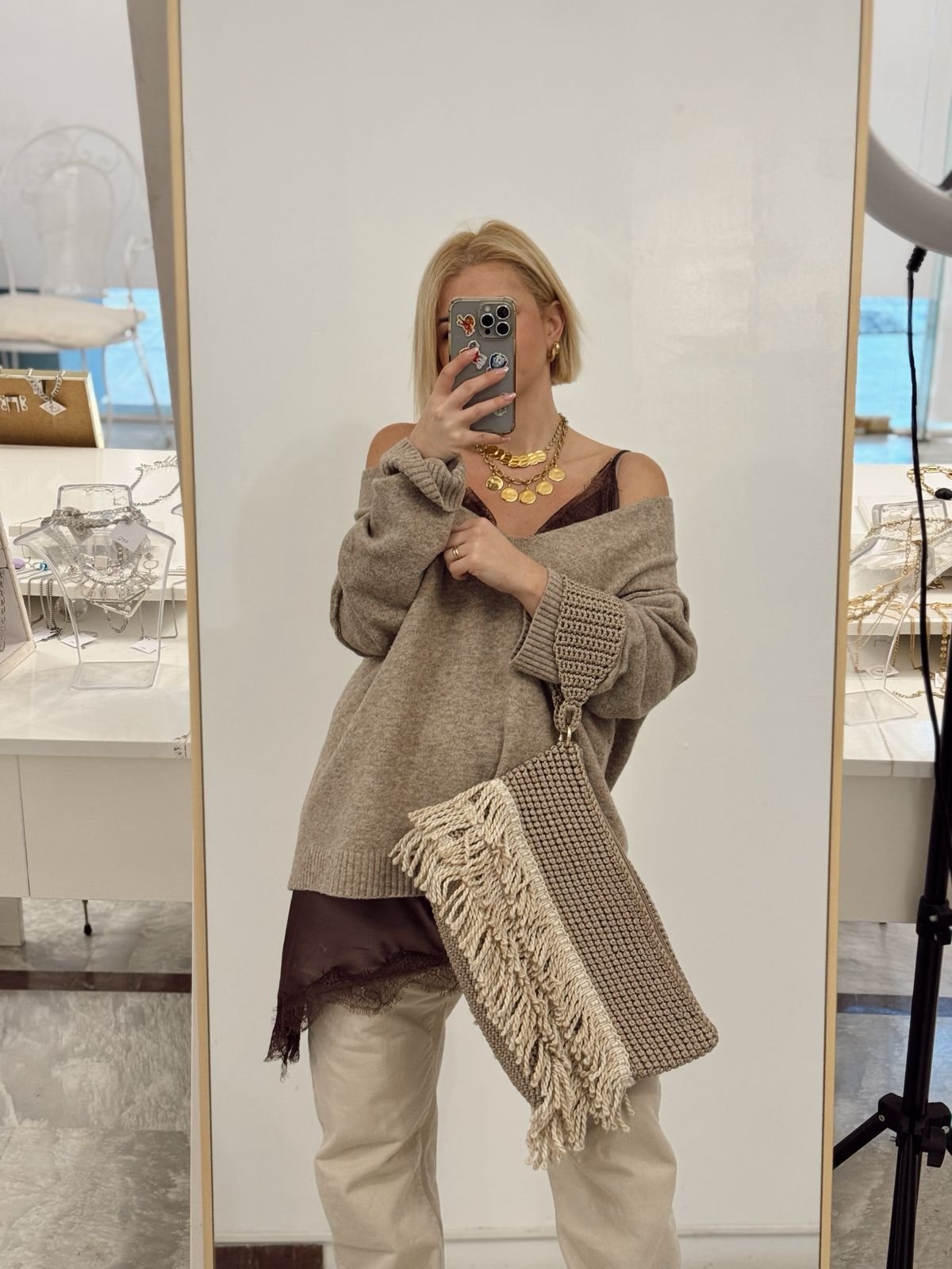 Πλεκτή χειροποίητη τσάντα που συνδυάζει ανεπιτήδευτη κομψότητα με boho χαρακτήρα. Δημιουργημένη με προσεγμένη πλέξη και έμφαση στη λεπτομέρεια, ξεχωρίζει για το εντυπωσιακό κρόσι στο κάτω μέρος που χαρίζει κίνηση, αέρα και μοναδική προσωπικότητα σε κάθε σου βήμα.