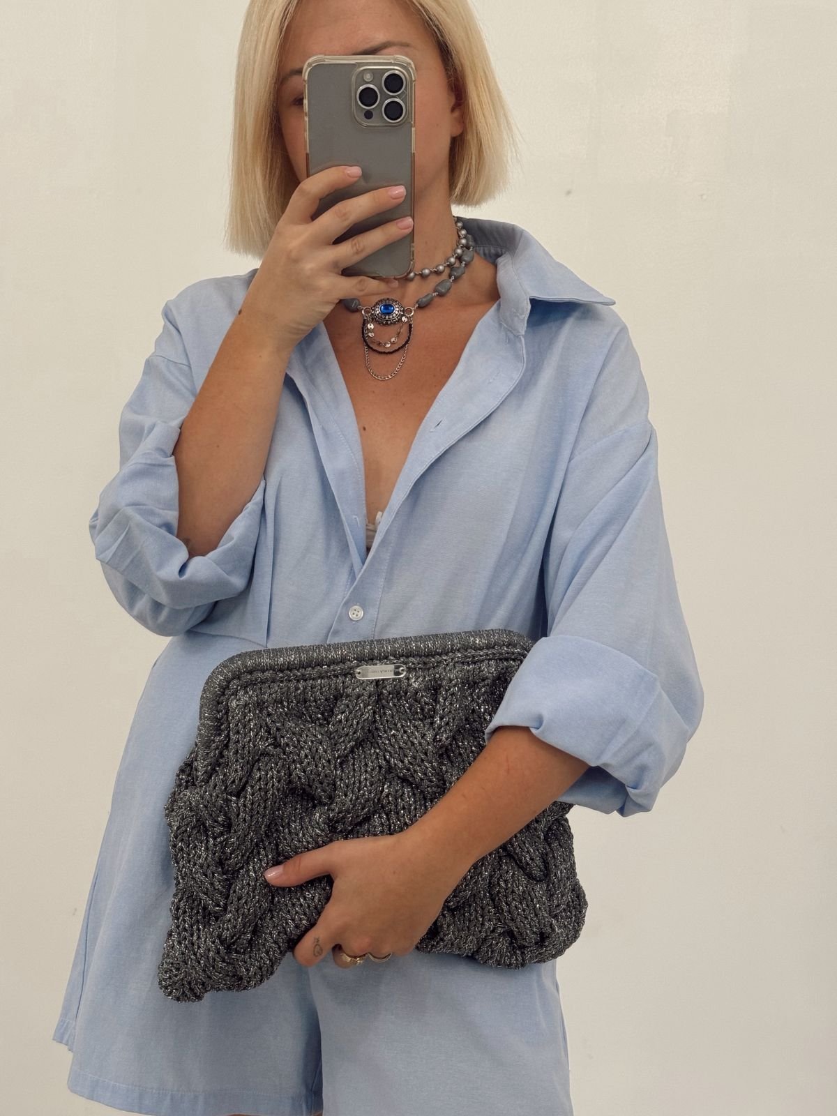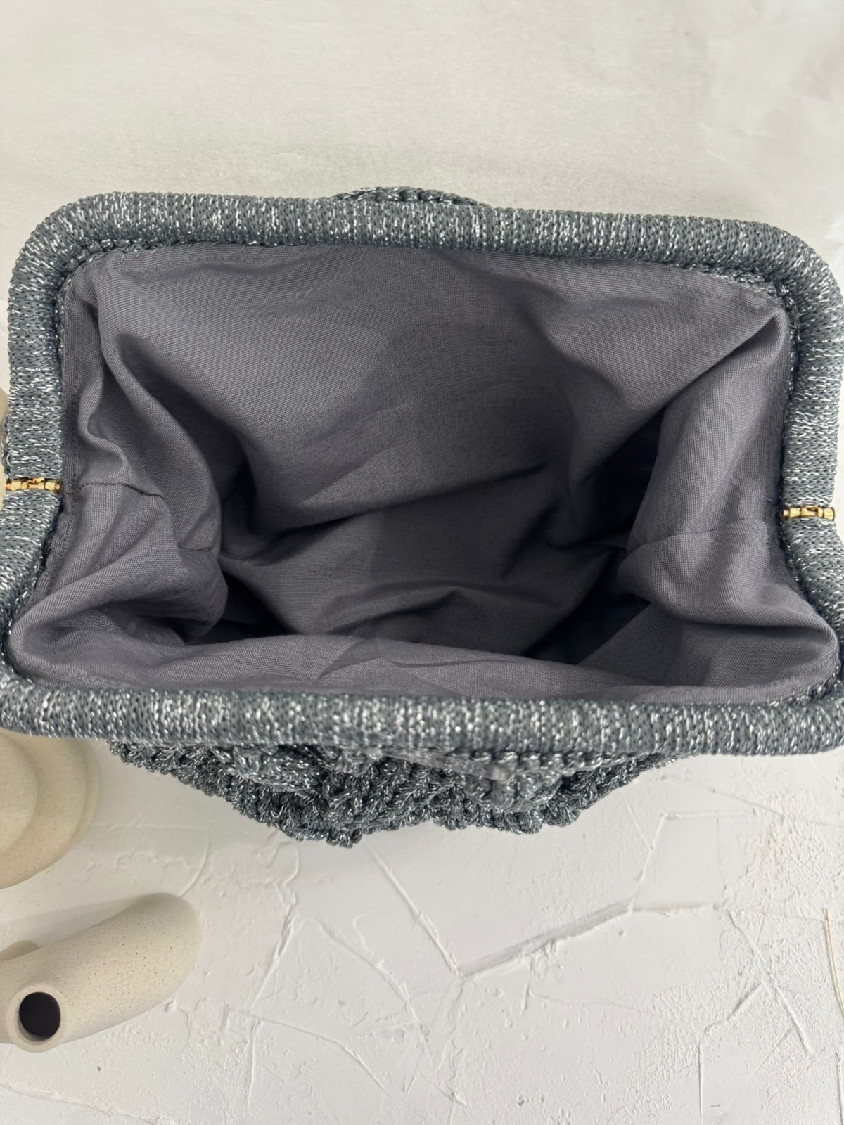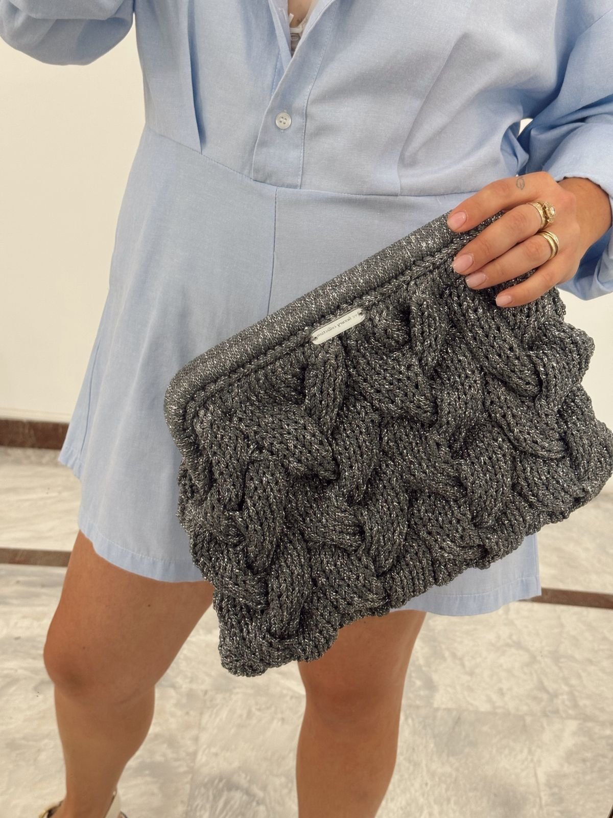 ✨ «Χειροποίητη πλεχτή τσάντα με εντυπωσιακό σχέδιο κοτσίδες, φτιαγμένη από ειδικό νήμα αποκλειστικά για εμάς. Το μεταλλικό νήμα που κρύβεται μέσα του χαρίζει διακριτική λάμψη και μια αίσθηση πολυτέλειας που ξεχωρίζει σε κάθε εμφάνιση.» ✨