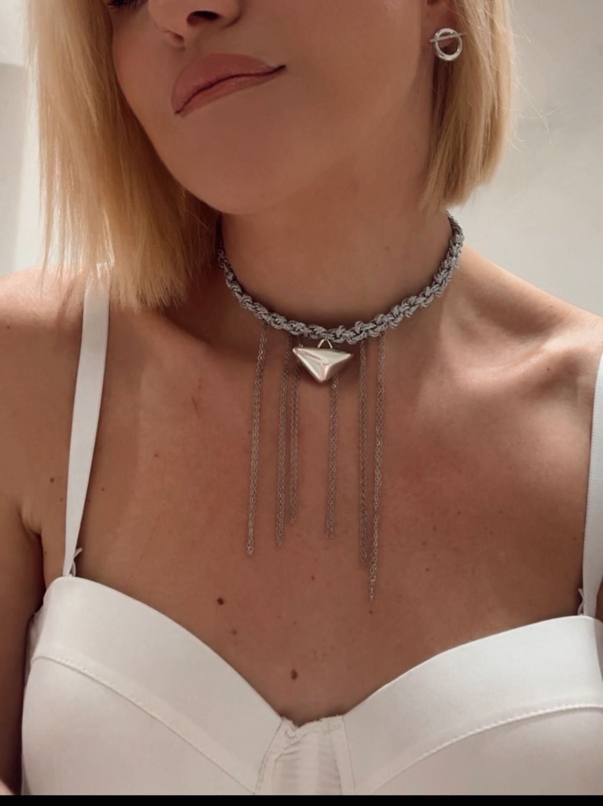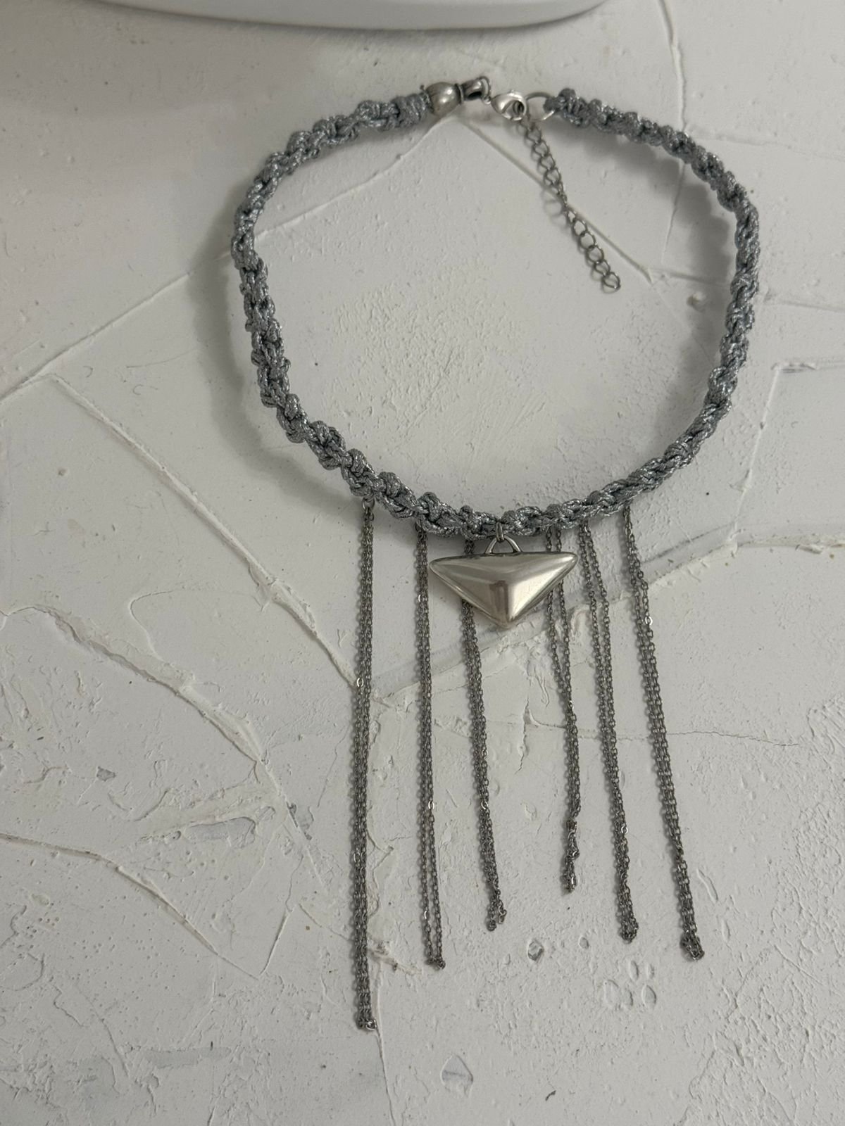 Κολιέ τσόκερ χειροποίητο πλεκτό με ορειχαλκινο επαργυρωμένο στοιχείο και ατσάλινες αλυσίδες.