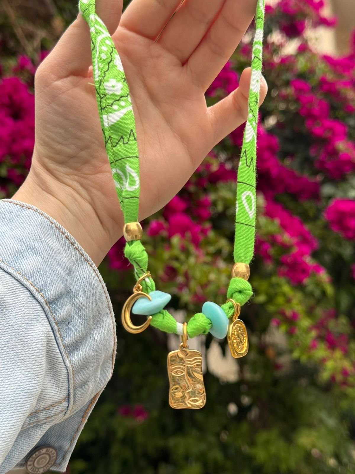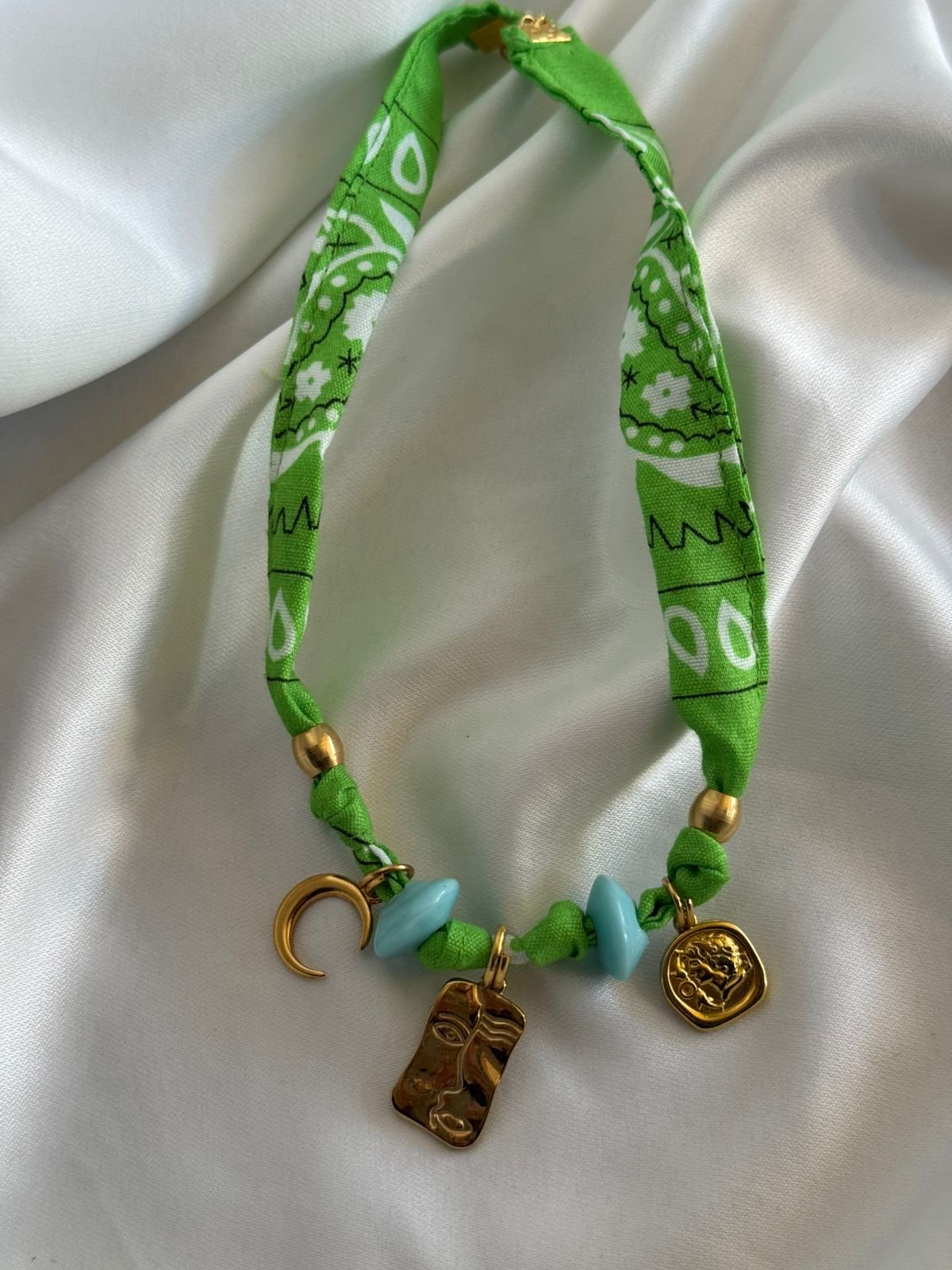 Κολιέ με ύφασμα μπαντάνα, ορειχάλκινα επιχρυσωμενα 24k & γυάλινα στοιχεία.