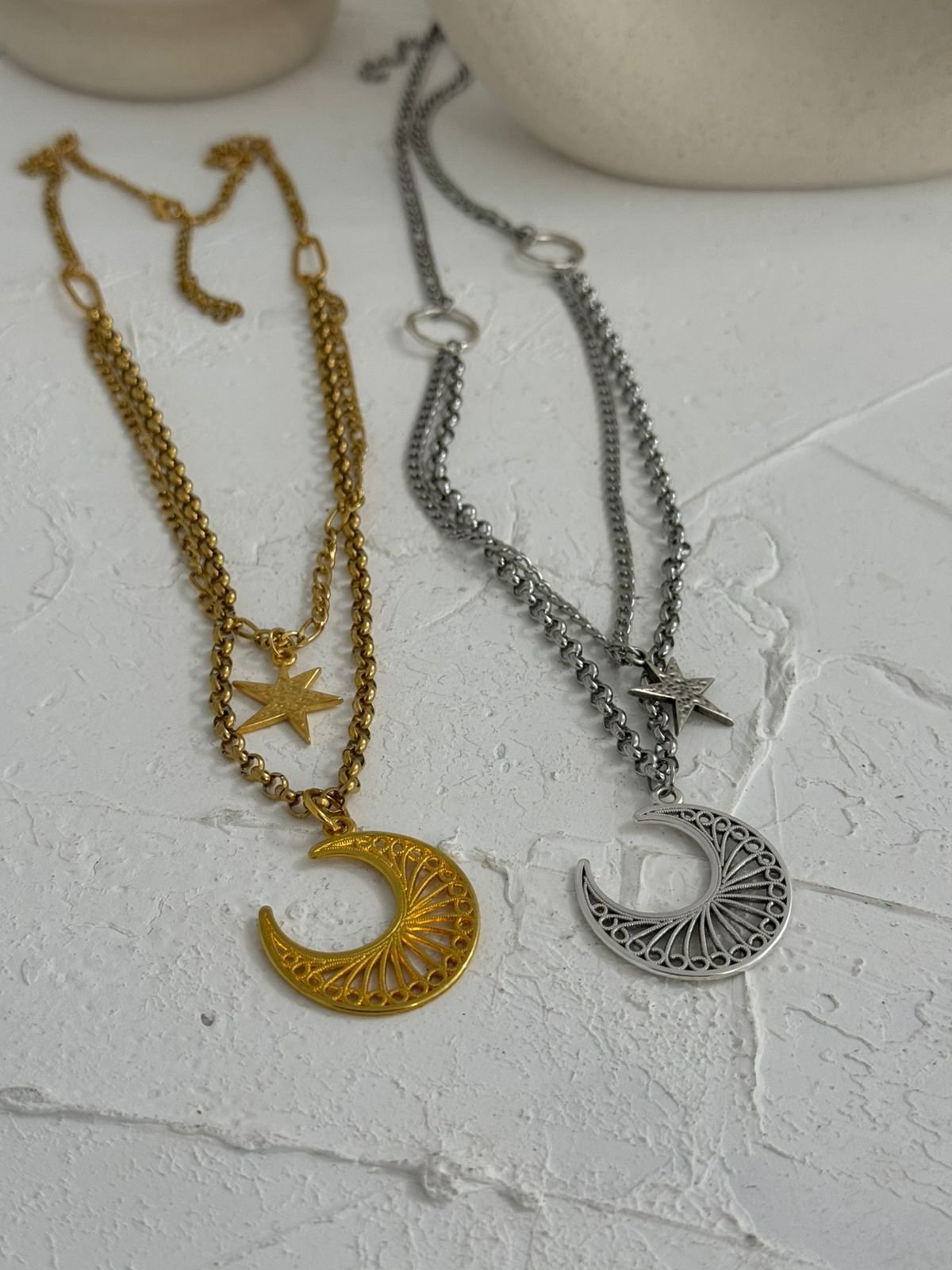 Διπλό κολιέ με ατσάλινες αλυσίδες με ορειχάλκινα επιχρυσωμενα 24Κ/ επαργυρωμένα 925 στοιχεία.