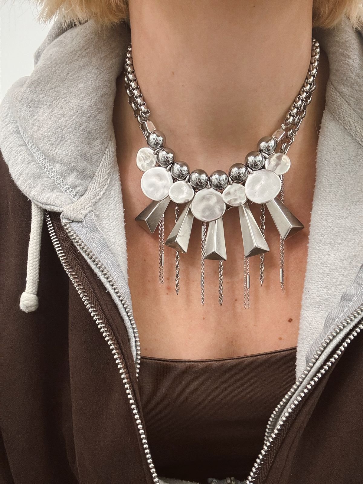 Μεγάλο, εντυπωσιακό κολιέ με έντονα τρισδιάστατα στοιχεία που δημιουργούν βάθος, κίνηση και μοναδικό οπτικό αποτέλεσμα. Ο sculptural σχεδιασμός του αγκαλιάζει τον λαιμό και μετατρέπει το κόσμημα σε απόλυτο statement, ιδανικό για εμφανίσεις που θέλουν να ξεχωρίζουν. Ένα δυναμικό και σύγχρονο κολιέ, εμπνευσμένο από την τέχνη και τη μοντέρνα αισθητική, που αναβαθμίζει ακόμη και το πιο απλό outfit.