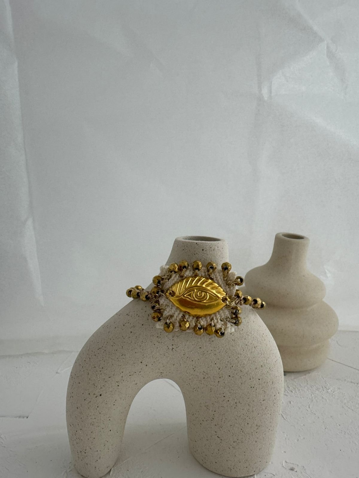 Ένα χειροποίητο βραχιόλι-φυλαχτό που ενώνει το μεταλλικό μάτι στο κέντρο με τις γήινες χάντρες αιματίτη. 👁️✨