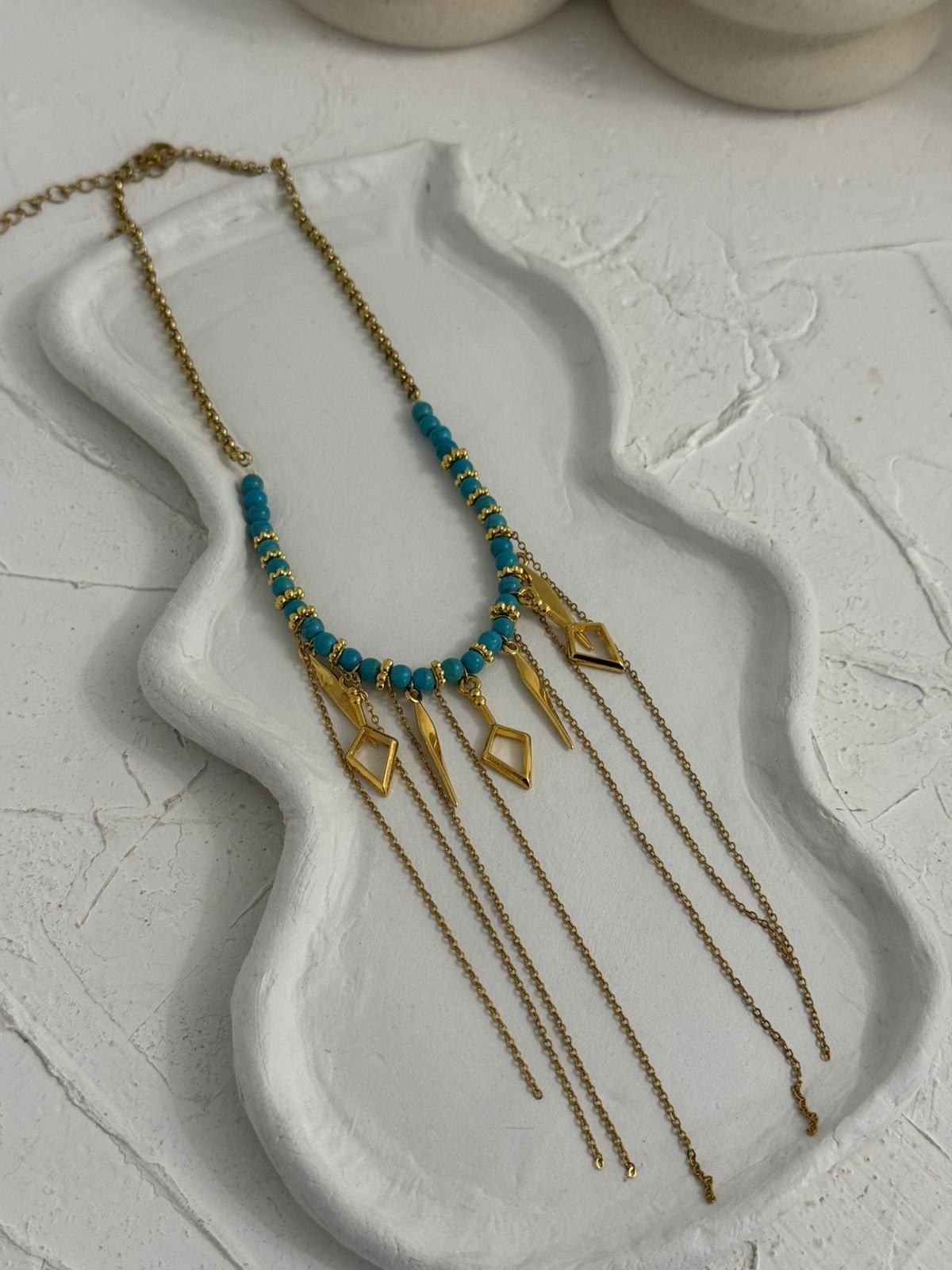 Τυρκουάζ χάντρες σε ζωηρές αποχρώσεις θυμίζουν τα καθαρά νερά του Αιγαίου, ενώ οι διακριτικές χρυσές λεπτομέρειες που κρέμονται χαρίζουν κίνηση, φως και μια αίσθηση πολυτέλειας σε κάθε σου εμφάνιση.