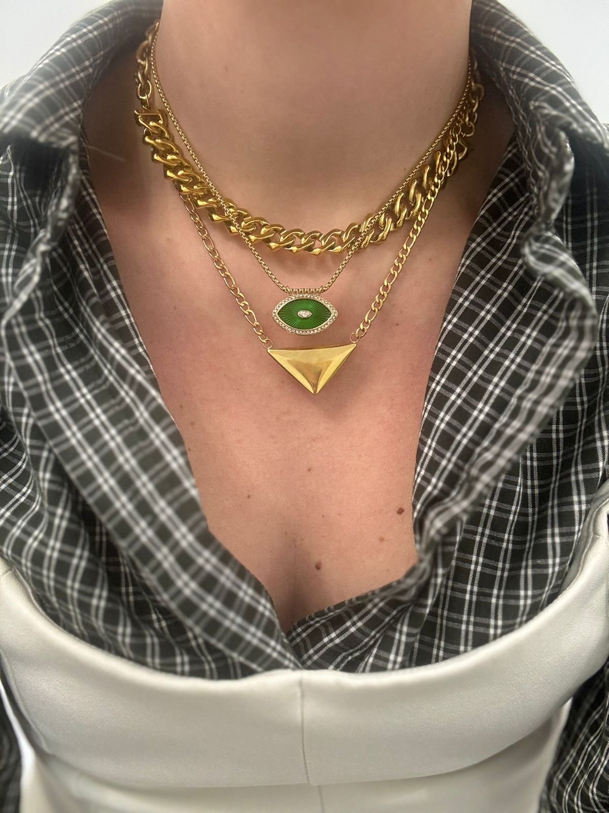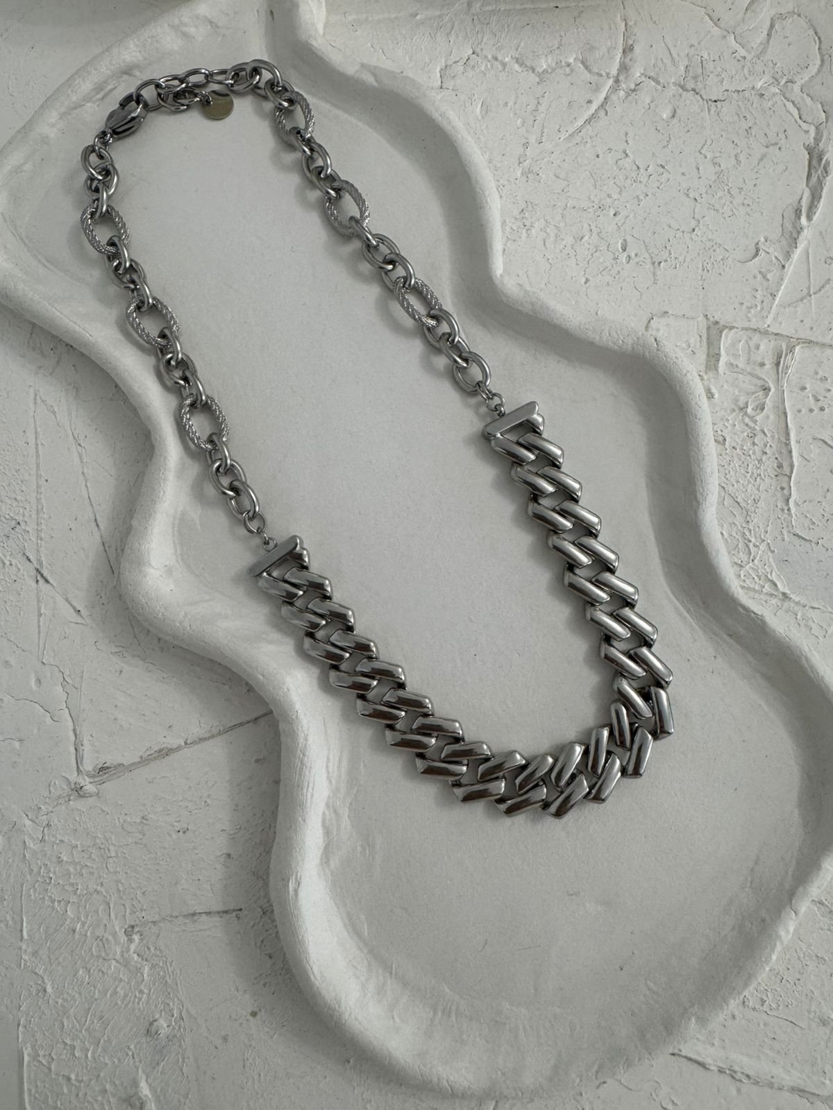 Μια δυναμική και σύγχρονη ατσάλινη αλυσίδα με έντονο, chunky σχεδιασμό που τραβάει τα βλέμματα. Κατασκευασμένη από ανθεκτικό ανοξείδωτο ατσάλι, συνδυάζει στιβαρότητα με διαχρονικό στυλ, χωρίς να χάνει τη λάμψη της με το πέρασμα του χρόνου. Ιδανική για layering αλλά και ως statement κομμάτι από μόνη της, προσθέτει edgy χαρακτήρα σε κάθε εμφάνιση — από casual μέχρι πιο βραδινές επιλογές.