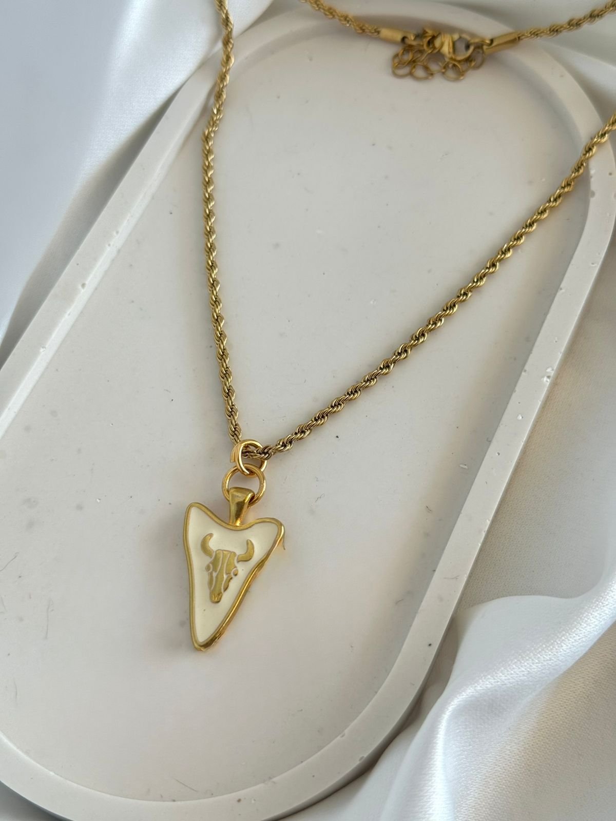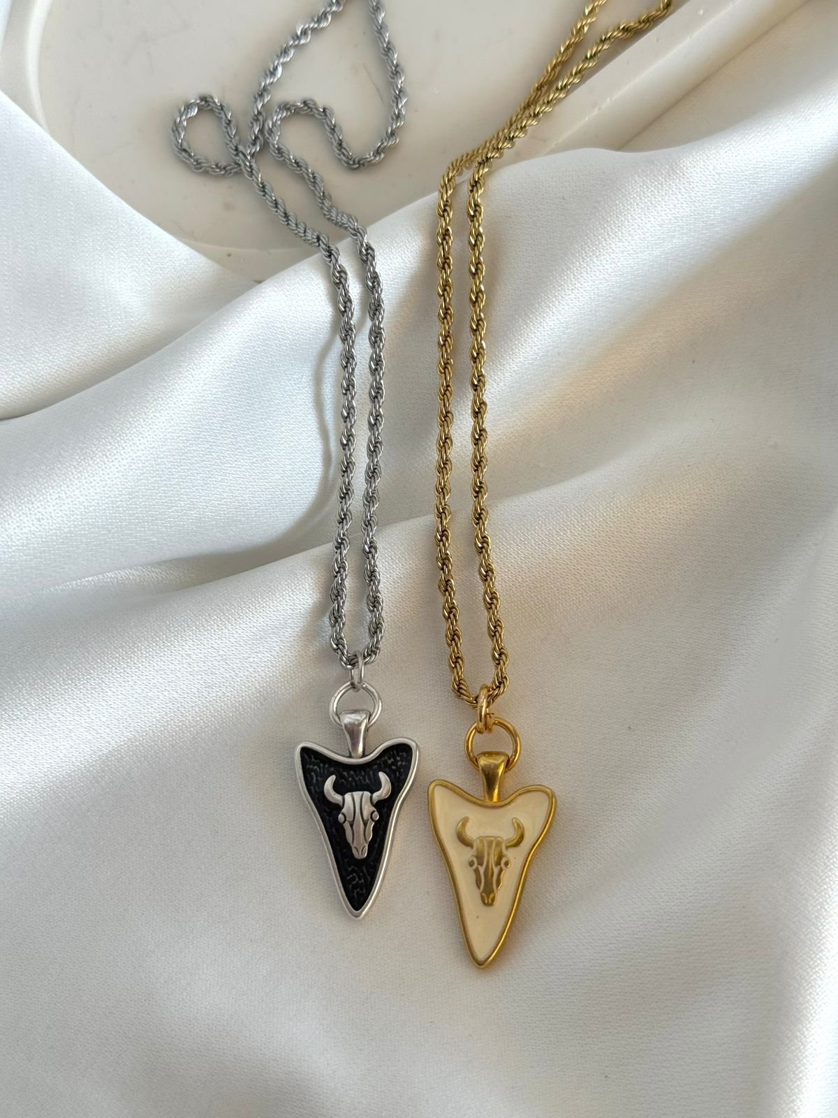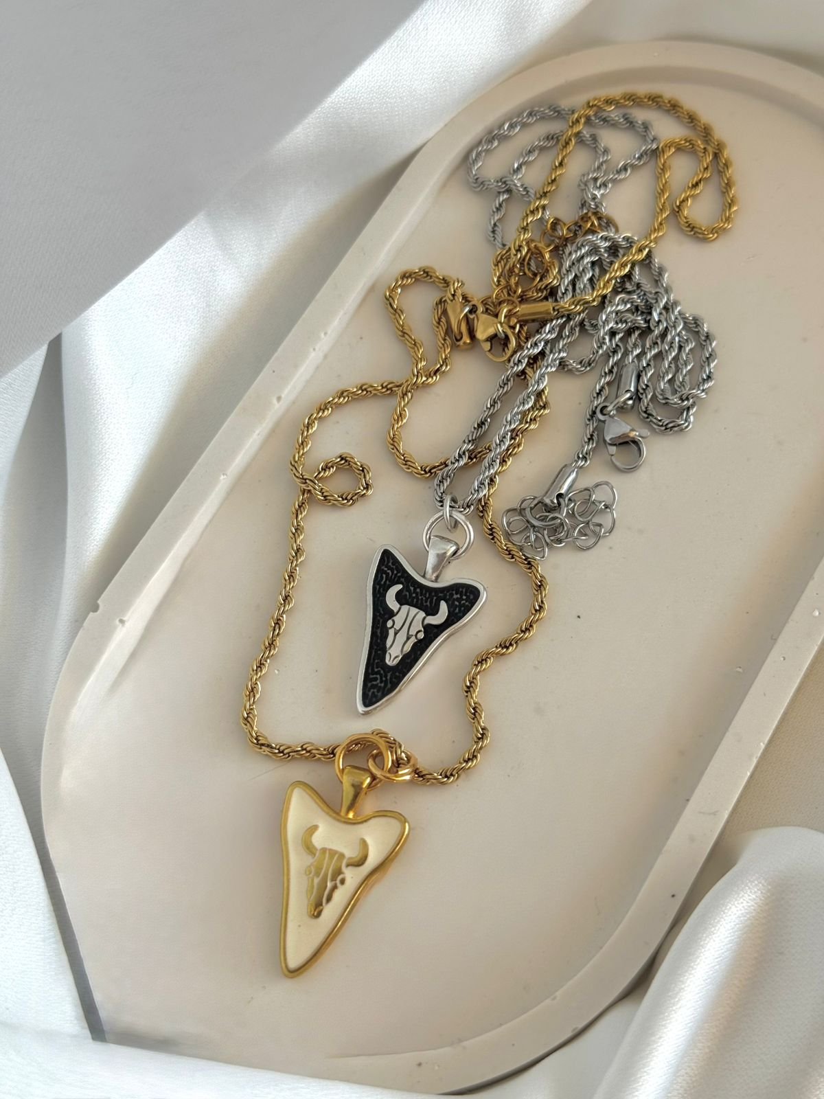 Κολιέ με ατσάλινη αλυσίδα και ορειχάλκινο επιχρυσωμένο/ επαργυρωμένο στοιχείο.