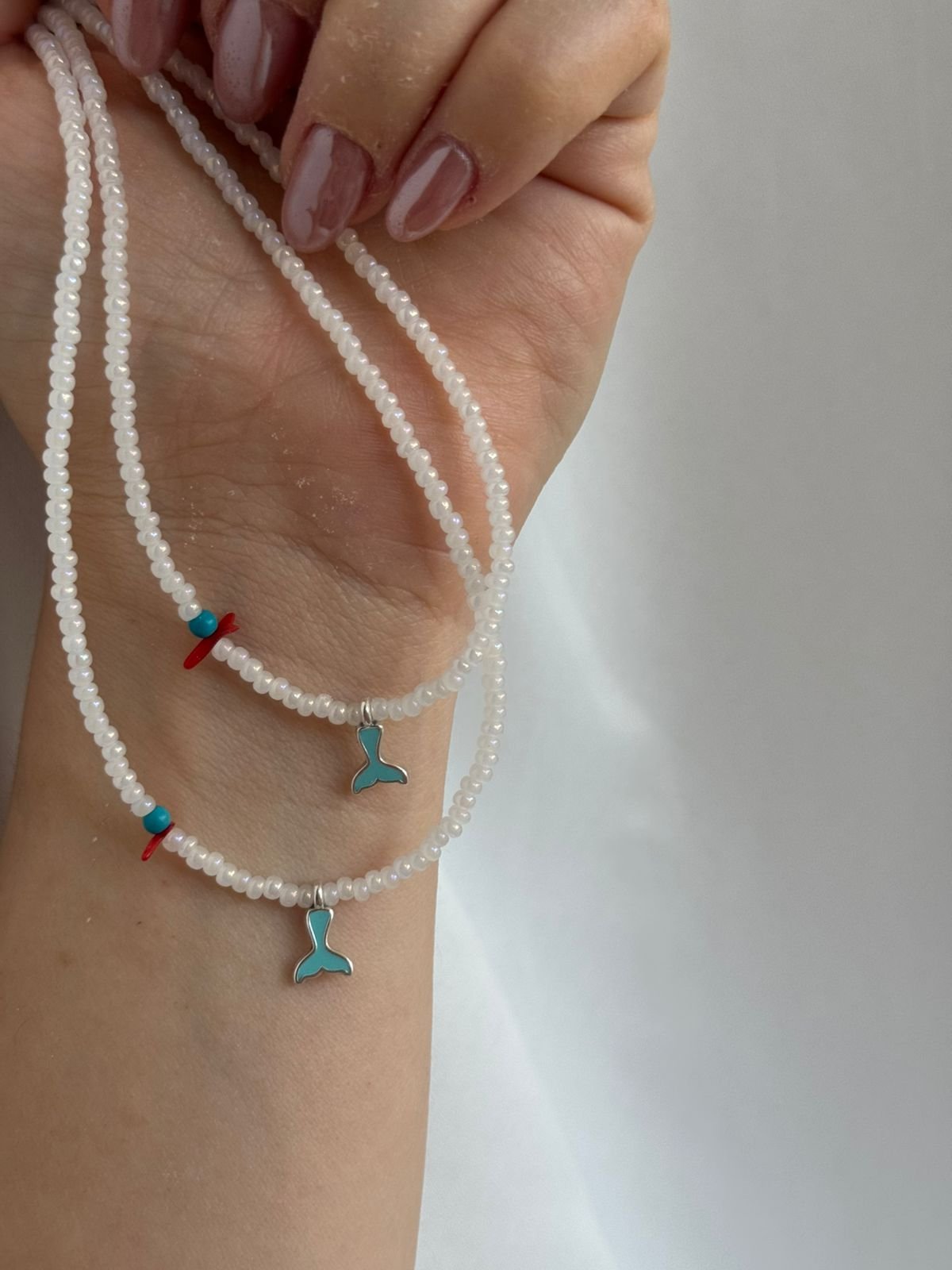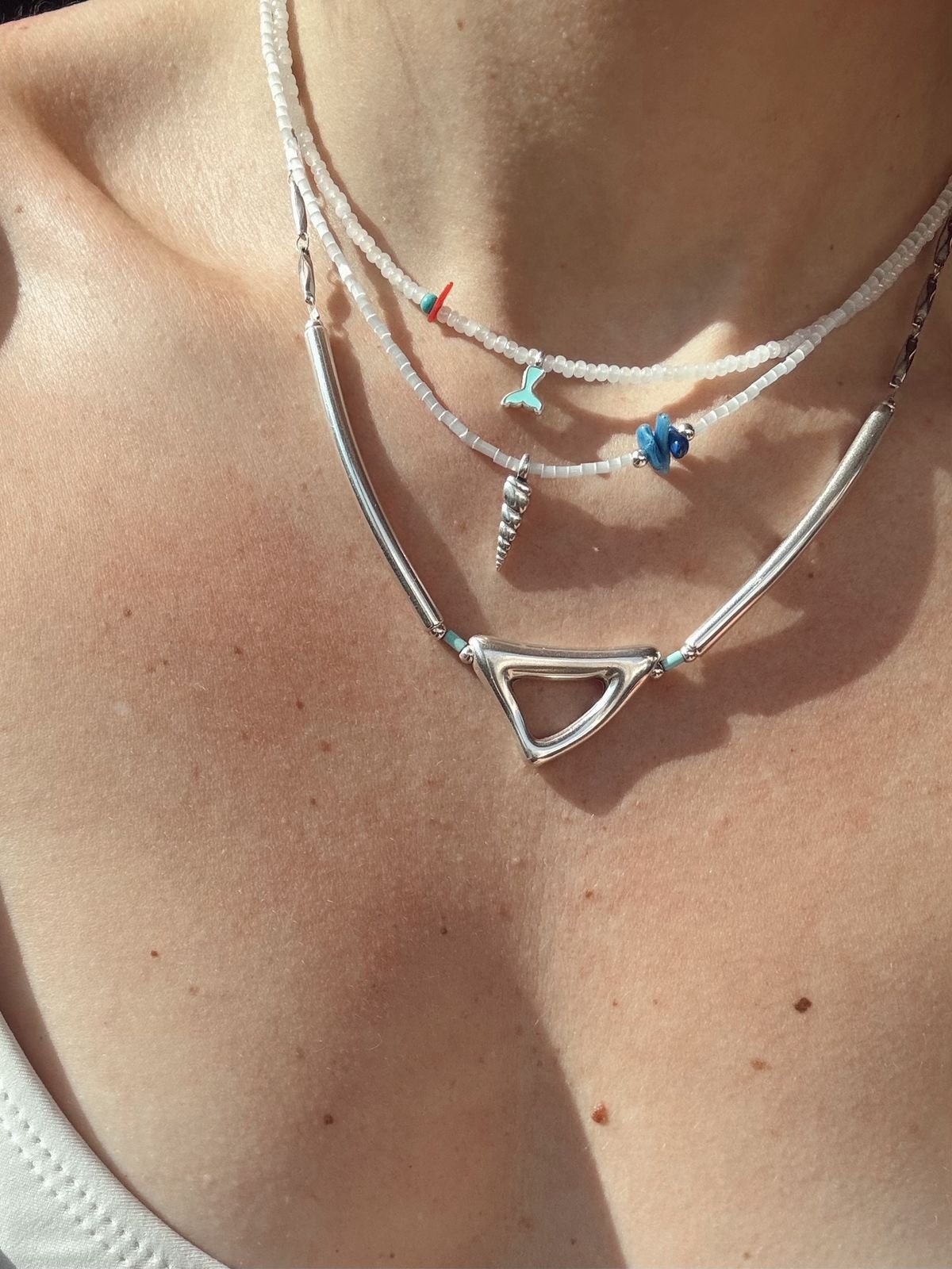 Κολιέ με χάντρες, ορειχαλκινα επαργυρωμένο στοιχείο και ημιπολύτιμες χάντρες.