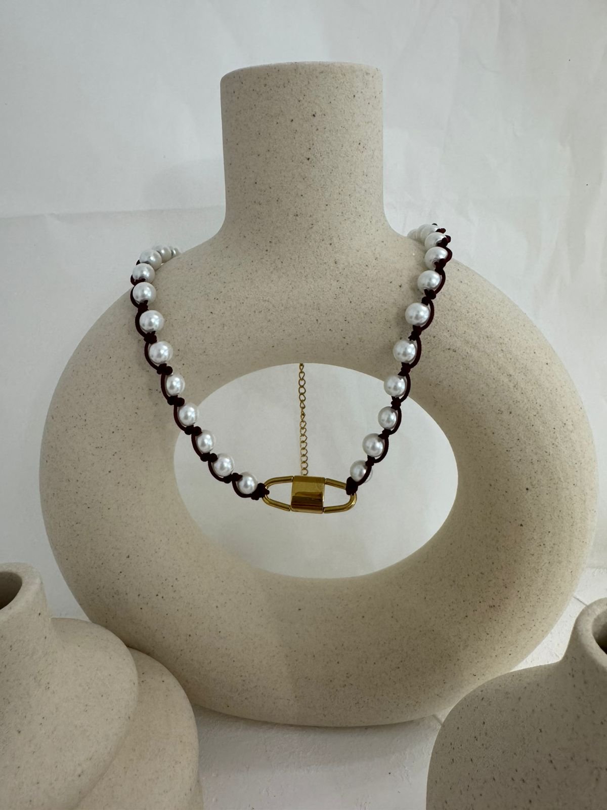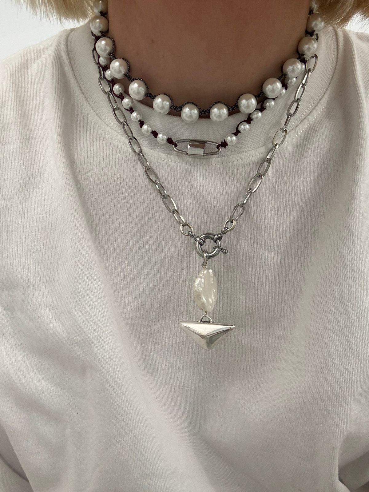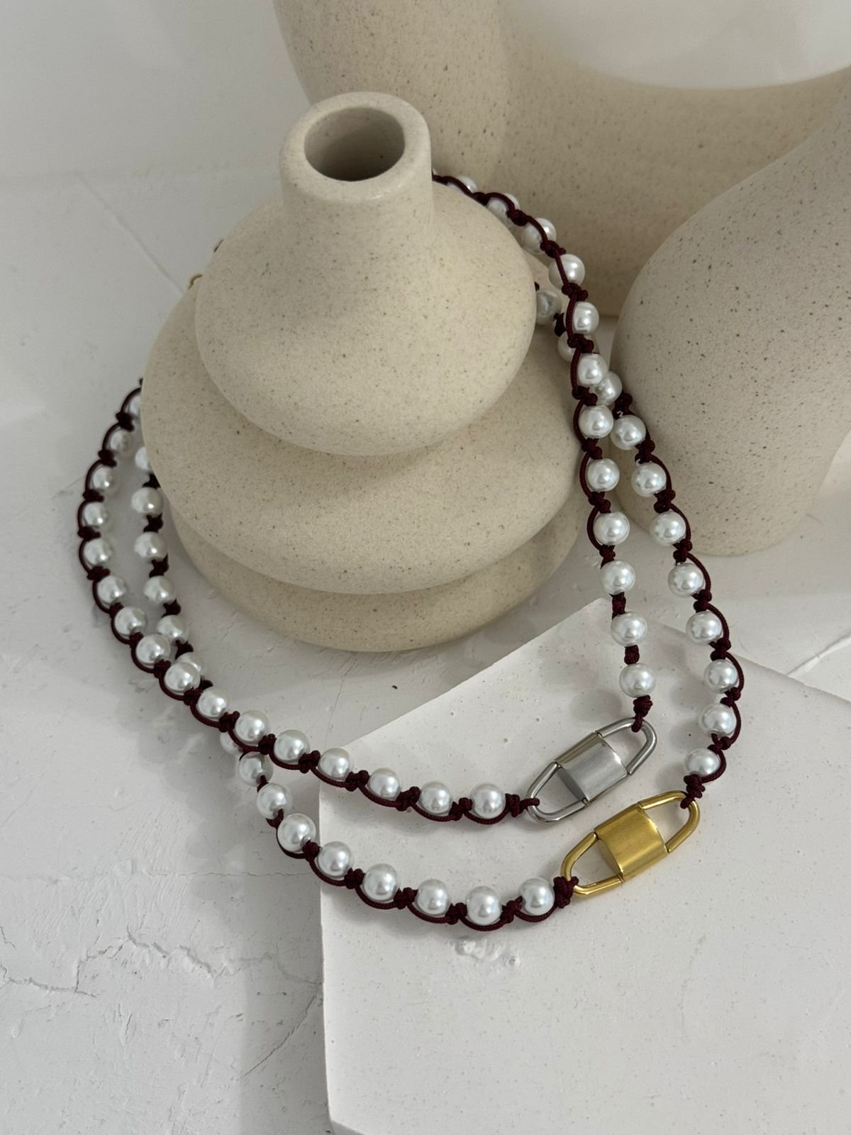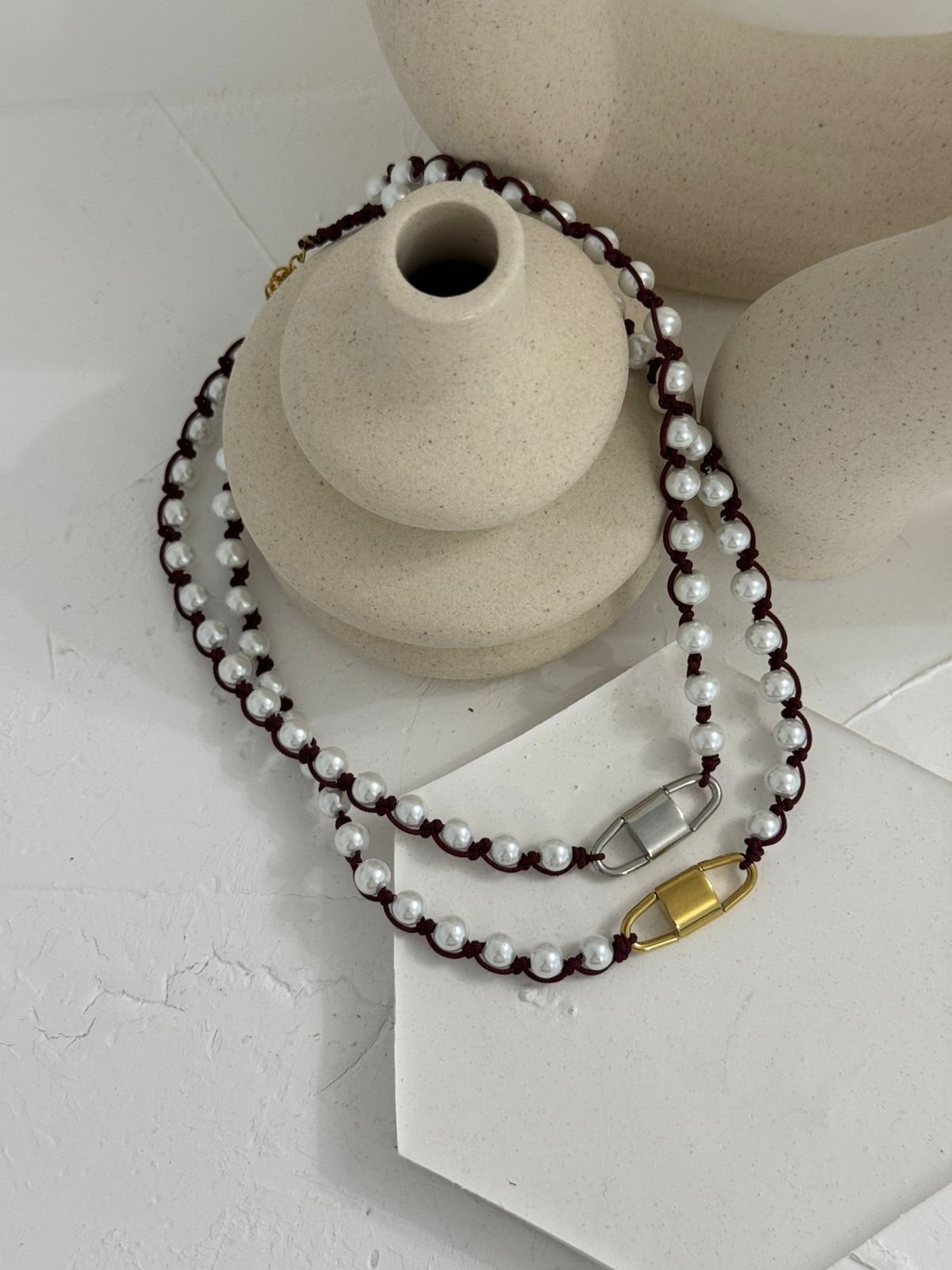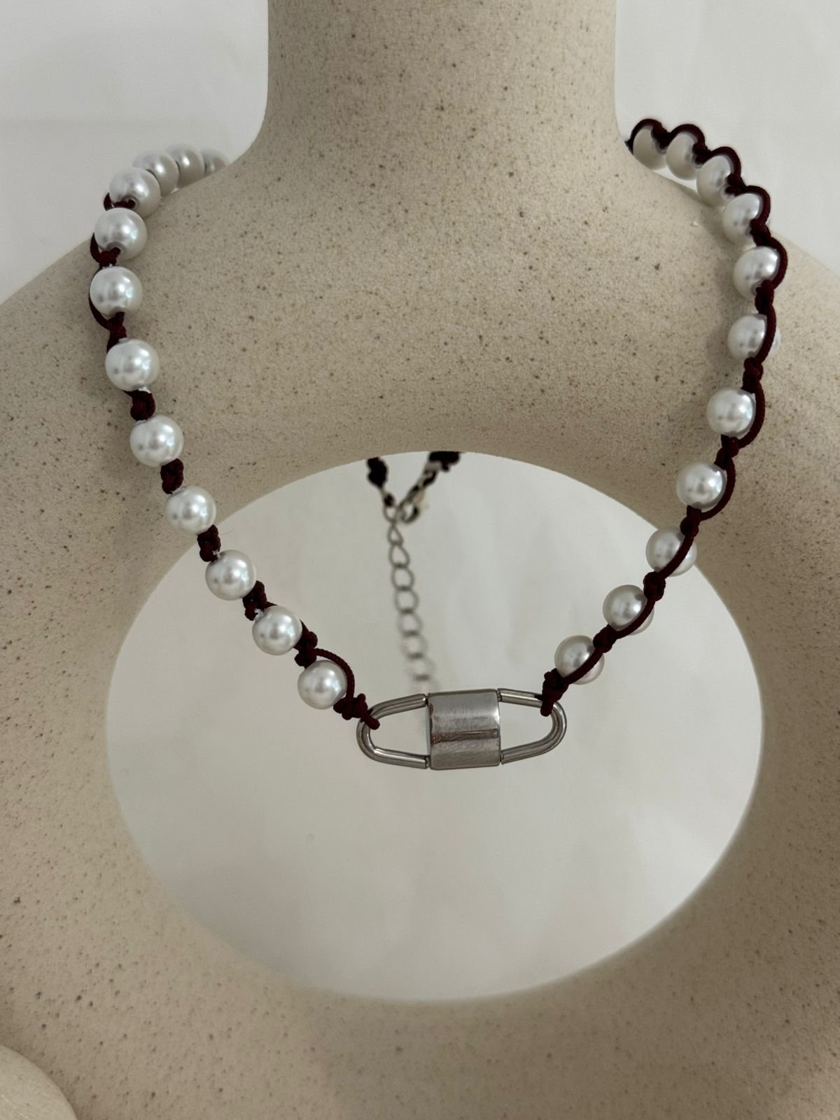 Ένα κόσμημα που συνδυάζει τη δύναμη με την κομψότητα. Στο κέντρο δεσπόζει ένα ατσάλινο στοιχείο που θυμίζει λουκέτο – σύμβολο προστασίας και μυστικότητας – ενώ γύρω του πλέκονται λευκές πέρλες με μπορντό κλωστή, δημιουργώντας έναν αριστοκρατικό αλλά και τολμηρό συνδυασμό.