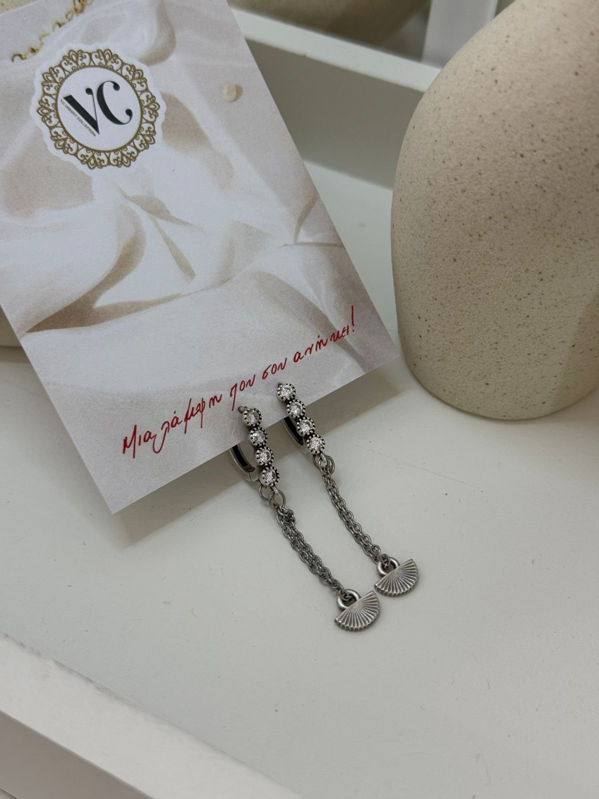 Σκουλαρίκι κρίκος με λαμπερή μπάρα από στρας και λεπτή αλυσίδα που καταλήγει σε ένα μικρό στοιχείο σε σχήμα βεντάλιας. Ένα κόσμημα που συνδυάζει λάμψη και κίνηση, ιδανικό για να αναβαθμίσει κάθε εμφάνιση με κομψό τρόπο.