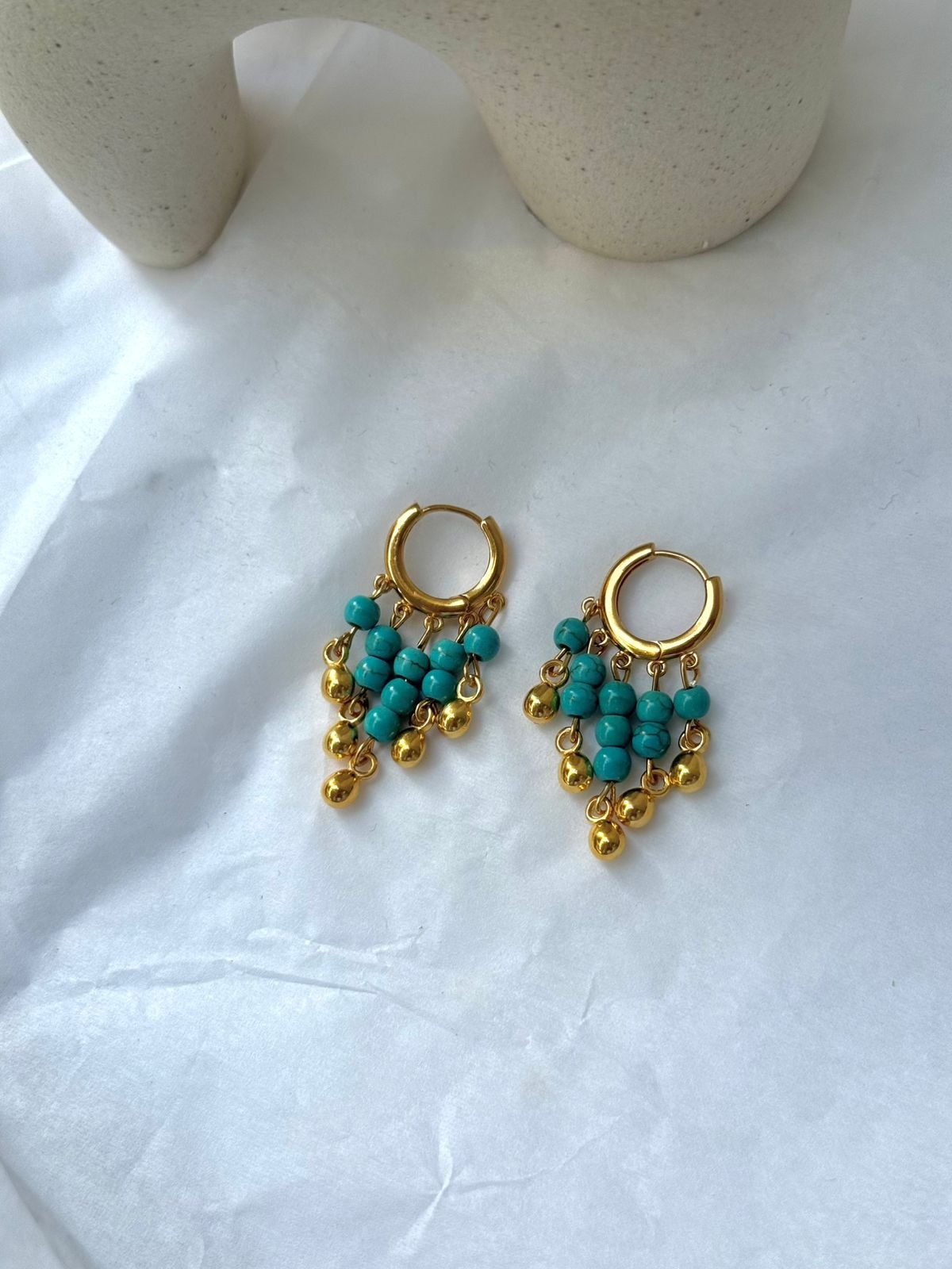 Κομψοί χρυσοί κρίκοι διακοσμημένοι με μικρές τυρκουάζ χάντρες και λεπτές χρυσές σταγόνες που κινούνται απαλά, δημιουργώντας ένα ιδιαίτερο boho-lux αποτέλεσμα. Το ζωηρό χρώμα του τυρκουάζ σε συνδυασμό με τη ζεστασιά του χρυσού χαρίζει μια καλοκαιρινή, φωτεινή πινελιά σε κάθε εμφάνιση.