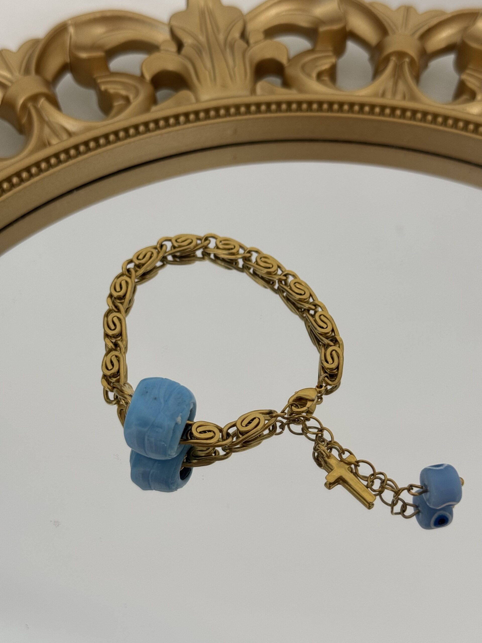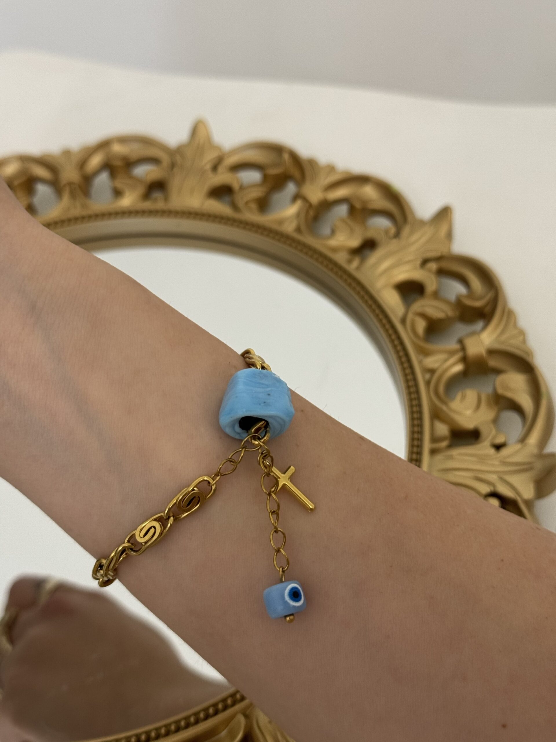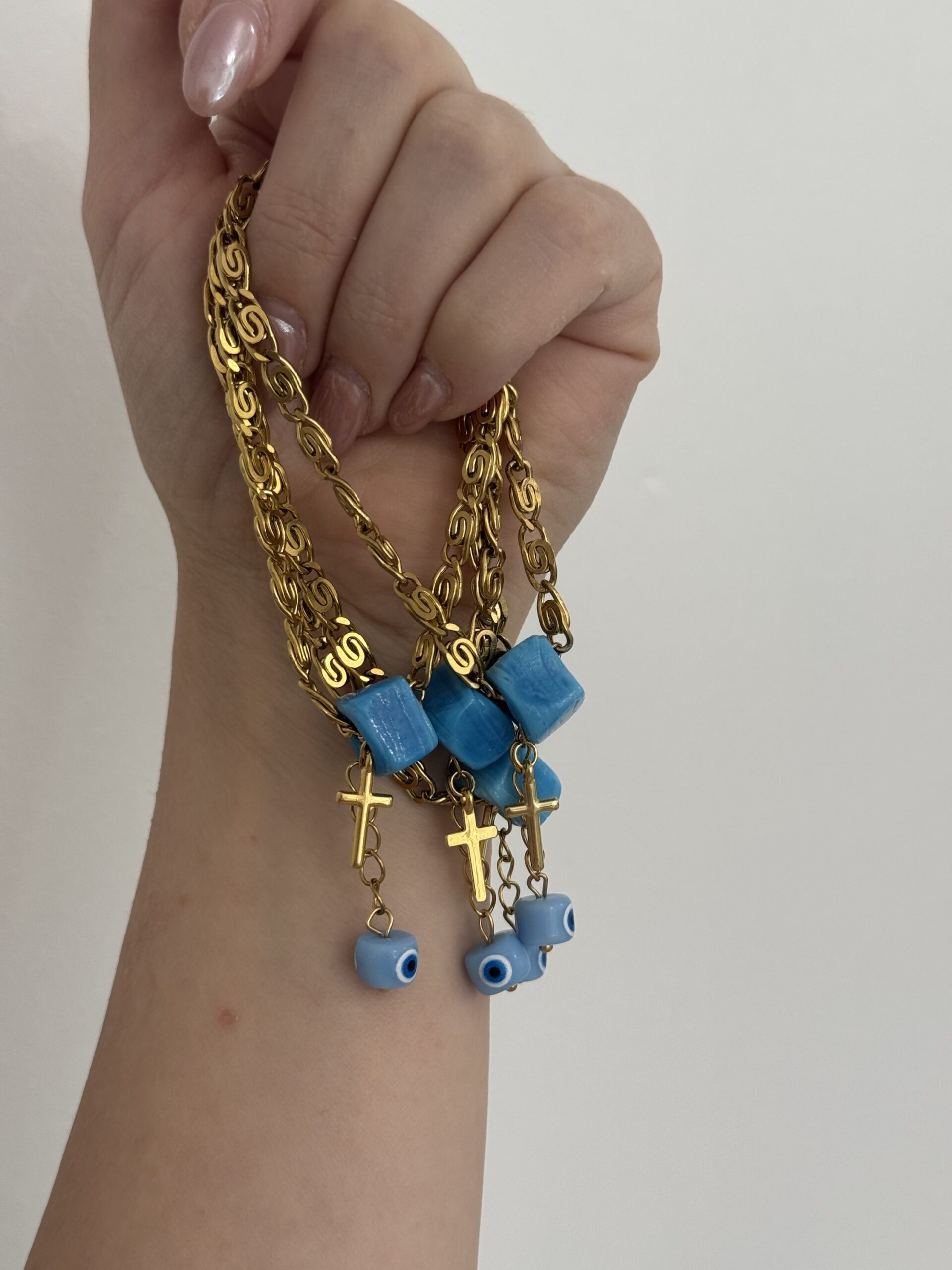 ενώ η γαλάζια χάντρα, ο σταυρός και το μάτι προσφέρουν προστασία, φως και αρμονία.