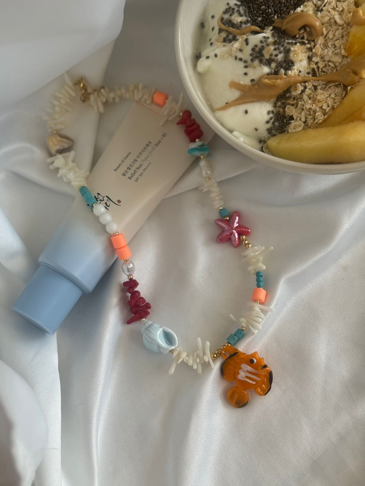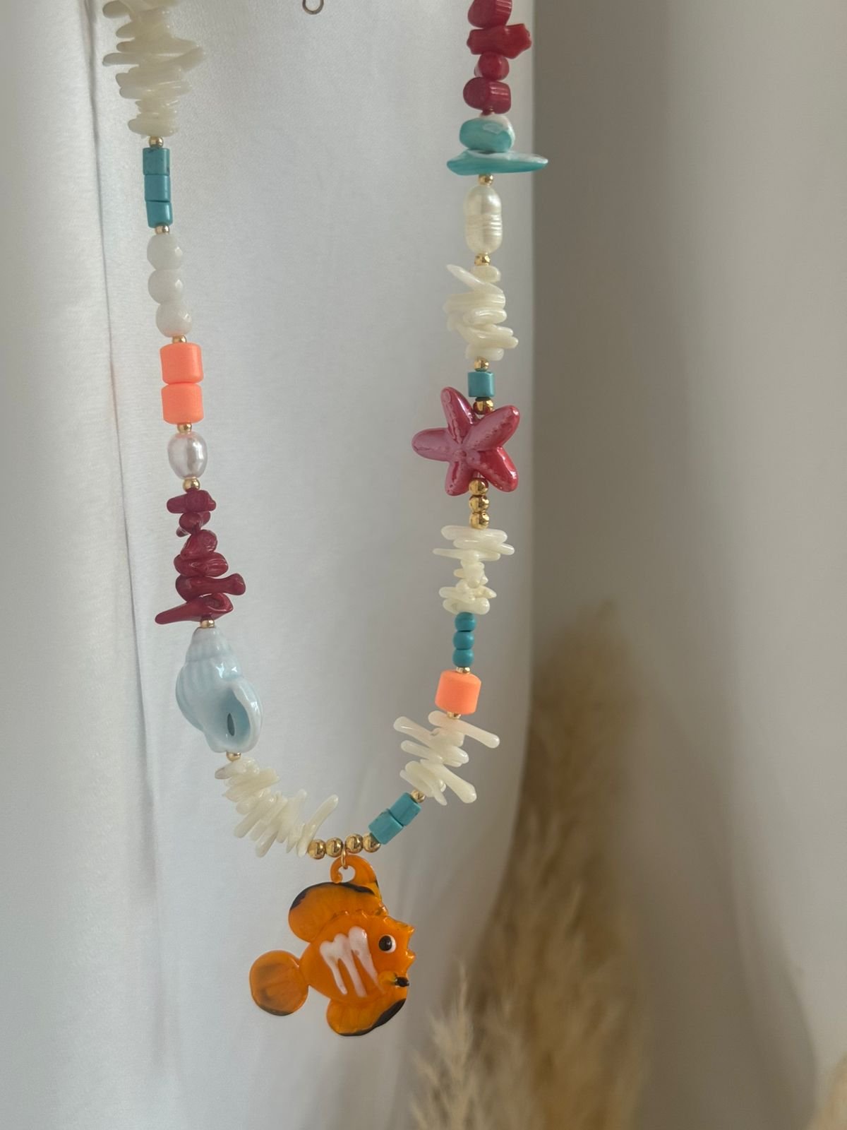 Κολιέ με Κοραλια, γυάλινα, ακρυλικά στοιχεία, ημιπολύτιμες χάντρες τσιπς και μαργαριτάρια.