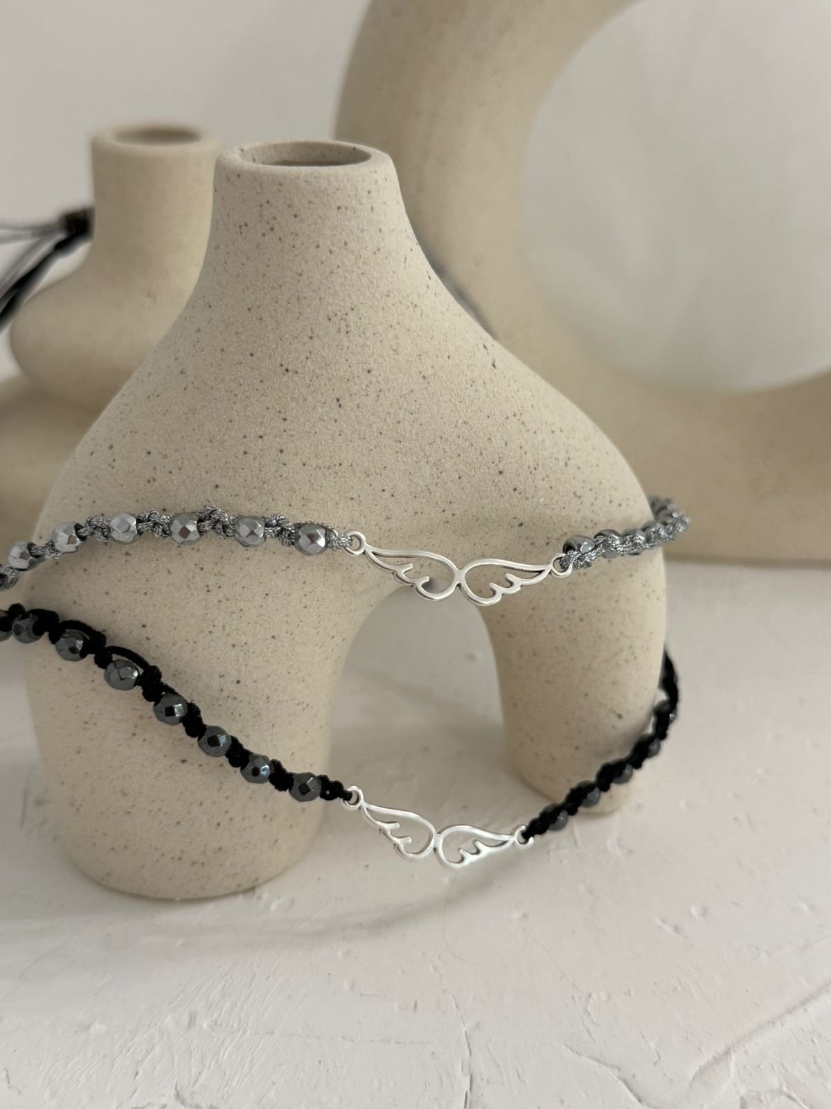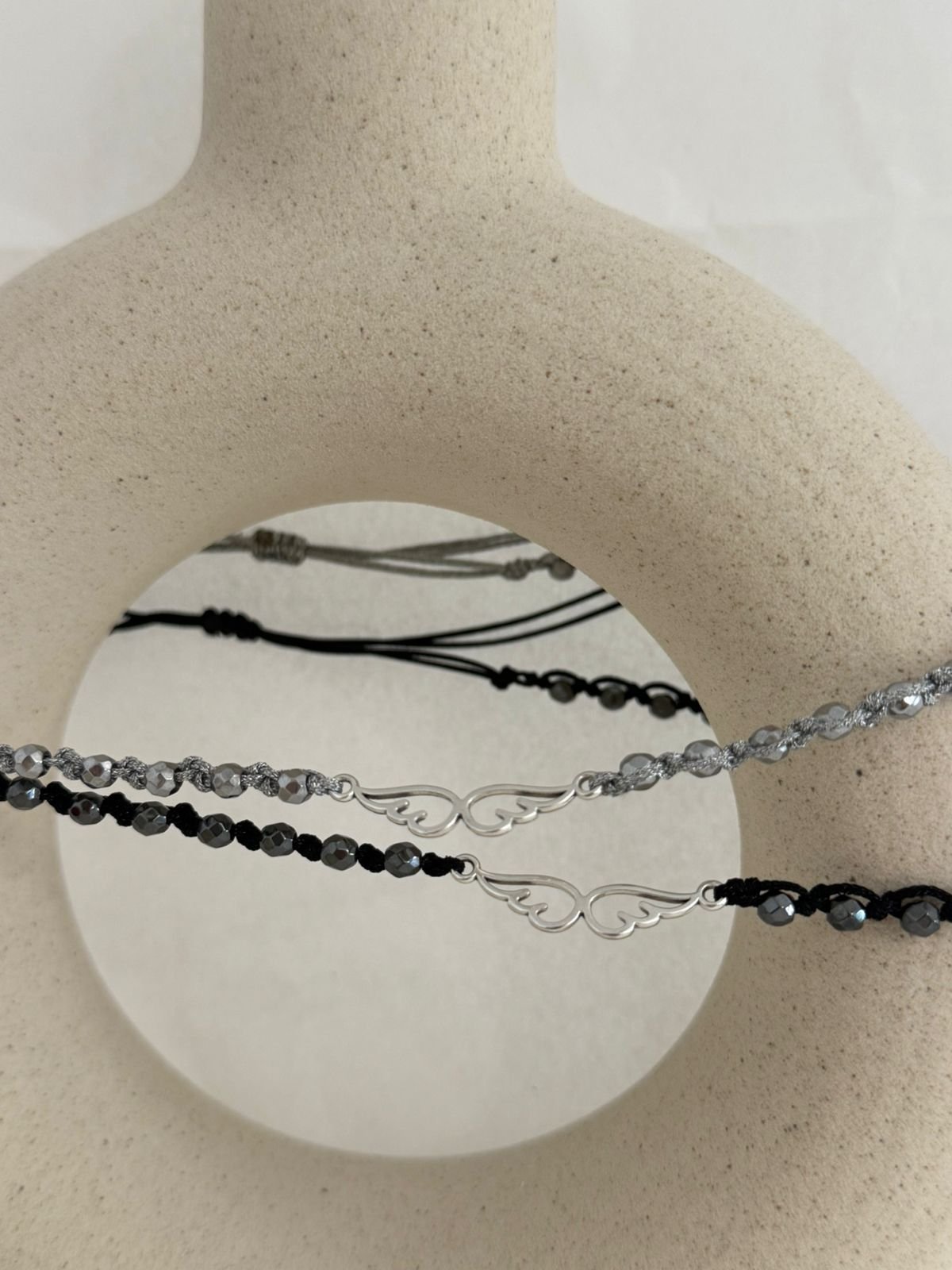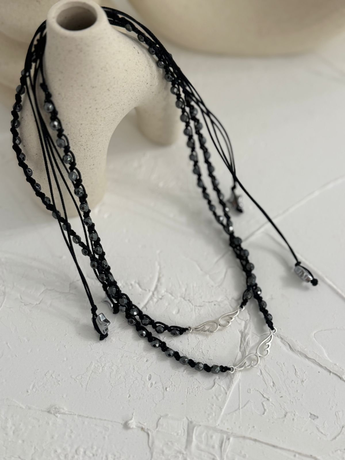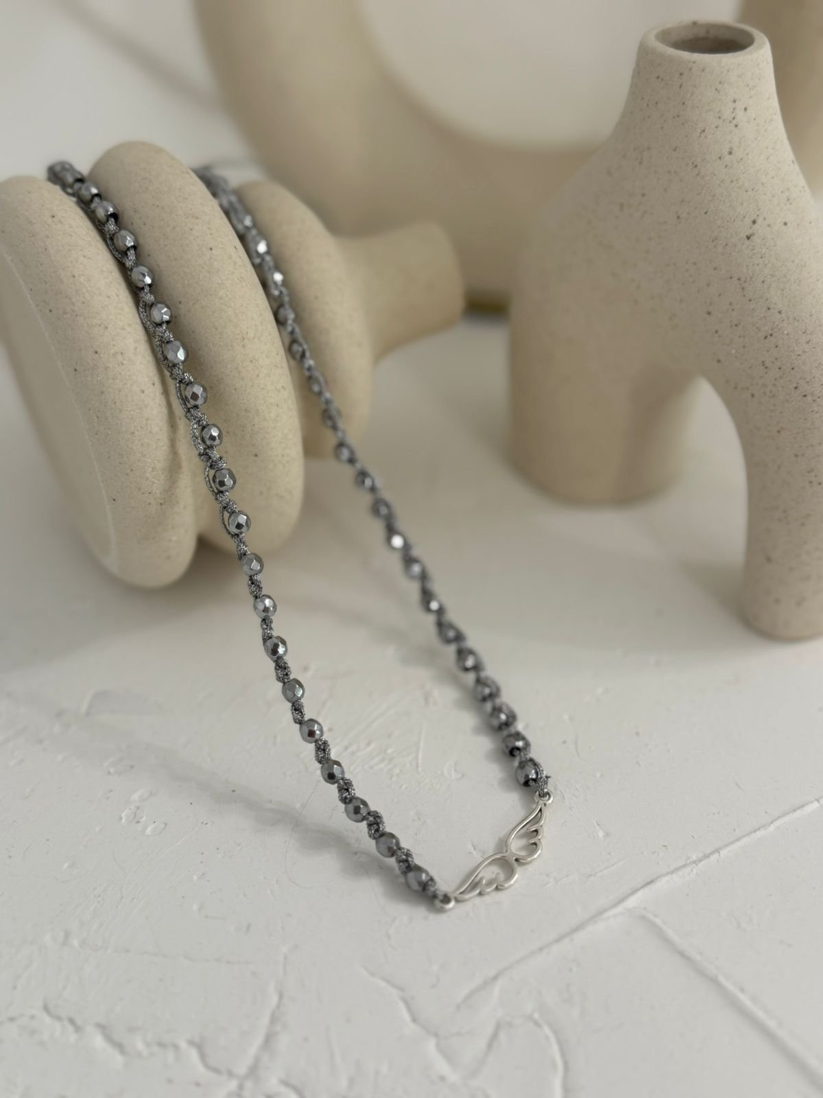 Κολιέ με φτερό, διακριτικό αλλά γεμάτο χαρακτήρα, πλεγμένο με χάντρες αιματίτη. Ένα κομμάτι που συνδυάζει ελαφρότητα και δύναμη, ιδανικό για να δώσει λάμψη και λεπτομέρεια σε κάθε σου εμφάνιση. ✨