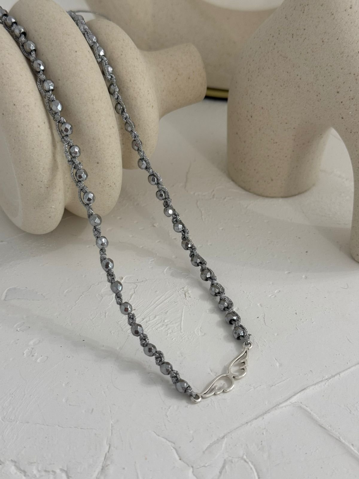 Κολιέ πλεκτό με αιμτιτες και ορειχαλκινα επαργυρωμένα στοιχεία.