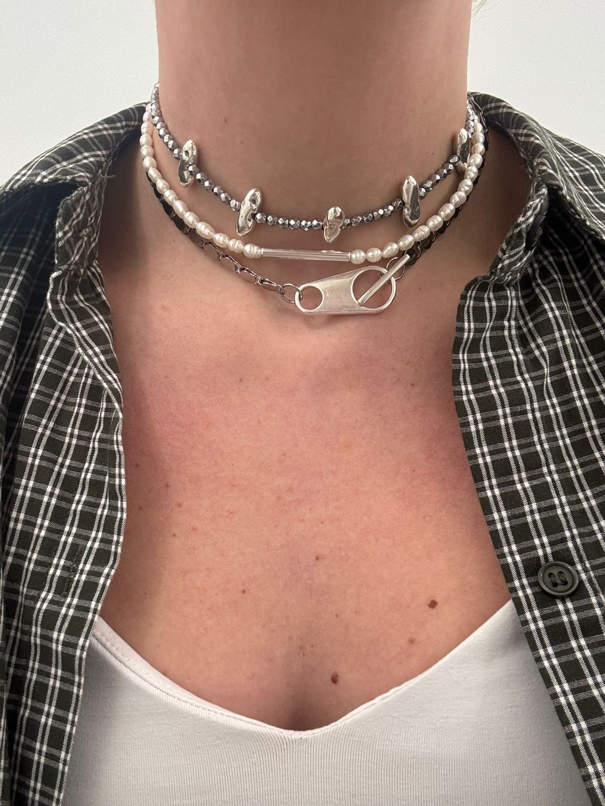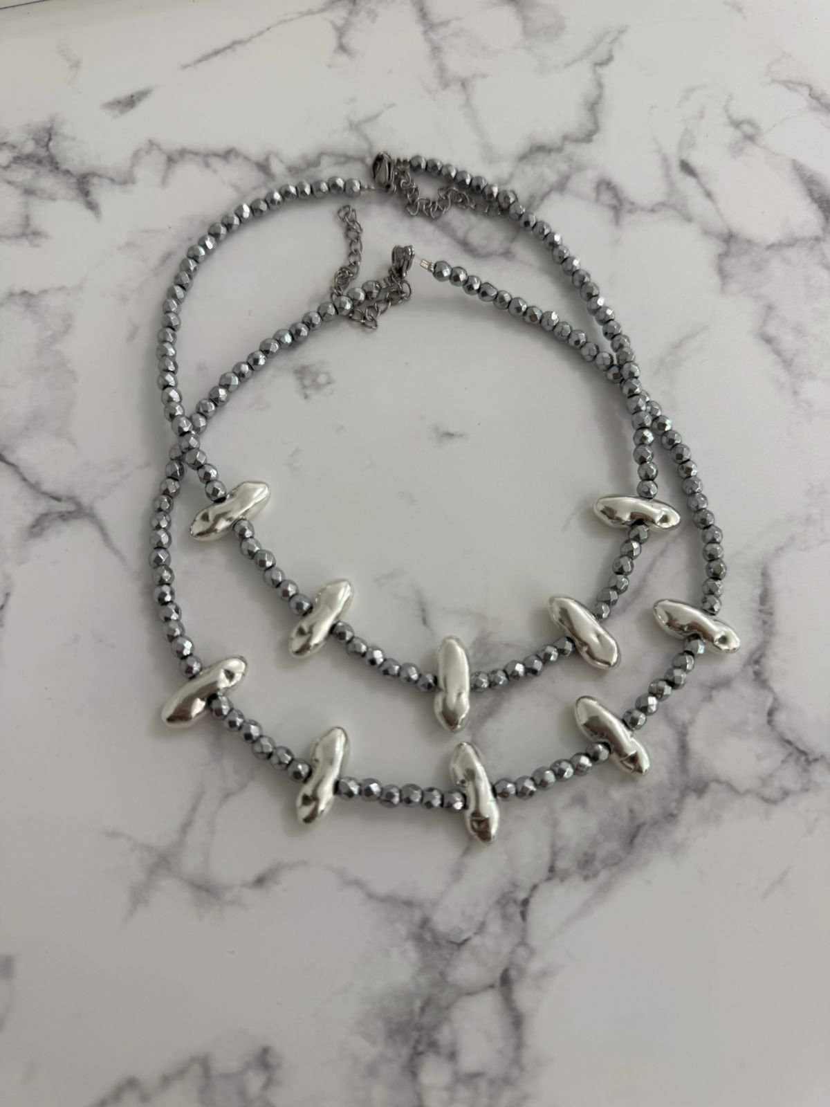Ένα ιδιαίτερο τσόκερ που συνδυάζει τη διακριτική λάμψη του αιματίτη με ακανόνιστα ασημένια στοιχεία, δημιουργώντας ένα κόσμημα με καλλιτεχνικό χαρακτήρα. Οι αντιθέσεις υφής και σχήματος προσδίδουν μοναδικότητα και αυθεντικότητα, ενώ ο αιματίτης χαρίζει βάθος και ισορροπία στο design. Φοριέται κοντά στον λαιμό και αναδεικνύει κάθε εμφάνιση με understated πολυτέλεια και σύγχρονη αισθητική.