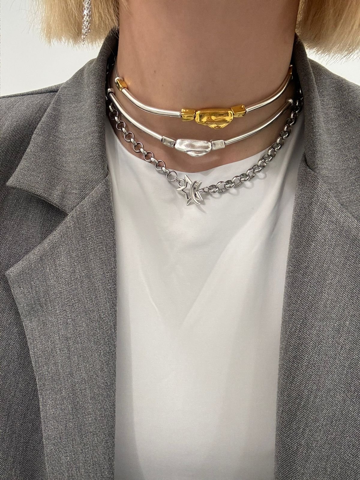 Ένα διαχρονικό κόσμημα με καθαρές γραμμές και sleek αισθητική. Η μεταλλική βέργα αγκαλιάζει απαλά το λαιμό, δημιουργώντας ένα φίνο, μοντέρνο αποτέλεσμα που δένει άψογα με κάθε look — από καθημερινό μέχρι πιο επίσημο. Ιδανικό για layering ή για να φορεθεί μόνο του όταν θέλεις ένα statement κομμάτι με διακριτική δύναμη.