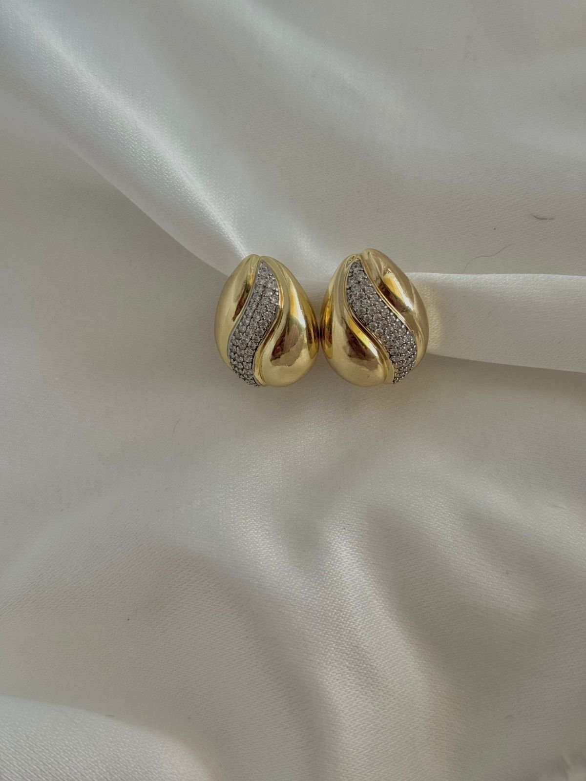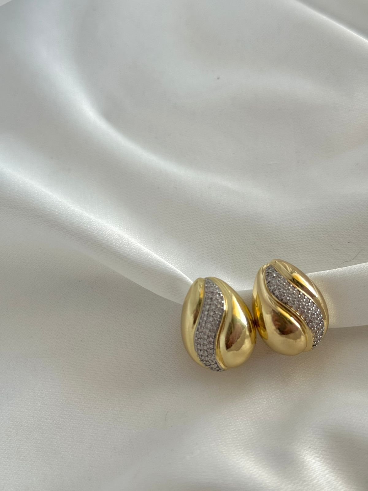 Χρυσό καρφωτό σκουλαρίκι σε κομψό οβάλ σχήμα, με μια διακριτική κυματιστή γραμμή στο κέντρο που αγκαλιάζεται από λαμπερά ασημένια στρας. Ένας εκλεπτυσμένος συνδυασμός λάμψης και κίνησης, που προσθέτει φως και χαρακτήρα σε κάθε εμφάνιση — ιδανικό τόσο για καθημερινή κομψότητα όσο και για πιο ιδιαίτερες στιγμές. ✨