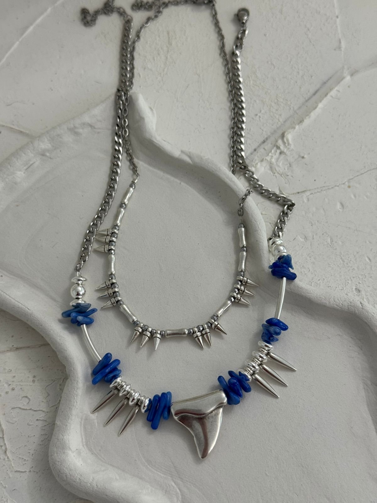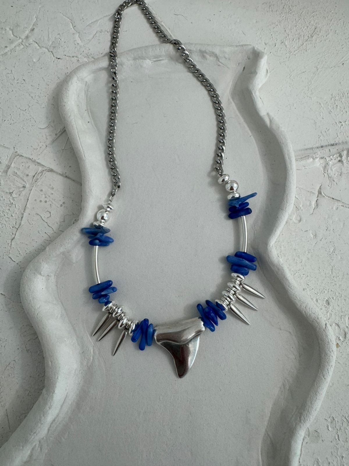 Κολιέ που συνδυάζει το έντονο μπλε με μεταλλικές λεπτομέρειες για ένα αποτέλεσμα γεμάτο χαρακτήρα. Η ασημί αλυσίδα δένει αρμονικά με τις φυσικής αισθητικής μπλε πέτρες, ενώ τα διακριτικά spikes προσθέτουν μια μοντέρνα, edgy διάθεση. Στο κέντρο, το μεταλλικό στοιχείο σε οργανικό σχήμα λειτουργεί ως statement λεπτομέρεια που τραβάει το βλέμμα.