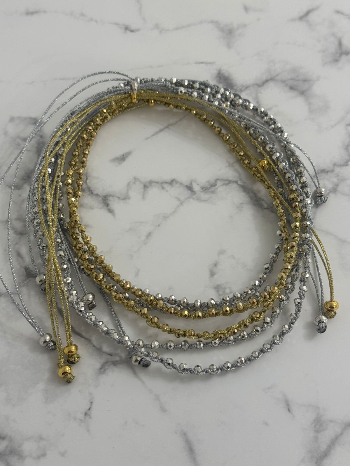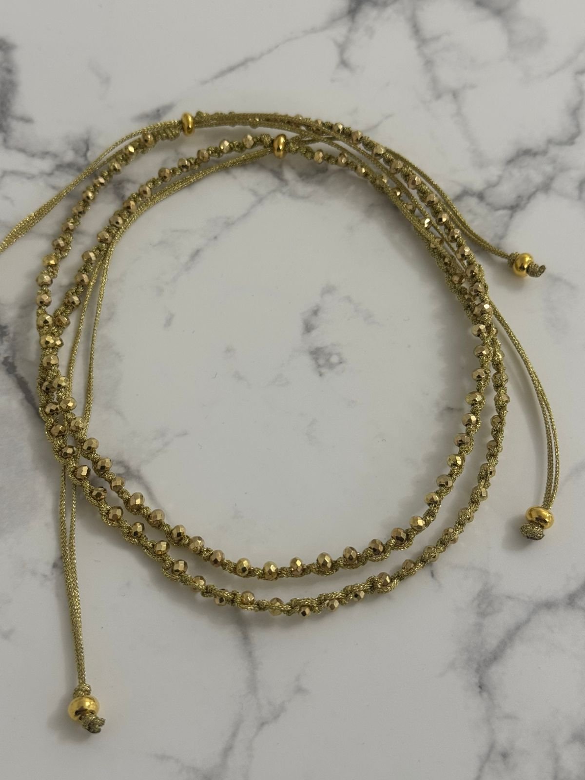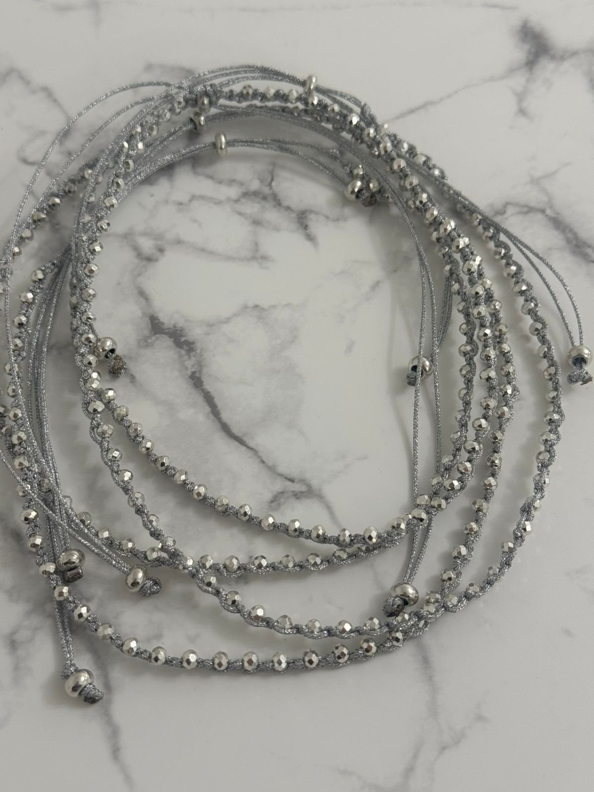 Ένα χειροποίητο κολιέ πλεγμένο με γυαλιστερές χάντρες, σχεδιασμένο για να προσαρμόζεται στη διάθεσή σου. Χάρη στον μηχανισμό αυξομείωσης, φοριέται όπως εσύ θέλεις: από πολύ κοντό choker που αγκαλιάζει τον λαιμό, μέχρι πιο μακρύ και αέρινο. Ευέλικτο, λαμπερό και απόλυτα προσωπικό — ένα κόσμημα που αλλάζει μαζί σου.