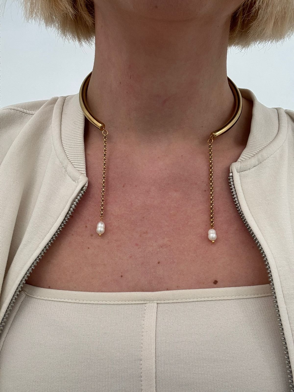 Κομψή ατσάλινη λαιμαριά με ιδιαίτερο, πολυμορφικό σχεδιασμό που σου δίνει τη δυνατότητα να τη φορέσεις με δύο διαφορετικούς τρόπους. Από τη μία πλευρά, διατηρεί ένα minimal και καθαρό ύφος, ιδανικό για διακριτικές και elegant εμφανίσεις. Από την άλλη, αποκαλύπτει μια εντυπωσιακή λεπτομέρεια στο πίσω μέρος: αλυσίδα που καταλήγει σε μαργαριτάρια, προσθέτοντας κίνηση και θηλυκή φινέτσα.