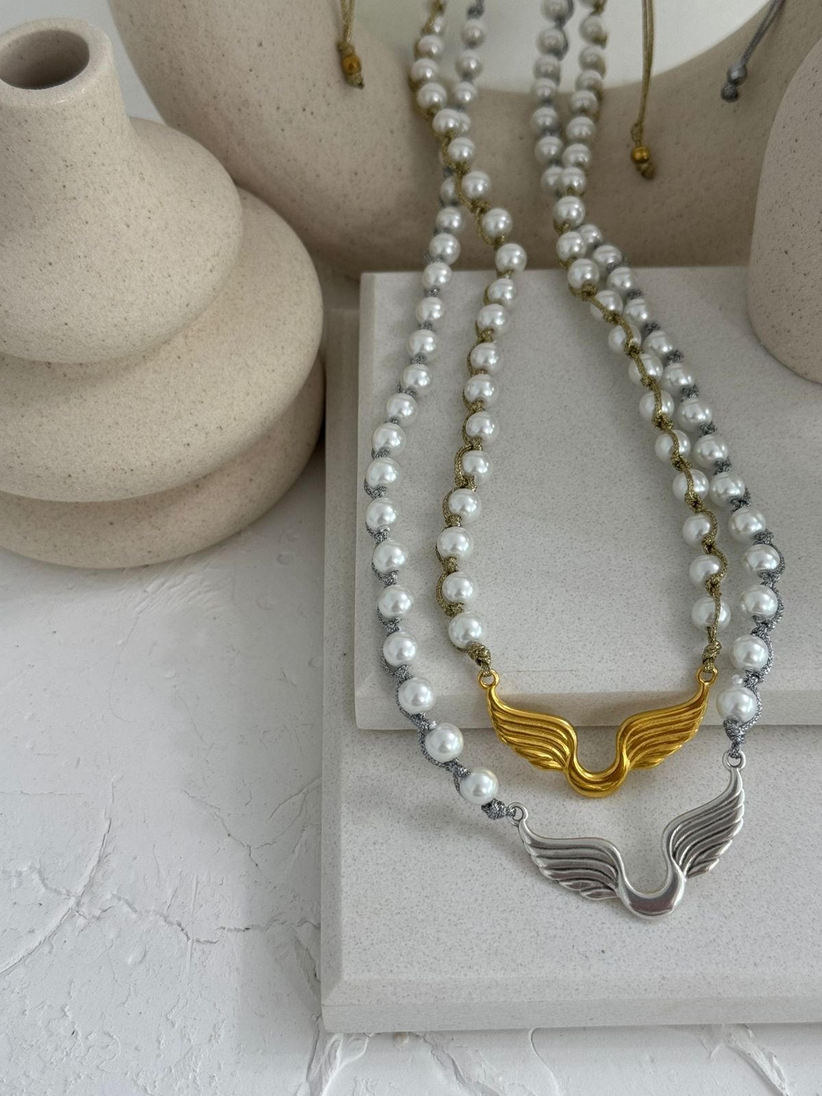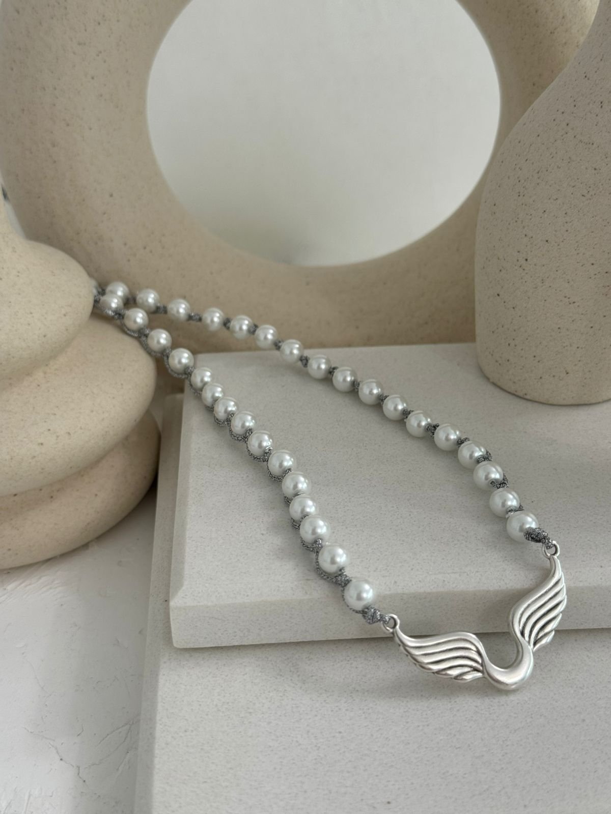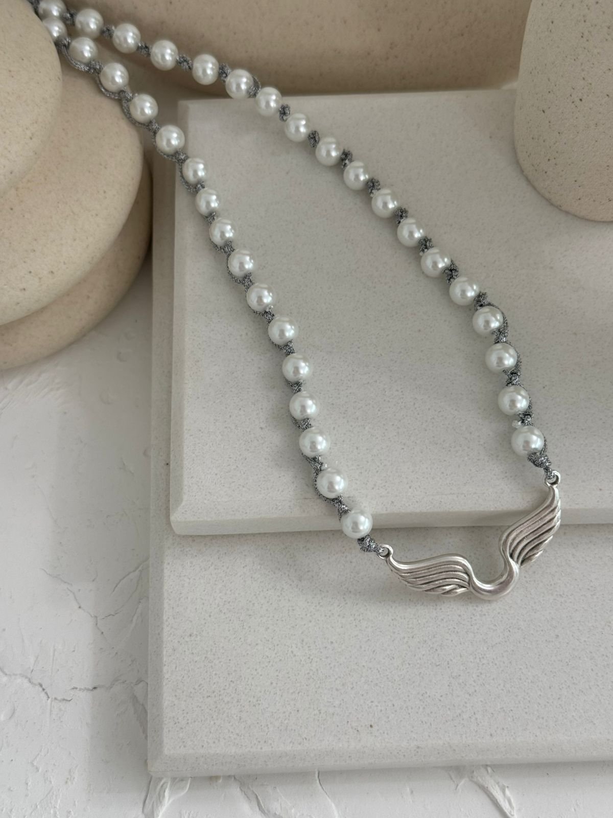 Ένα διακριτικό κόσμημα που ενώνει την αιώνια κομψότητα των λευκών περλών με τη συμβολική δύναμη των φτερών του αγγέλου. Οι πέρλες αποπνέουν καθαρότητα και θηλυκότητα, ενώ το φτερό λειτουργεί σαν φυλαχτό, υπενθυμίζοντας προστασία, ελπίδα και εσωτερική γαλήνη. Ιδανικό για να ολοκληρώσει ένα ρομαντικό ή μίνιμαλ look, χαρίζοντας μια αίσθηση φωτεινότητας και τρυφερότητας.