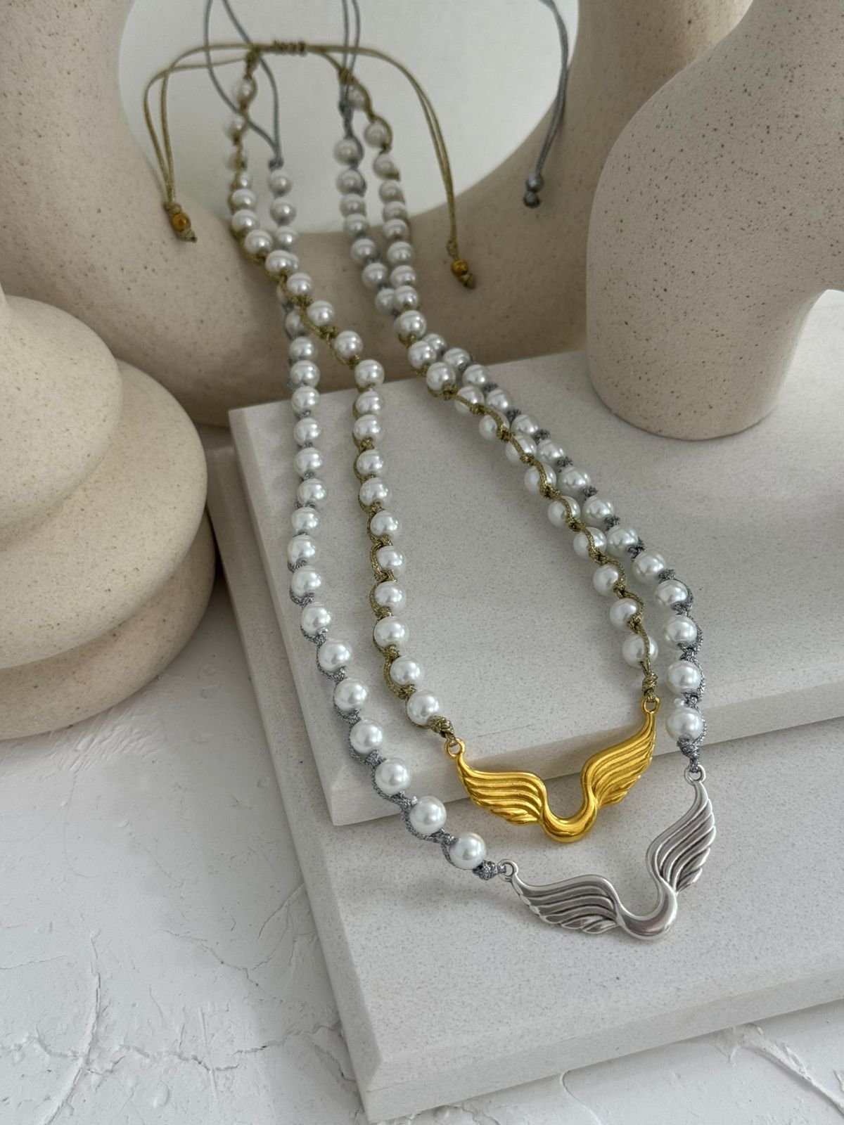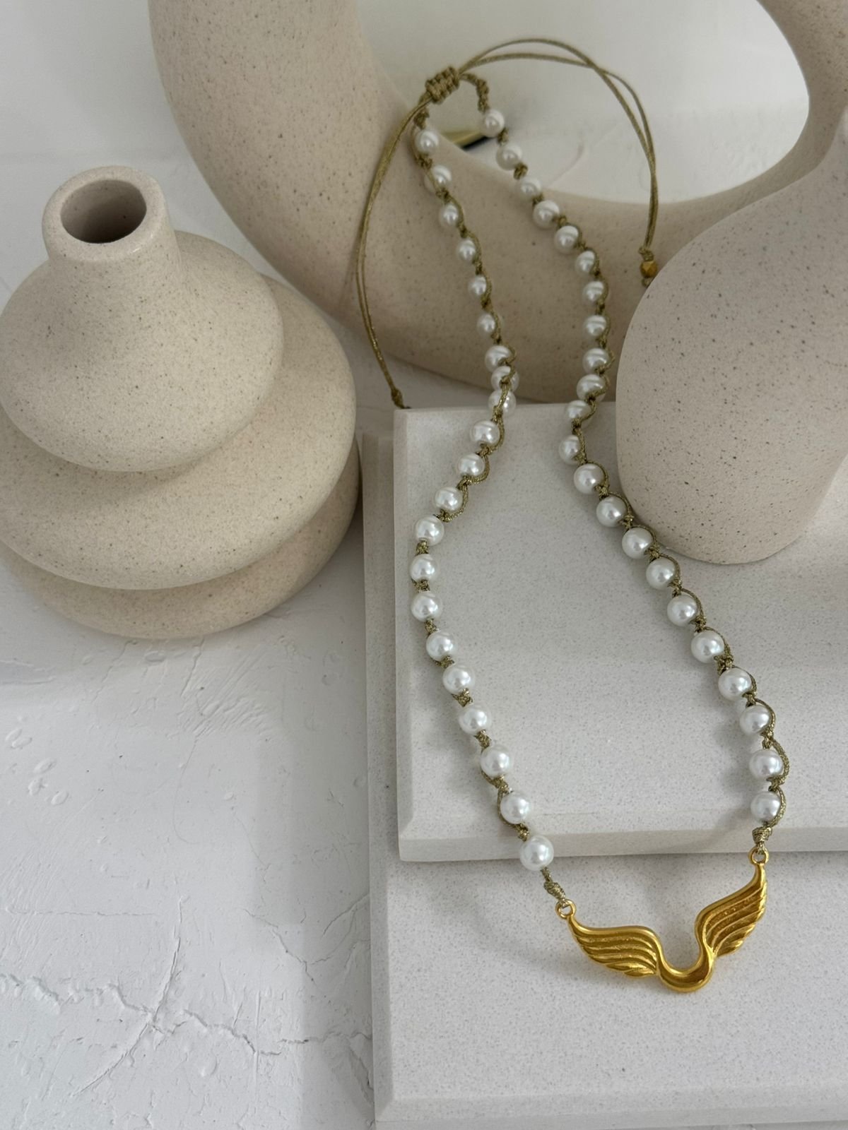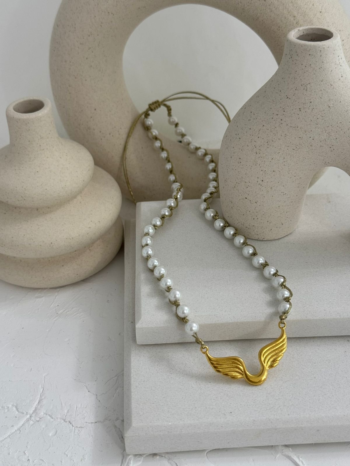 Ένα διακριτικό κόσμημα που ενώνει την αιώνια κομψότητα των λευκών περλών με τη συμβολική δύναμη των φτερών του αγγέλου. Οι πέρλες αποπνέουν καθαρότητα και θηλυκότητα, ενώ το φτερό λειτουργεί σαν φυλαχτό, υπενθυμίζοντας προστασία, ελπίδα και εσωτερική γαλήνη. Ιδανικό για να ολοκληρώσει ένα ρομαντικό ή μίνιμαλ look, χαρίζοντας μια αίσθηση φωτεινότητας και τρυφερότητας.