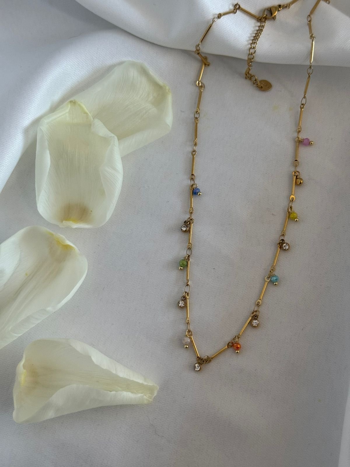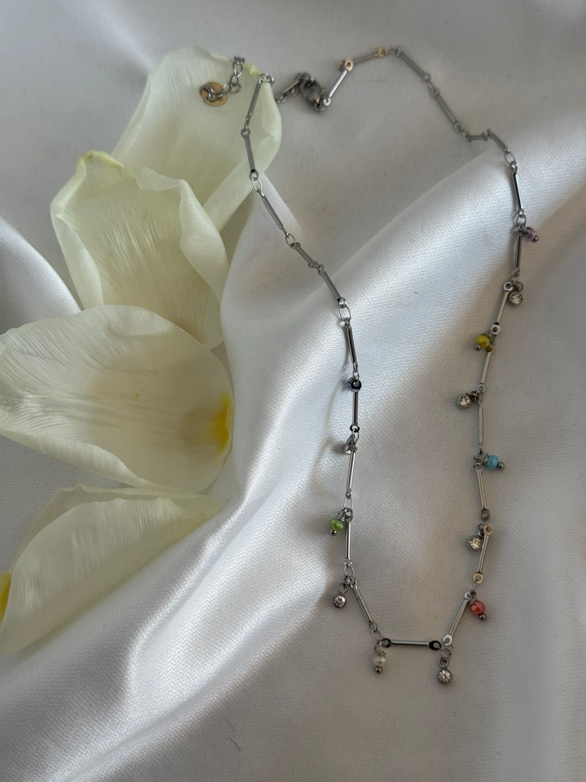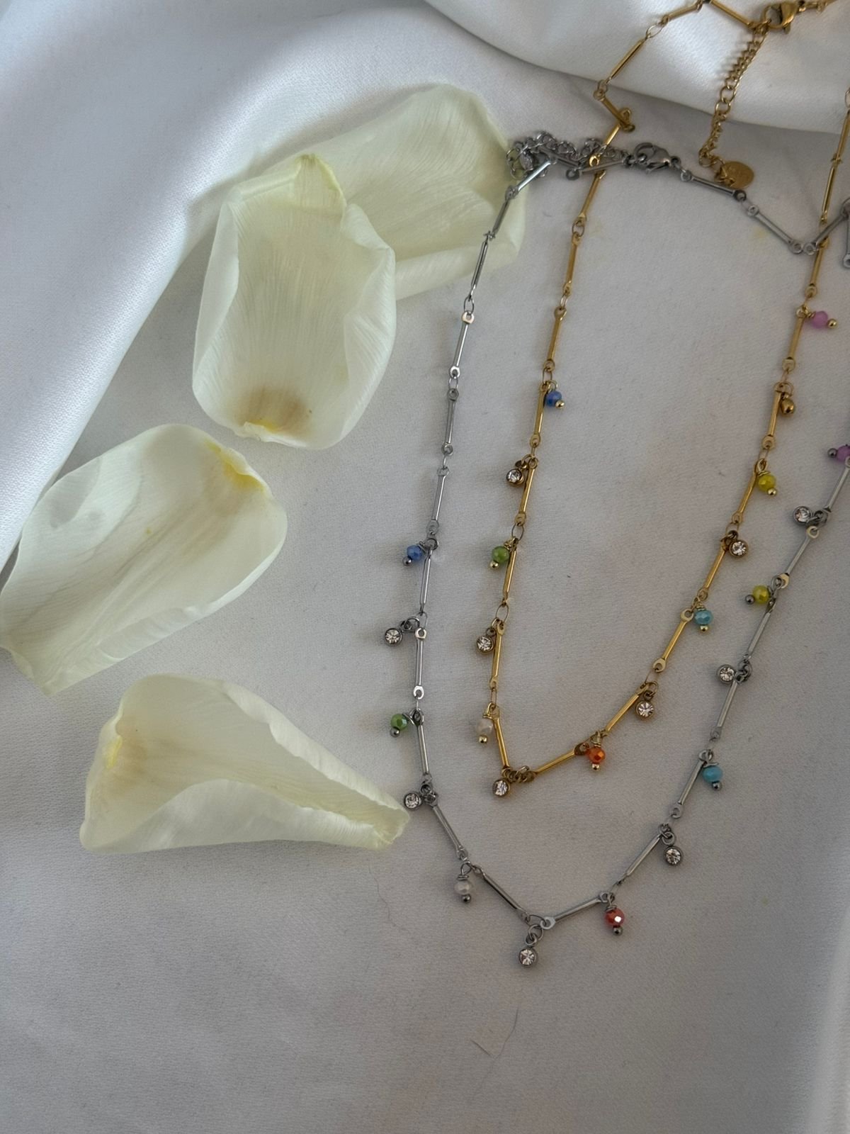 Λεπτεπίλεπτο και κομψό, αυτό το κοντό κολιέ αγκαλιάζει διακριτικά τον λαιμό, χαρίζοντας μια ανεπιτήδευτη λάμψη. Διακοσμημένο με mini στρας που αιχμαλωτίζουν το φως σε κάθε κίνηση και μικρά χρωματιστά κρύσταλλα που κρέμονται παιχνιδιάρικα, δημιουργεί ένα φίνο αλλά ζωντανό αποτέλεσμα. Ιδανικό για layering ή για να φορεθεί μόνο του, προσθέτει μια δόση διακριτικής πολυτέλειας σε κάθε εμφάνιση.