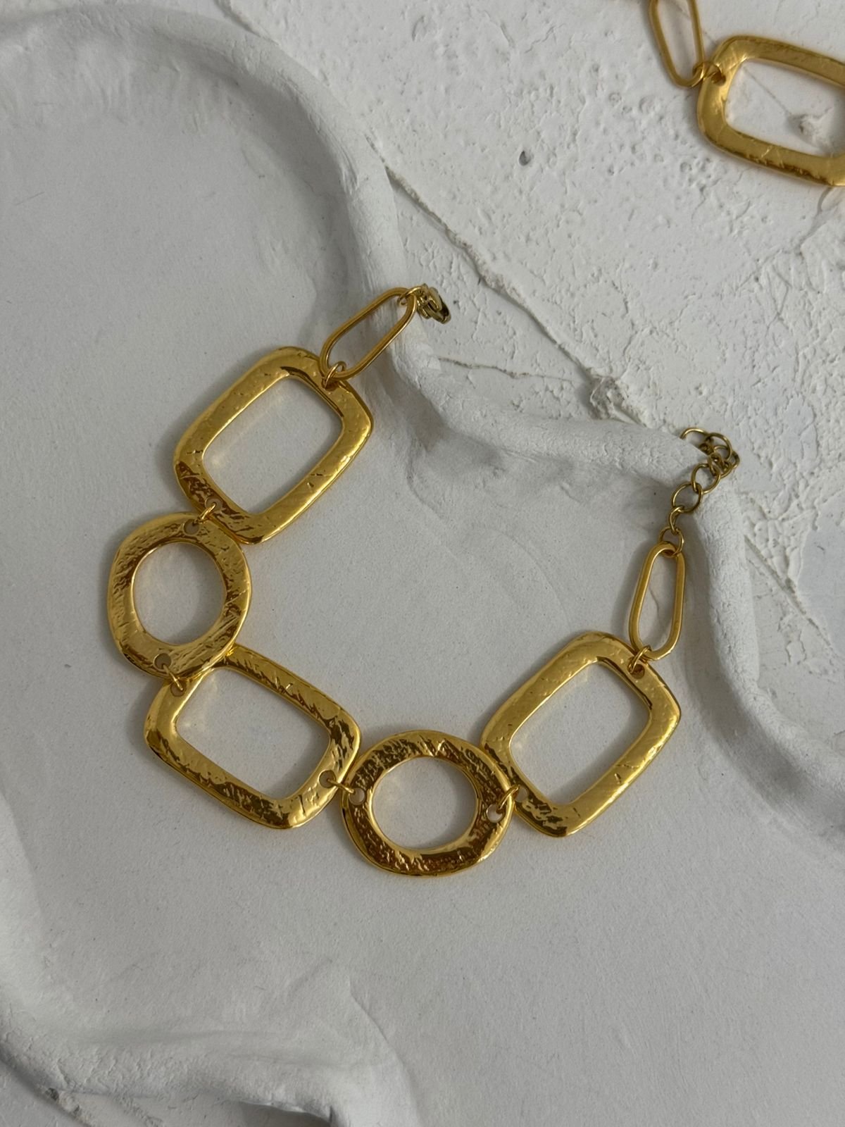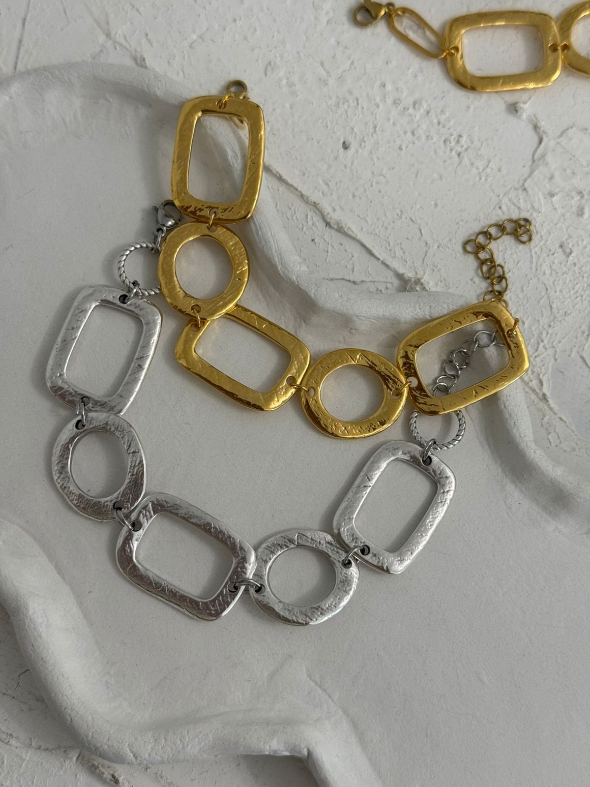 Μοντέρνο βραχιόλι με γεωμετρικό σχεδιασμό που αποπνέει δυναμική κομψότητα και σύγχρονο χαρακτήρα. Οι καθαρές γραμμές και τα συμμετρικά σχήματα δημιουργούν ένα ιδιαίτερο αποτέλεσμα που ξεχωρίζει χωρίς υπερβολές.