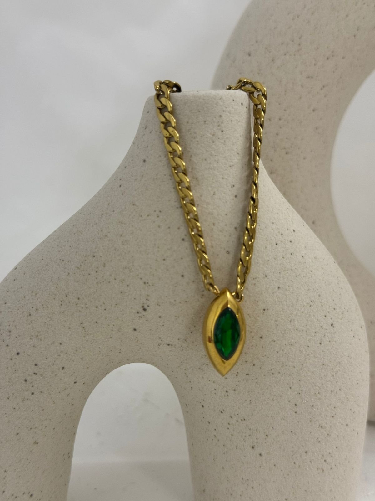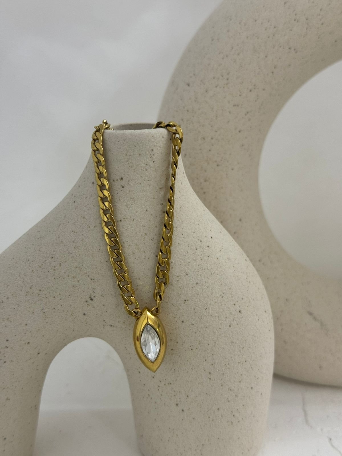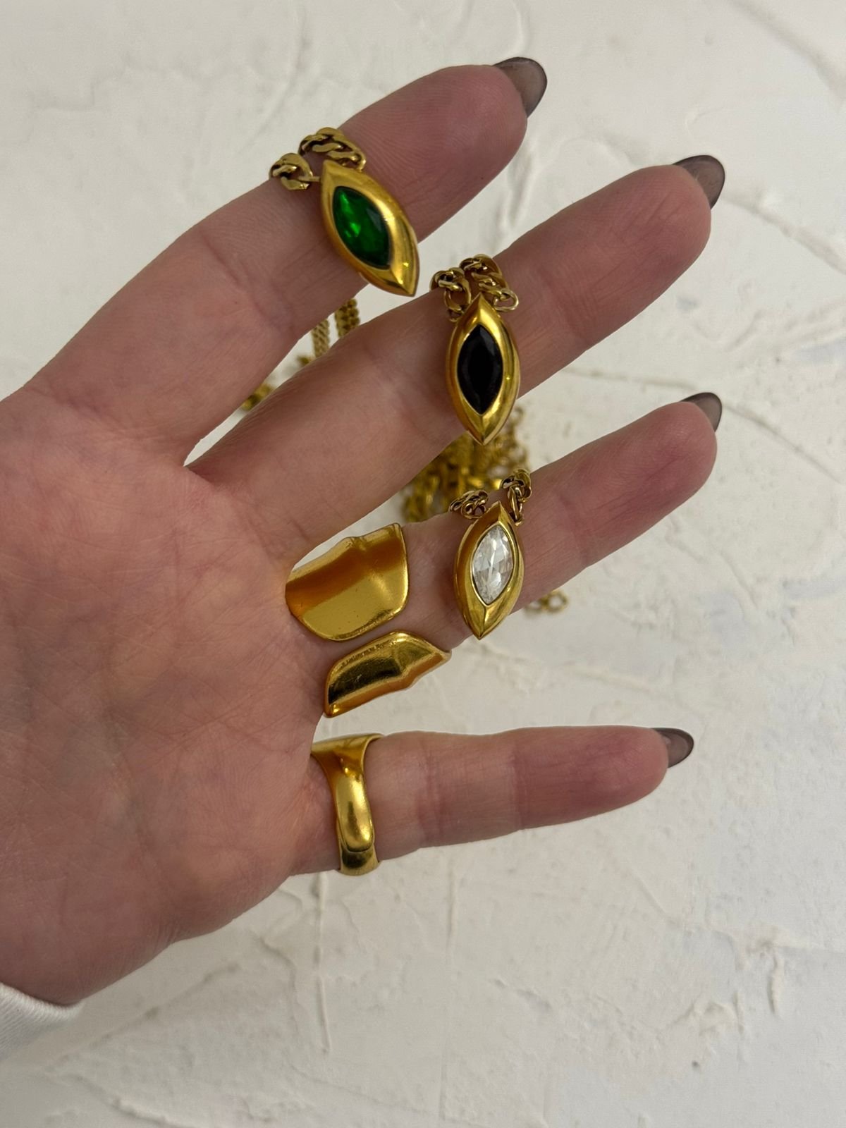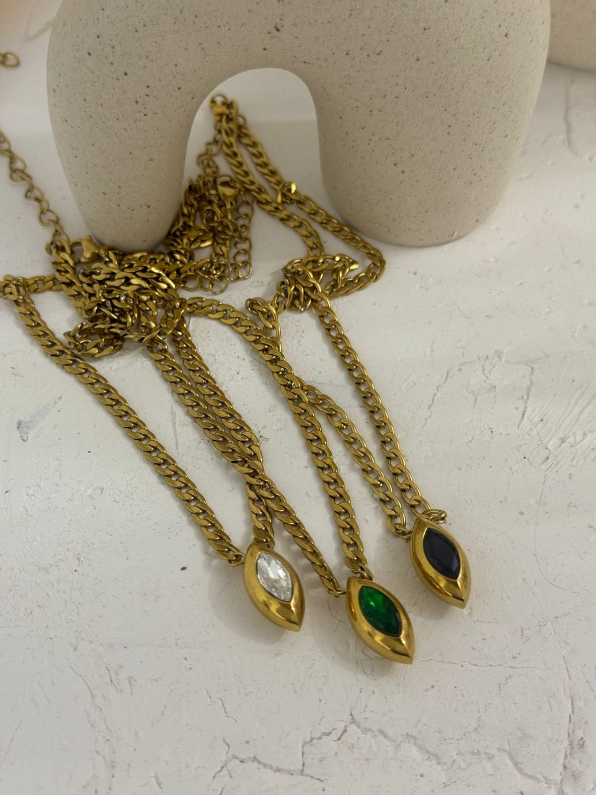 Ένα κομψό choker που αγκαλιάζει τον λαιμό με διακριτική λάμψη. Στο κέντρο δεσπόζει ένα φίνο δάκρυ, σύμβολο θηλυκότητας και κομψότητας, ενώ τα στρας σε λευκό, μαύρο και πράσινο δημιουργούν μια εκλεπτυσμένη αντίθεση που τραβά το βλέμμα. Ένα κόσμημα που ισορροπεί ανάμεσα στο minimal και το glamorous, ιδανικό για να αναδείξει τόσο βραδινές όσο και πιο fashion-forward εμφανίσεις.