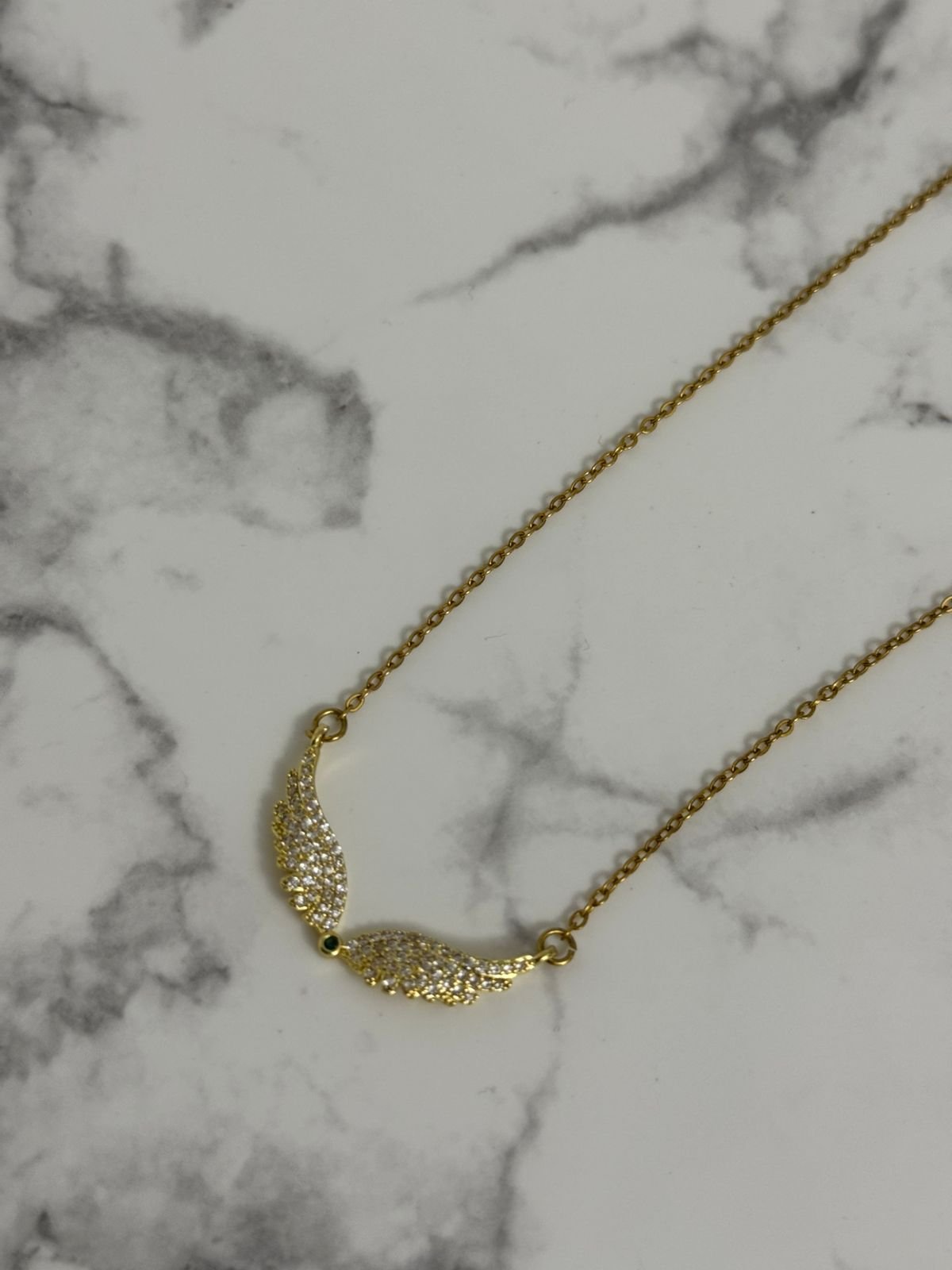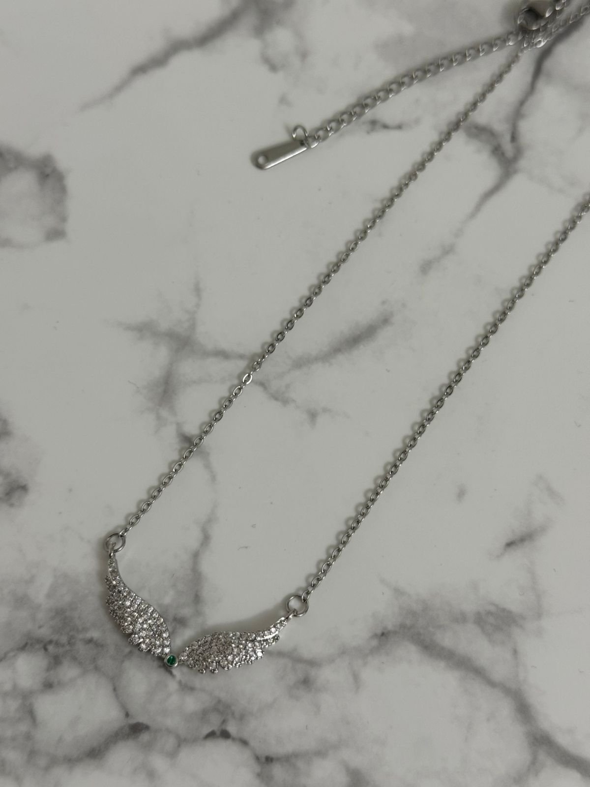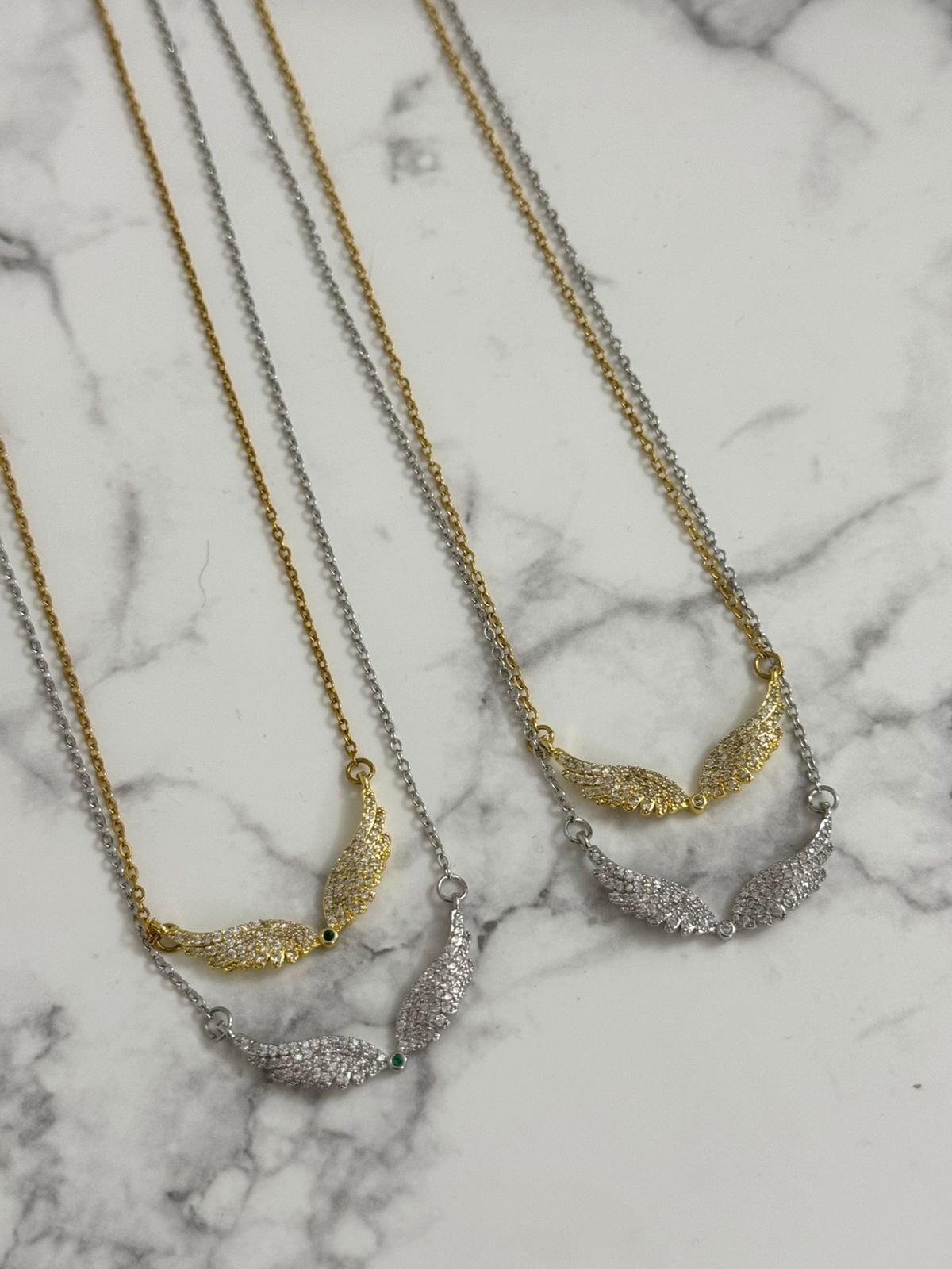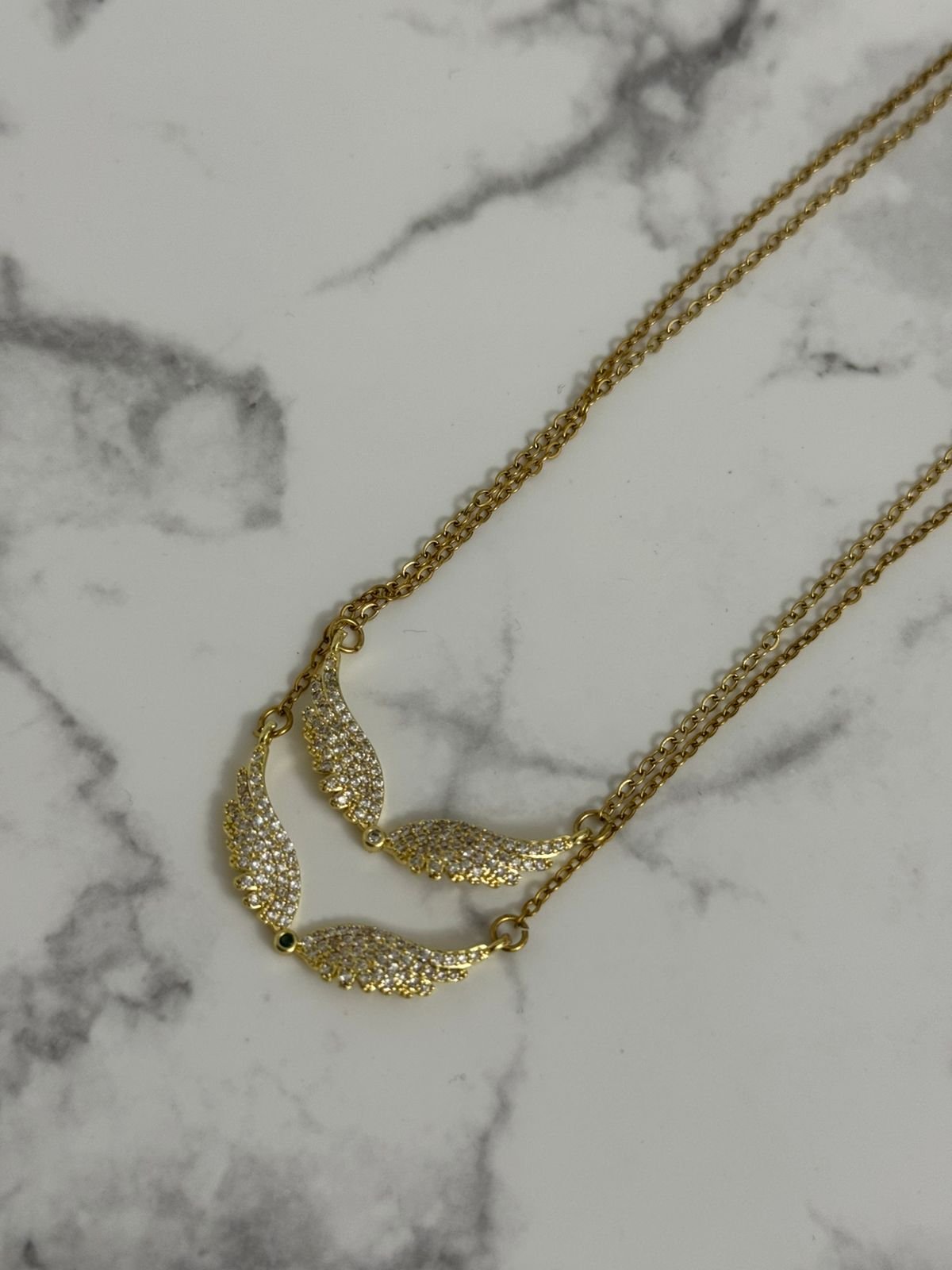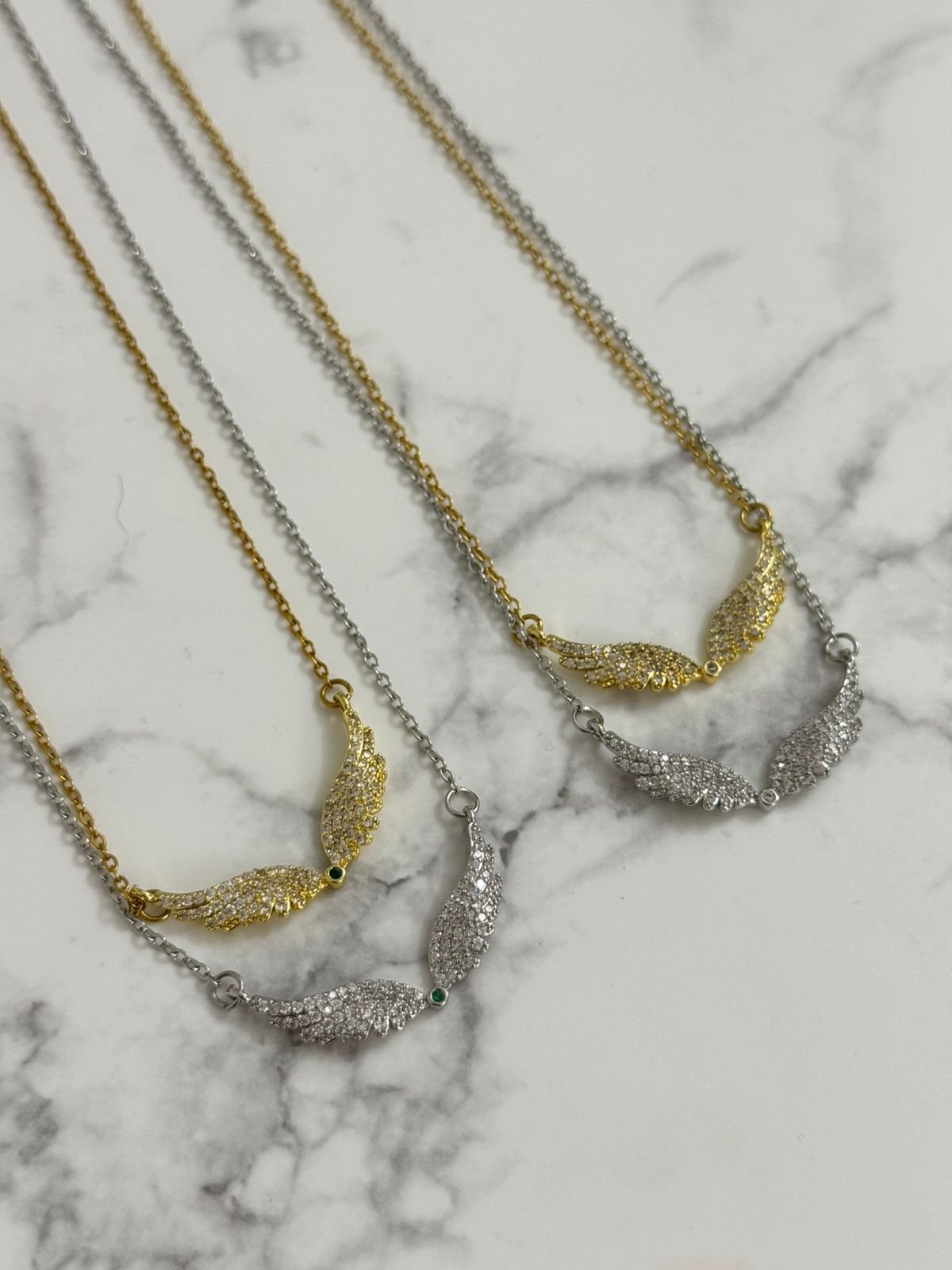 Λεπτό κολιέ με κομψά φτερά, διακοσμημένα με διακριτικά στρας που χαρίζουν μια απαλή λάμψη σε κάθε κίνηση. Ένα αέρινο και θηλυκό κόσμημα, ιδανικό για καθημερινές εμφανίσεις αλλά και για πιο ρομαντικές βραδινές στιγμές, που συμβολίζει την ελευθερία και τη διακριτική πολυτέλεια.