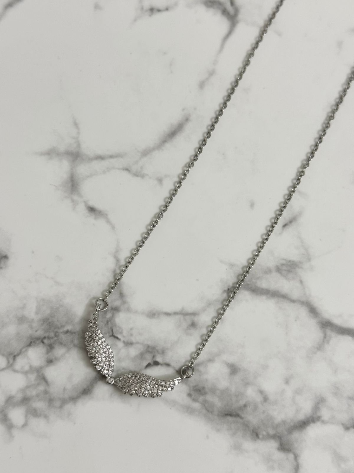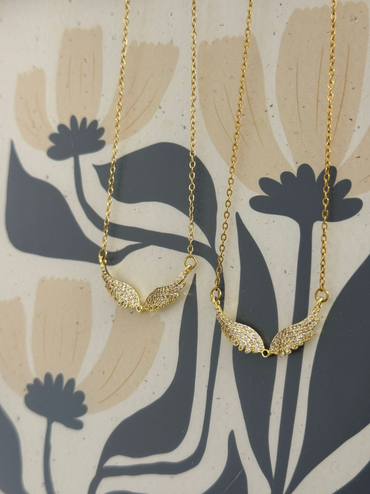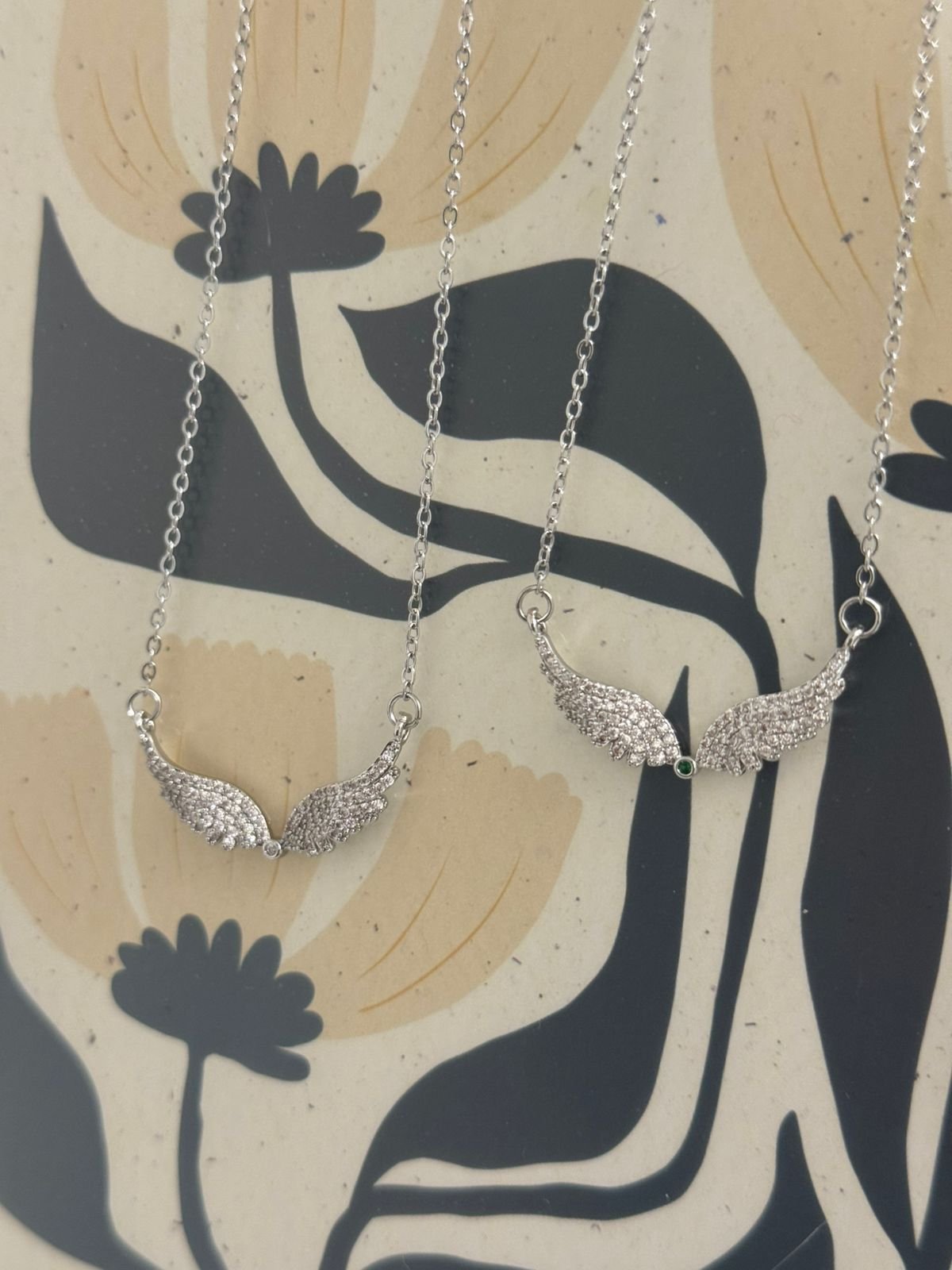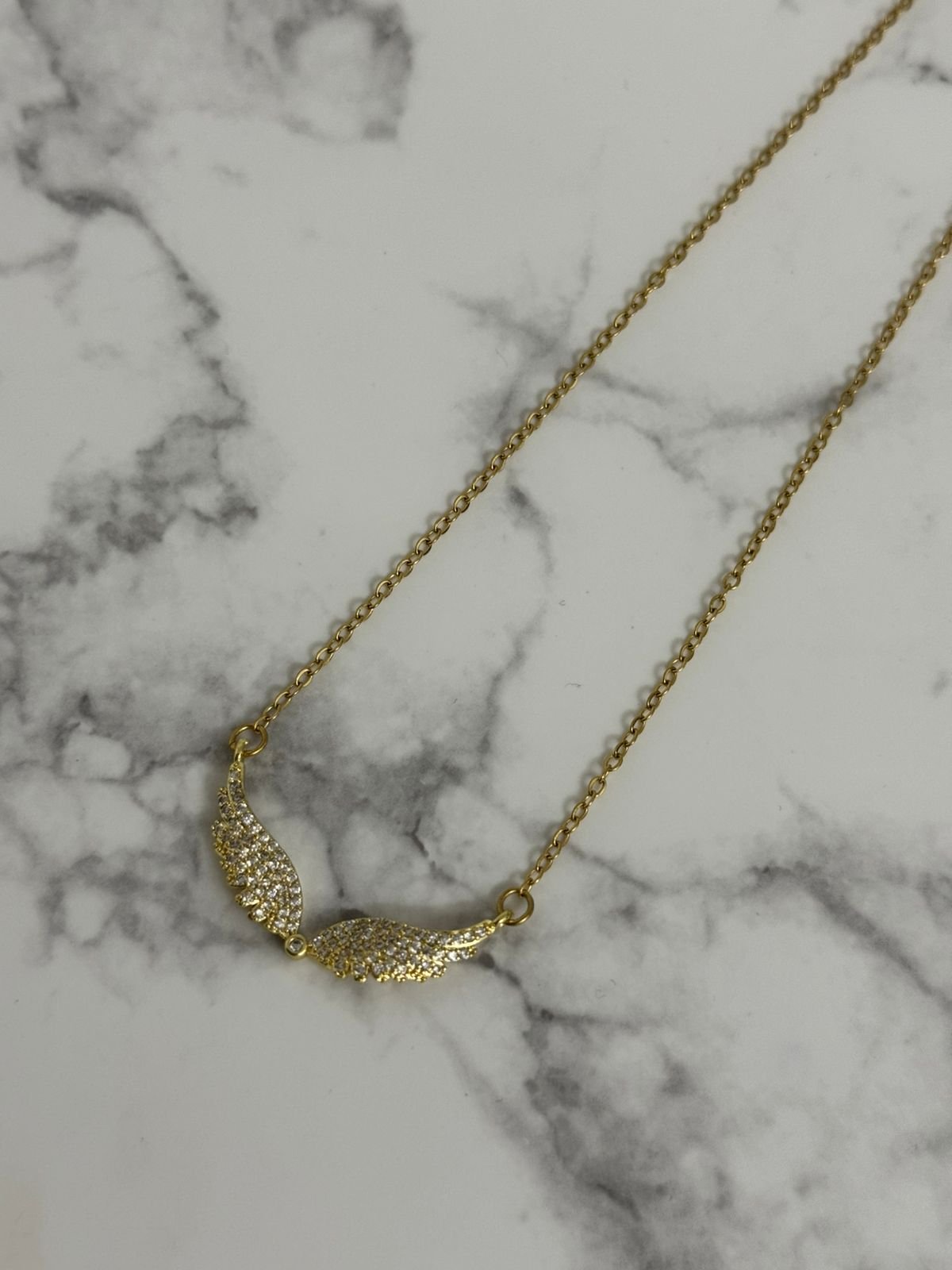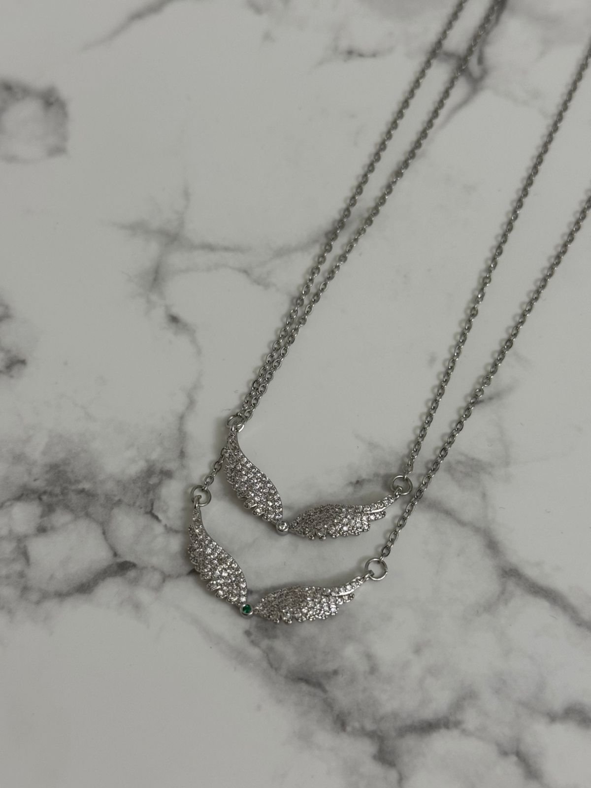 Λεπτό κολιέ με κομψά φτερά, διακοσμημένα με διακριτικά στρας που χαρίζουν μια απαλή λάμψη σε κάθε κίνηση. Ένα αέρινο και θηλυκό κόσμημα, ιδανικό για καθημερινές εμφανίσεις αλλά και για πιο ρομαντικές βραδινές στιγμές, που συμβολίζει την ελευθερία και τη διακριτική πολυτέλεια.