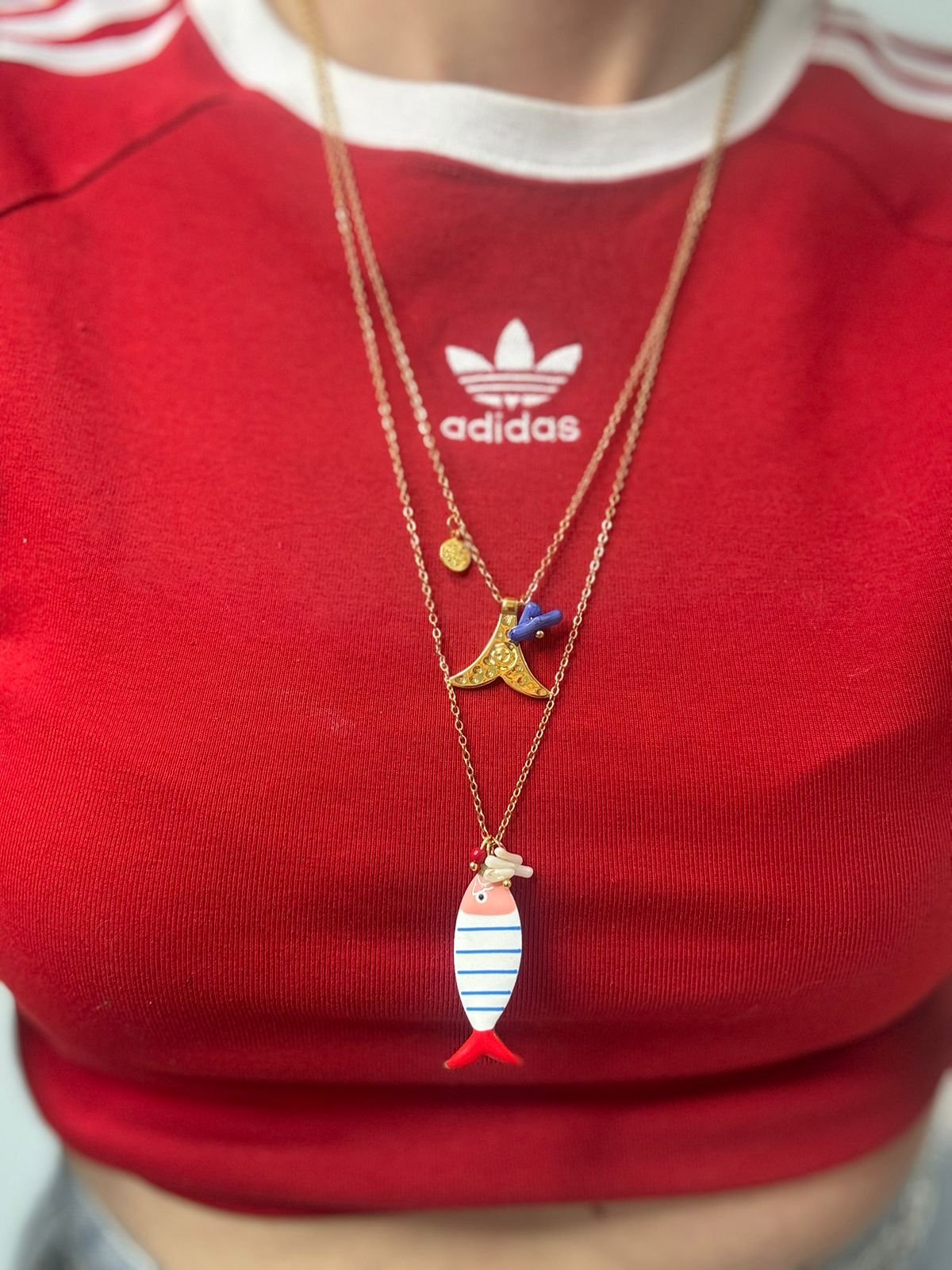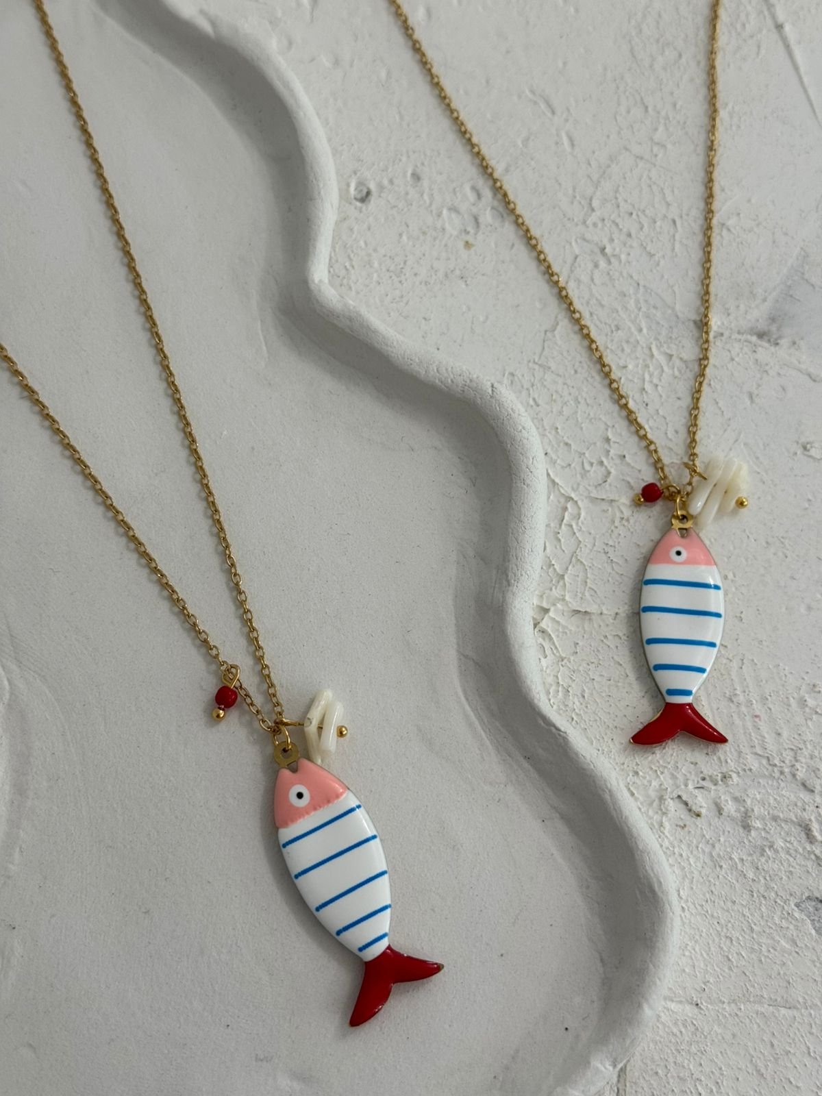 Κομψό και παιχνιδιάρικο, αυτό το χειροποίητο κολιέ με μοτίβο ψαράκι φέρνει αέρα καλοκαιριού σε κάθε εμφάνιση. Η λεπτεπίλεπτη αλυσίδα σε χρυσό τόνο αγκαλιάζει ένα ιδιαίτερο charm σε σχήμα ψαριού, με λευκή βάση, μπλε ρίγες και κόκκινες λεπτομέρειες που θυμίζουν ελληνικό νησί.