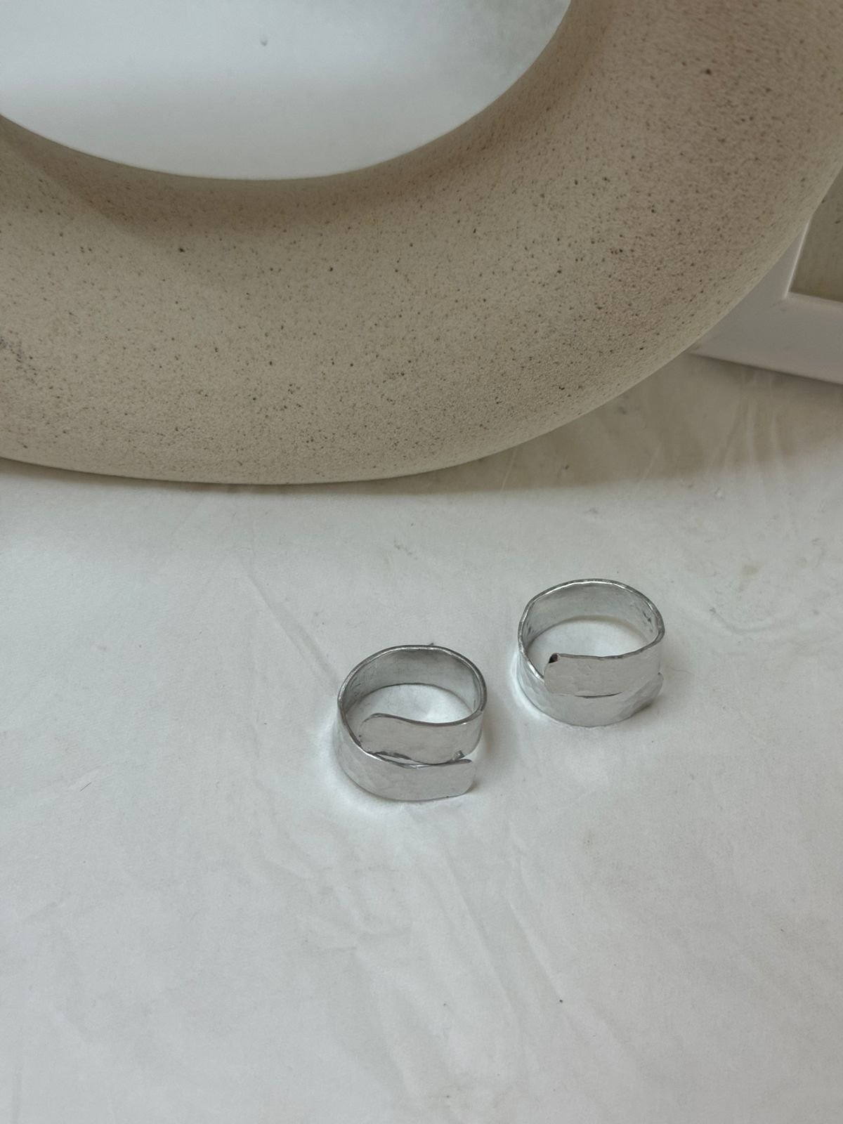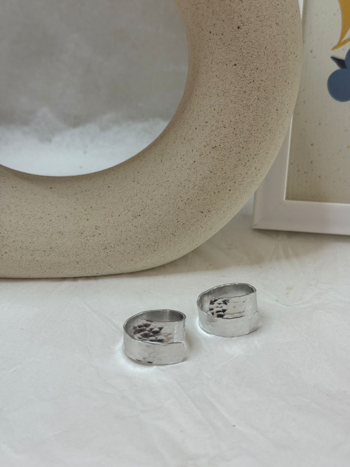 Η σφυρηλατημένη υφή τους χαρίζει αυθεντικό χαρακτήρα, ενώ ο σχεδιασμός τους τα φέρνει να αγκαλιάζονται απαλά, δημιουργώντας ένα σύμβολο σύνδεσης και ισορροπίας. Φοριούνται μαζί σαν ένα ενιαίο κόσμημα ή ξεχωριστά, εκφράζοντας τη δύναμη της απλότητας και της χειροποίητης κομψότητας.