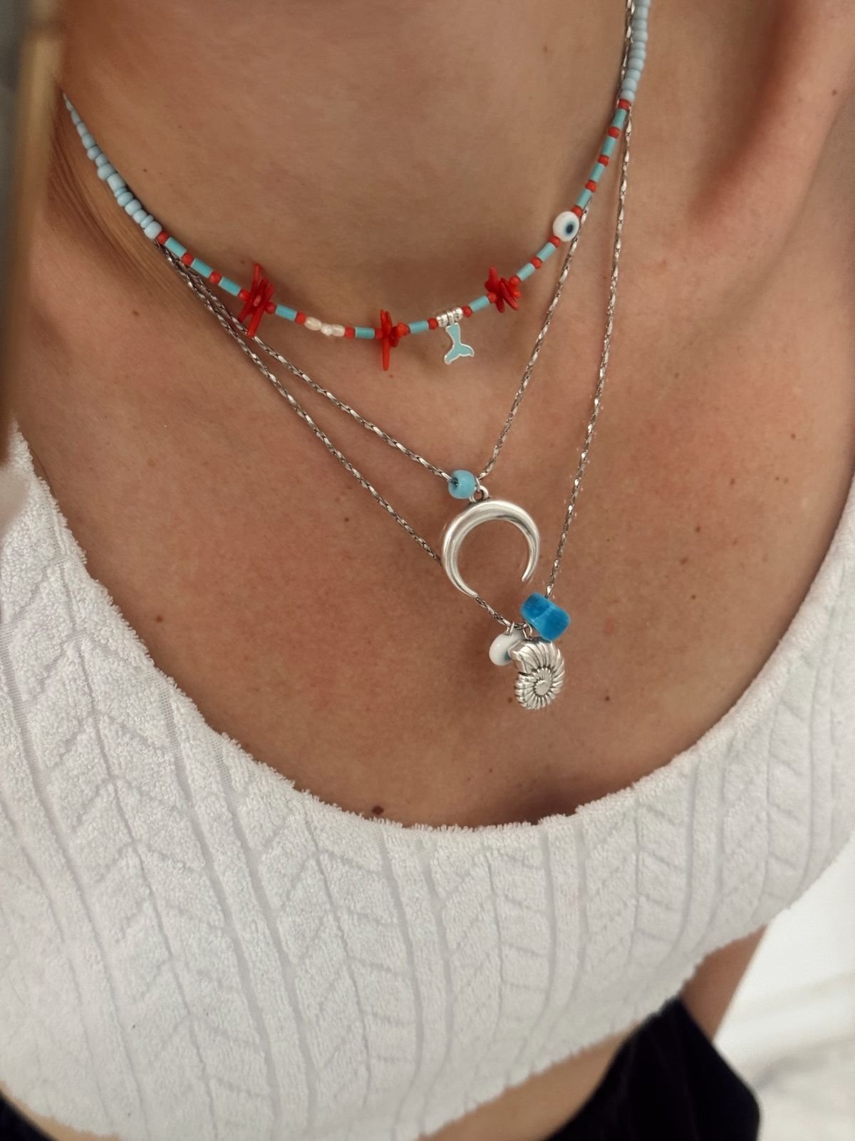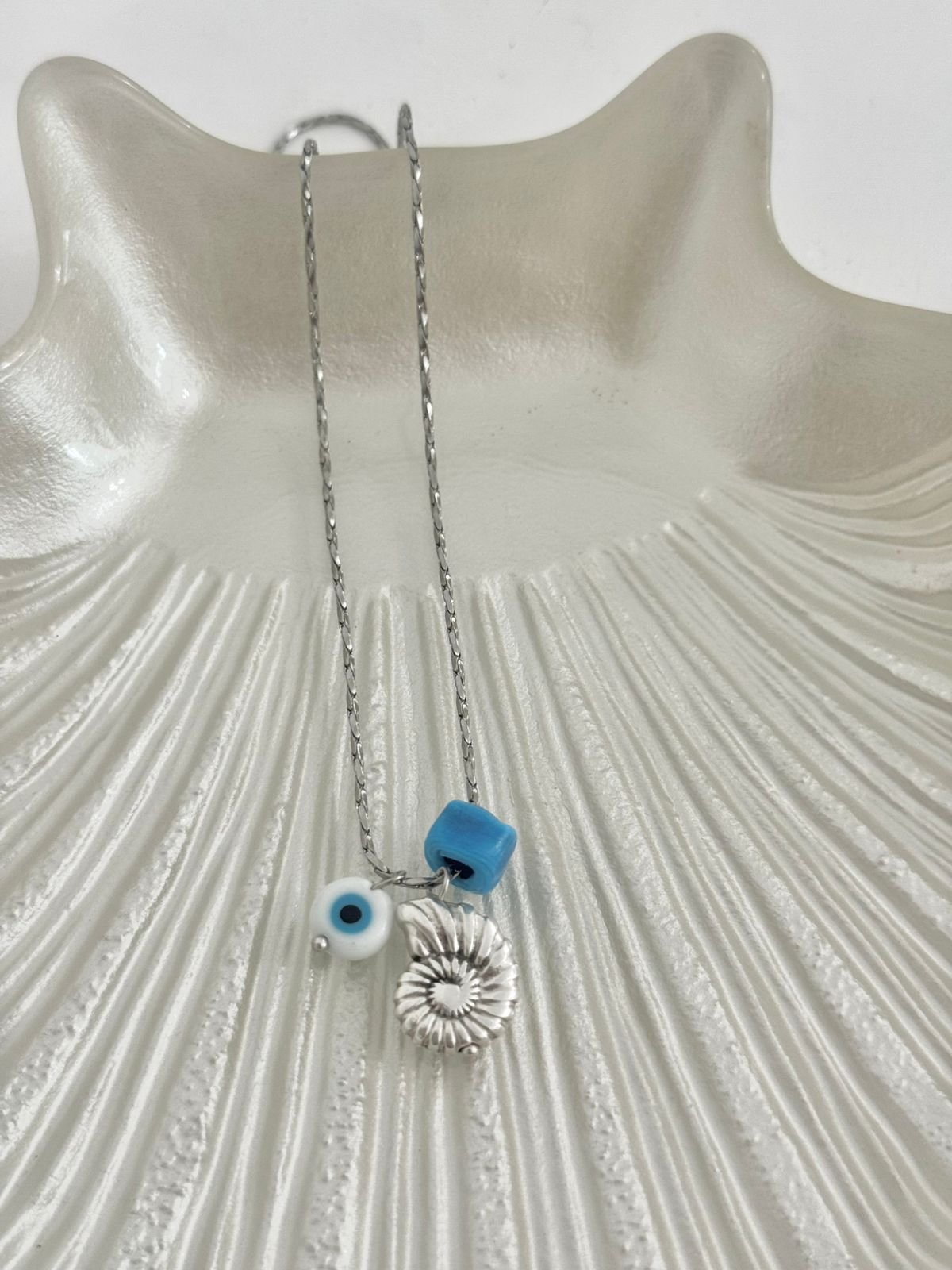 Κολιέ με ατσάλινη αλυσίδα, ορείχαλκινο επαργυρωμένο στοιχείο και γυάλινη χάντρα.